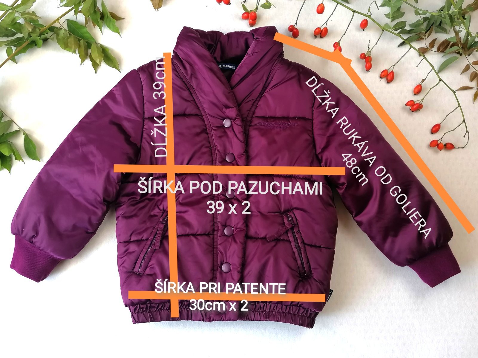 Krásna saténová bundička v sýto fialovej farbe, zo šálovým golierom a skrytou kapucňou v ňom.Kapucňa je z vnútornej strany pogumovaná,čiže nepremokavá.V prípade,že ju nieje treba,prakticky sa skryje do kapsy goliera a zazipsuje.Rukávy sú ukončené úpletovým patentom.Vrecká na prednom diely zo zipsami.