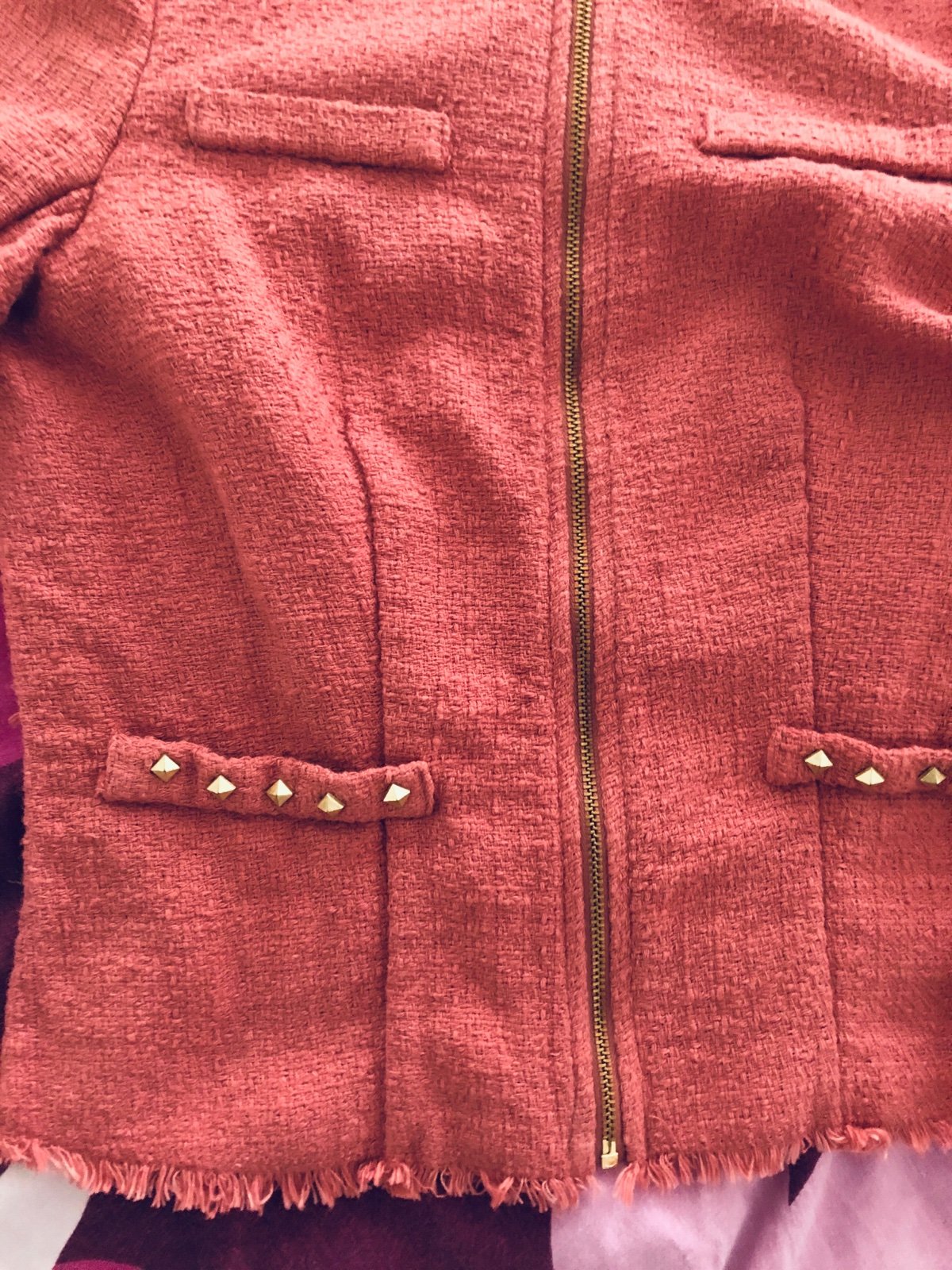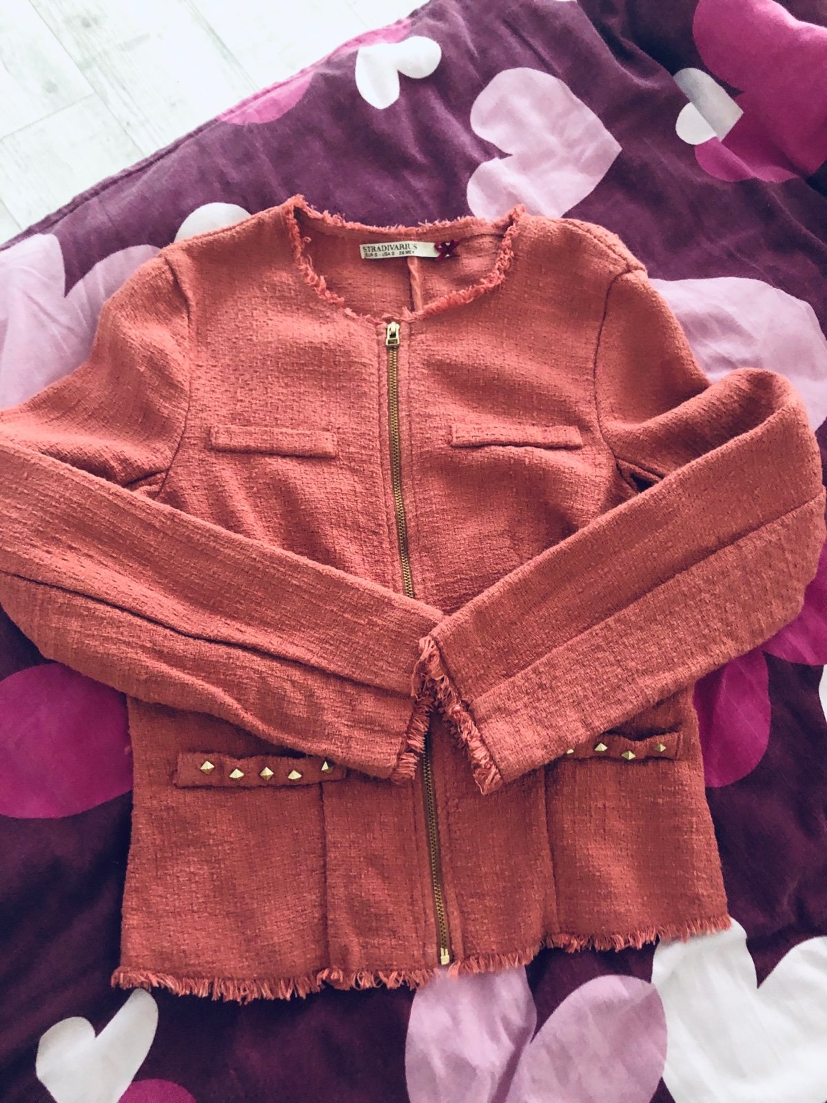 Super stav, super kabátik/ bundička, bez podšívky. Dlžka 49cm, šírka cez prsia 41x2, rukáv 59cm. Farba svetlá korálová alebo ružová. ZNAČKA: STRADIVARIUS