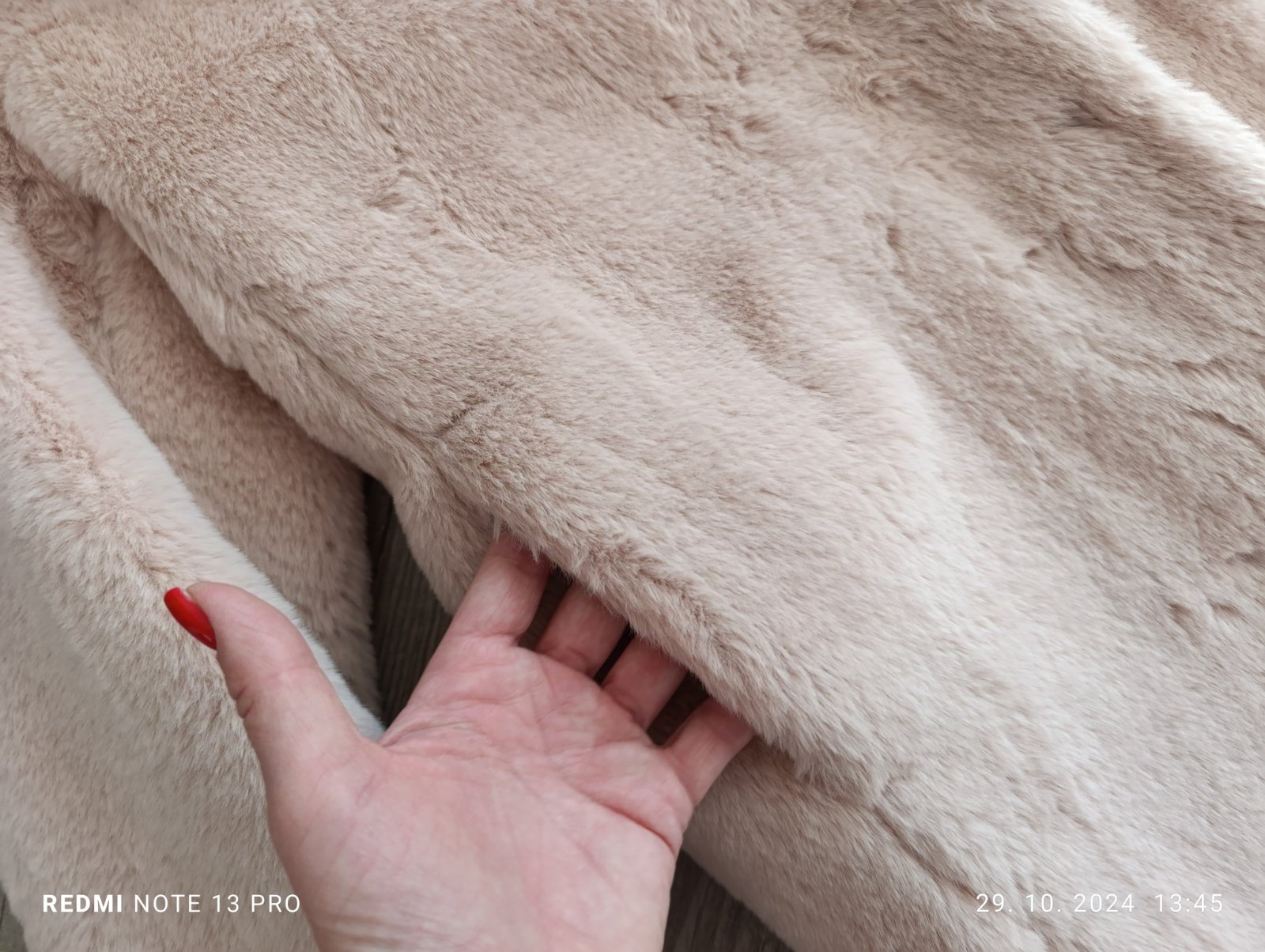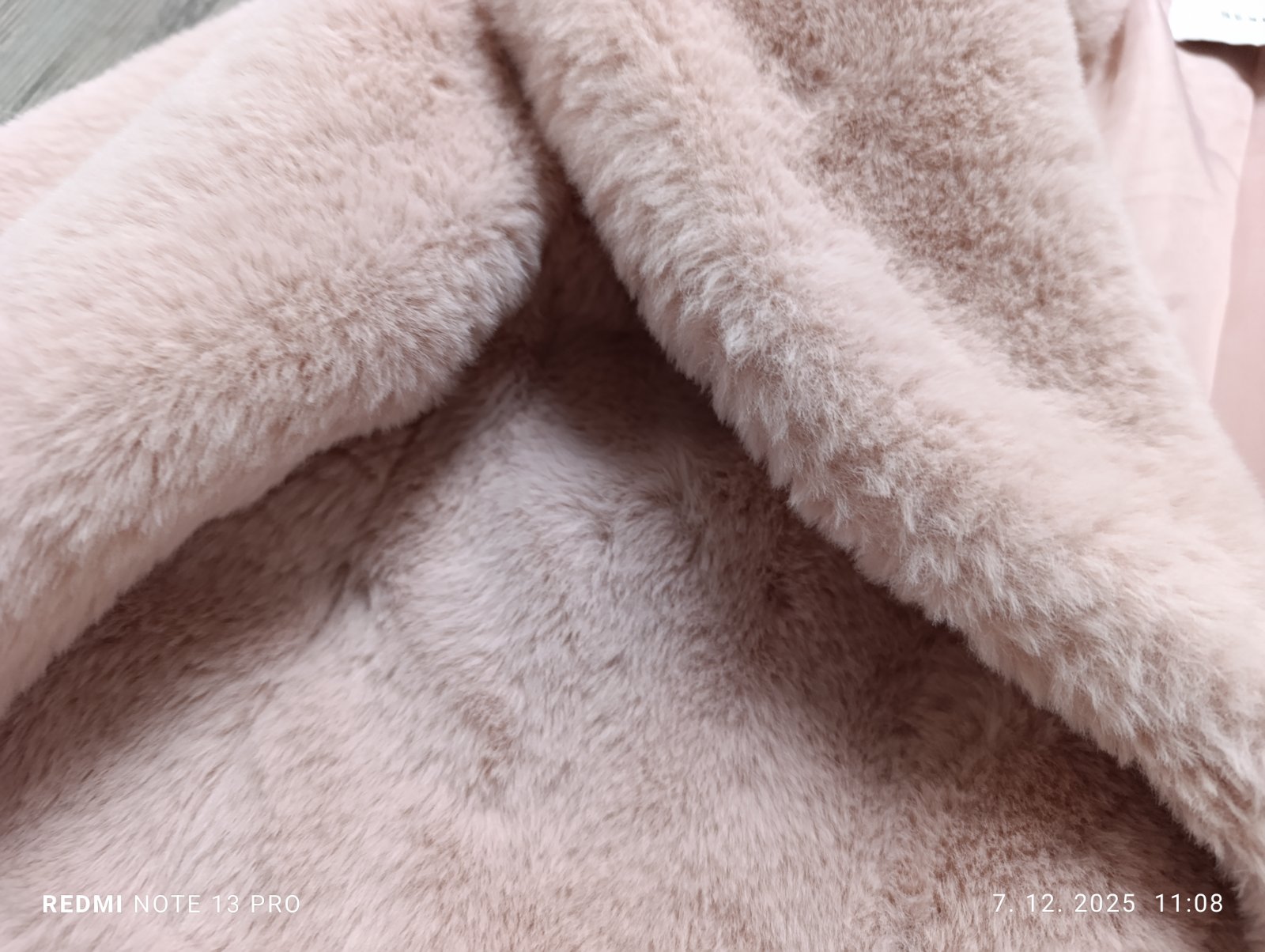 Veľmi pekný, tepľučký. Rozmery: celková dĺžka 90 cm, šírka cez prsia 53 cm, dľžka rukávu od krku 74cm.