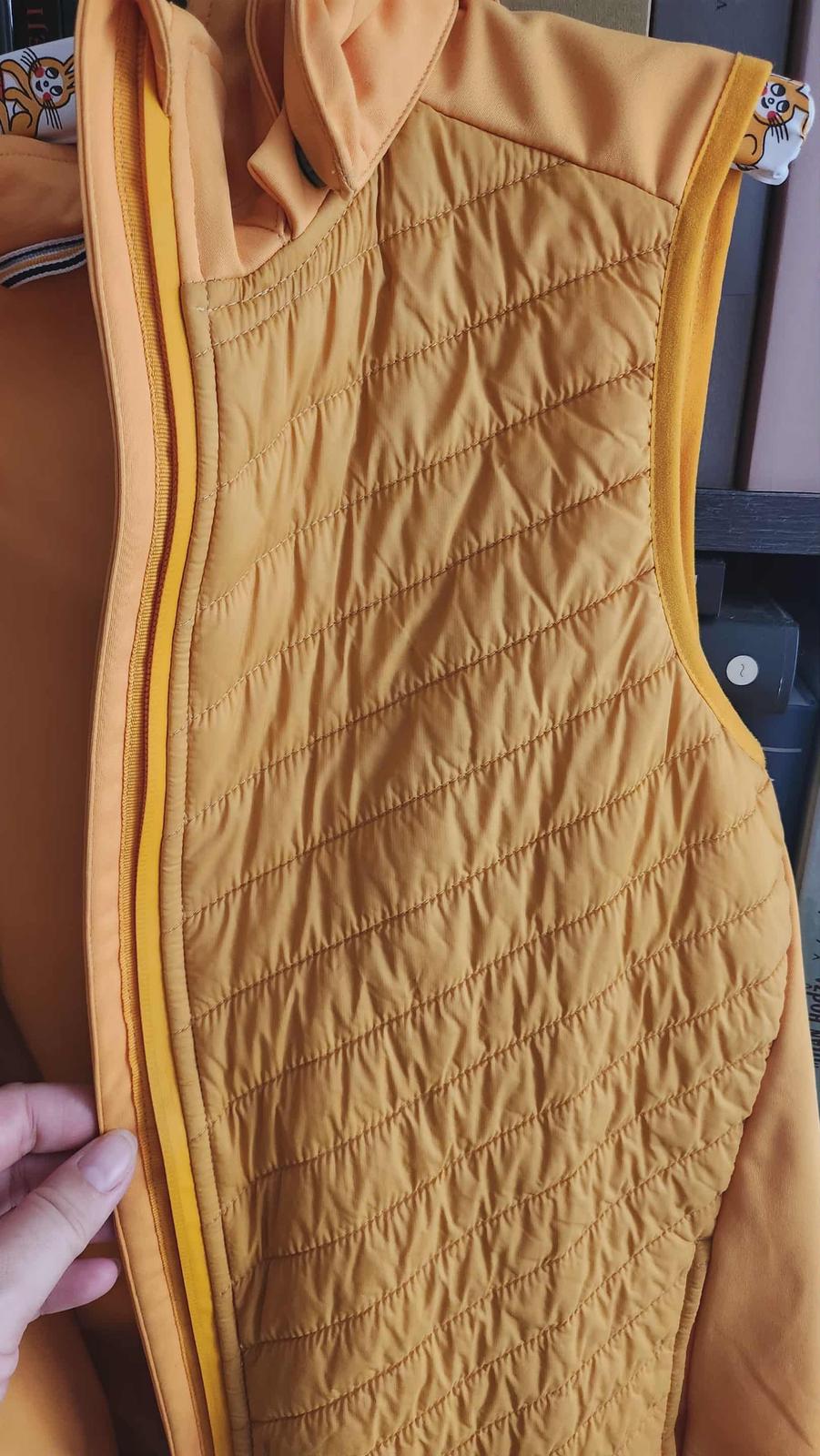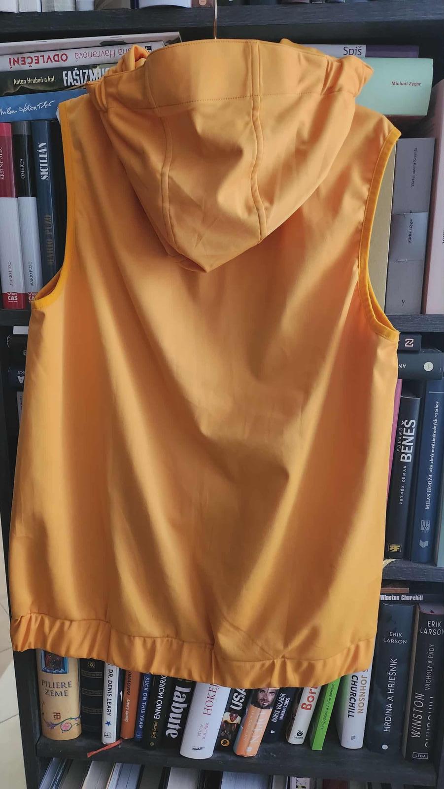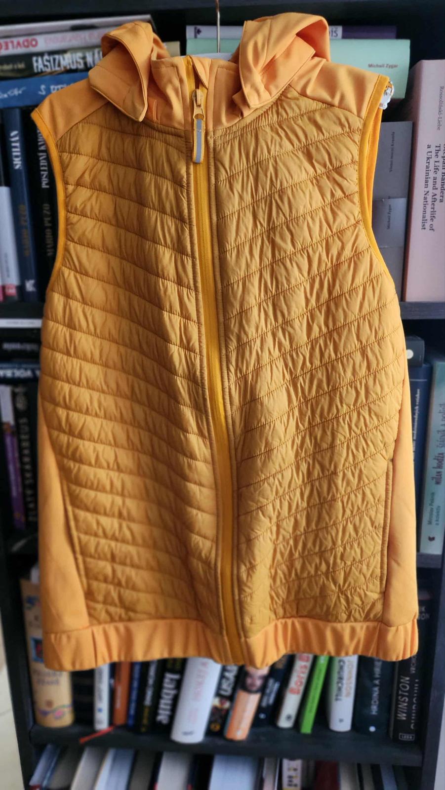 Tenšia vetruvzdorná, vodoodpudivá a priedušná vesta. Výraznej horčicovožltej farby. Kombinácia vetruvzdorného softshellového materiálu a vatovania na prednom diele, ktoré optimálne udržiava teplo. Predný zips s ochranou brady a odnímateľná kapucňa. Len vyskúšaná. Prakticky je nová. Písaná veľ. 170/176, sedí od 14 rokov.