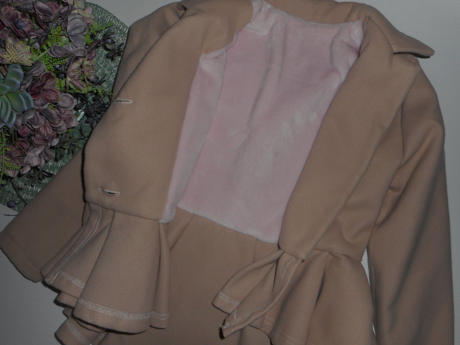 Kabátik je z príjemnej kabátoviny, ktorý je v hrudnej časti podšitý vrstvou hebučkej podšívky. Zapína sa na tri praktické gombíky. Kabátik je strihaný do pása tak, aby jemne tvaroval dievčenský driek. Spodná časť kabátu je však strihaná do kruhu, a vkusne riasená, čím vytvára elegantný frakový model.