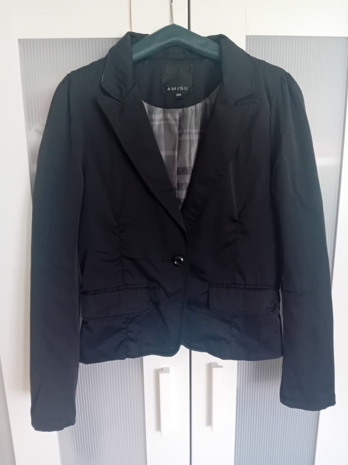 čierne kratsie sako , vda vrecká, zapínanie na dva gombíky...