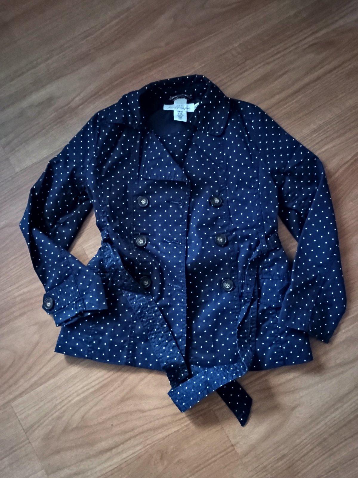 Nádherný bodkovaný tmavomodrý prechodný kabátik, dĺžka rukáva od krku 58 cm, šírka 2x38 cm, dĺžka 53 cm