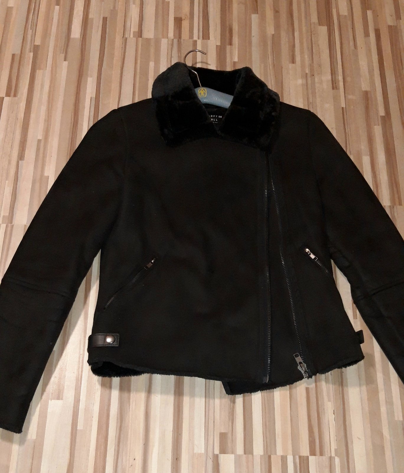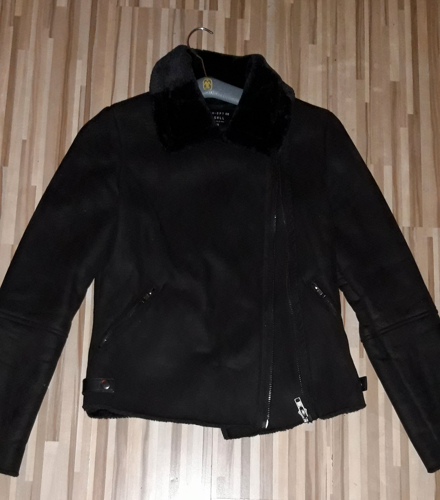 Kozuscek do pasa cierny velkost XS ,dlhy je 58cm ,rukav od ramena 63 cm a cez prsia 46x2 ,je velmi teplucky bez poskodenia