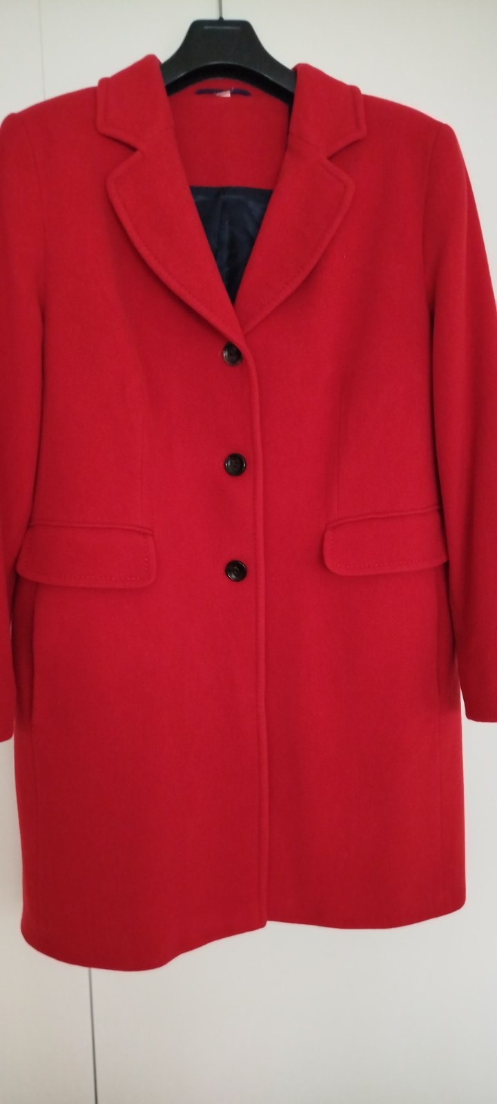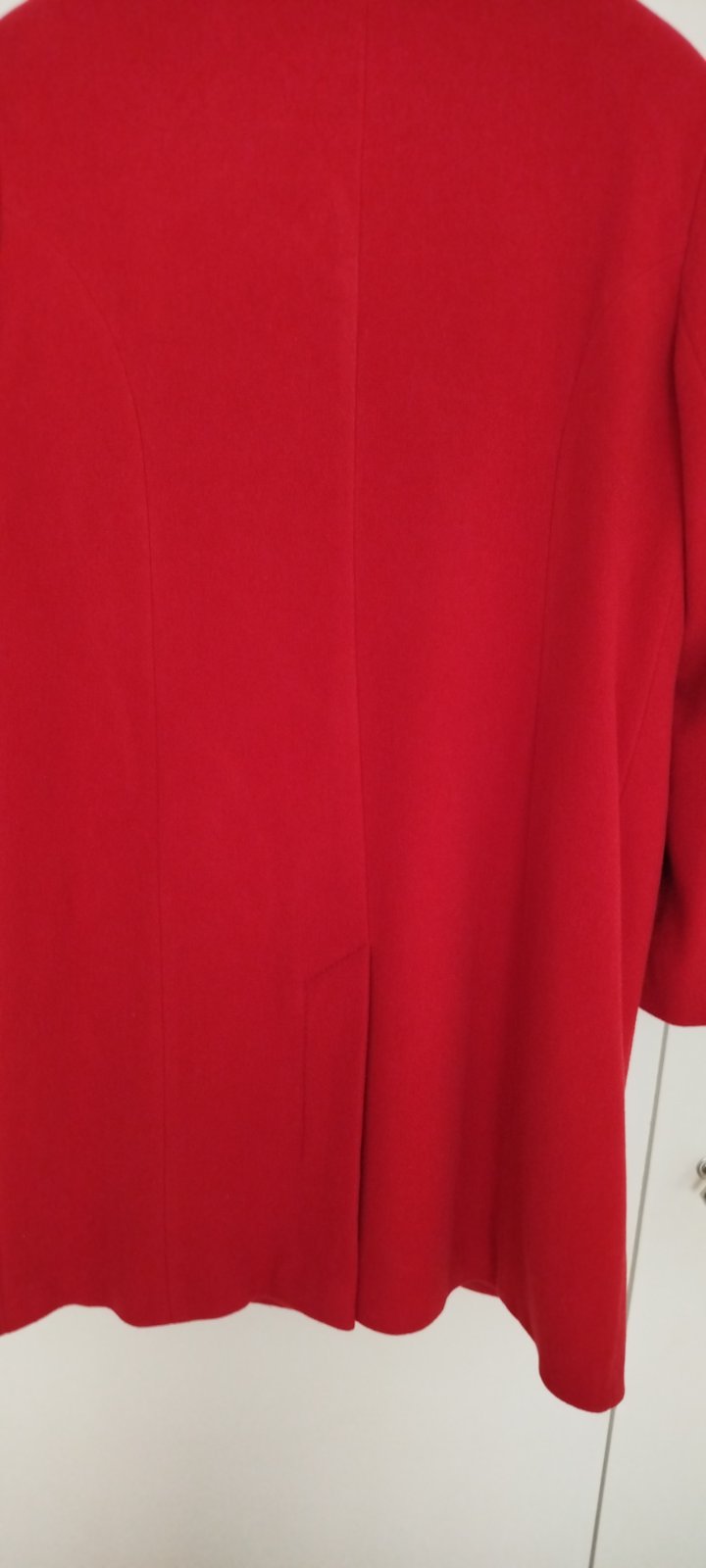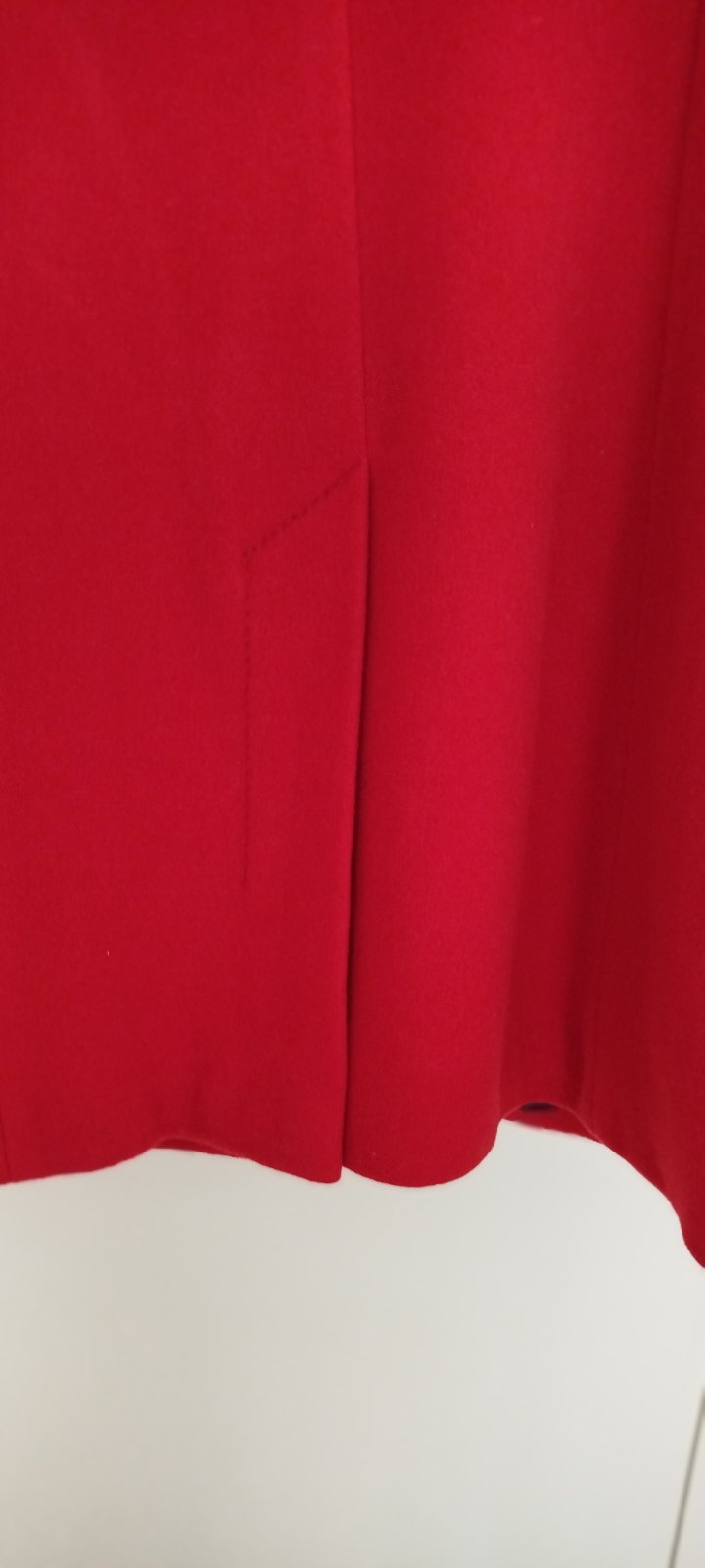 Kvalitný elegantný červený kabát s odopínateľnou kožušinou v perfektnom stave. Zn. BIANKA, zloženie : 45% vlna + 40% polyester + 15% kašmír. Cez prsia má 2 x 52 cm, dĺžka je 99 cm. Na rukávoch a vr...