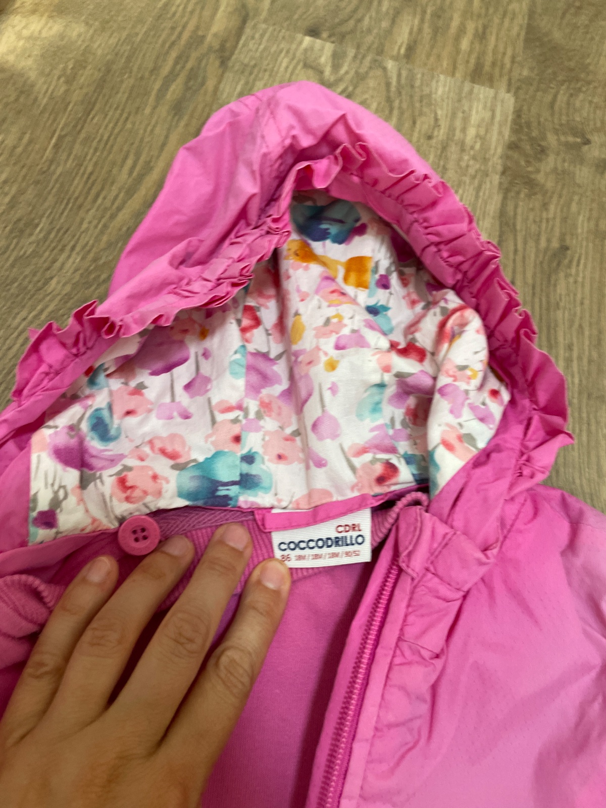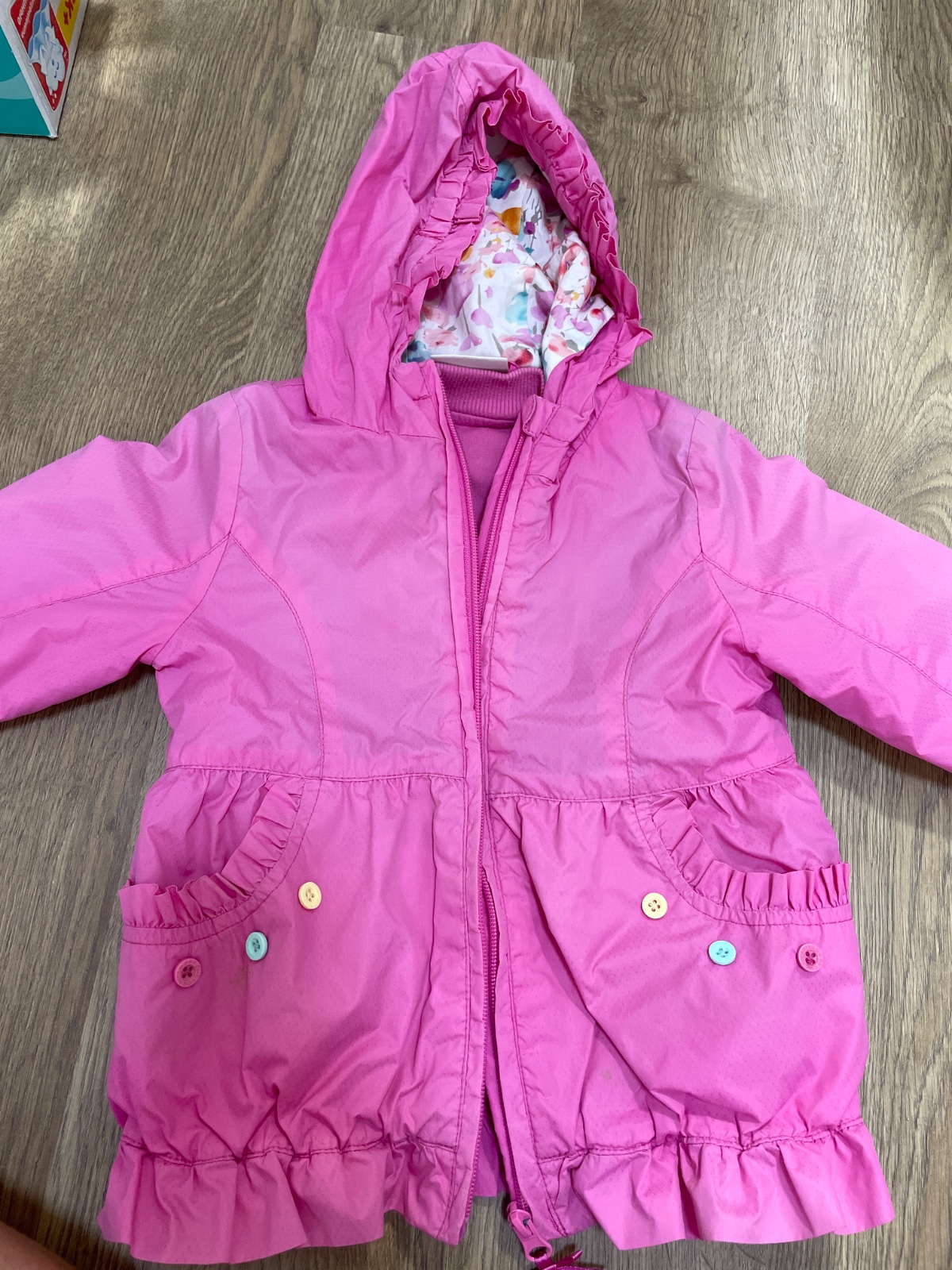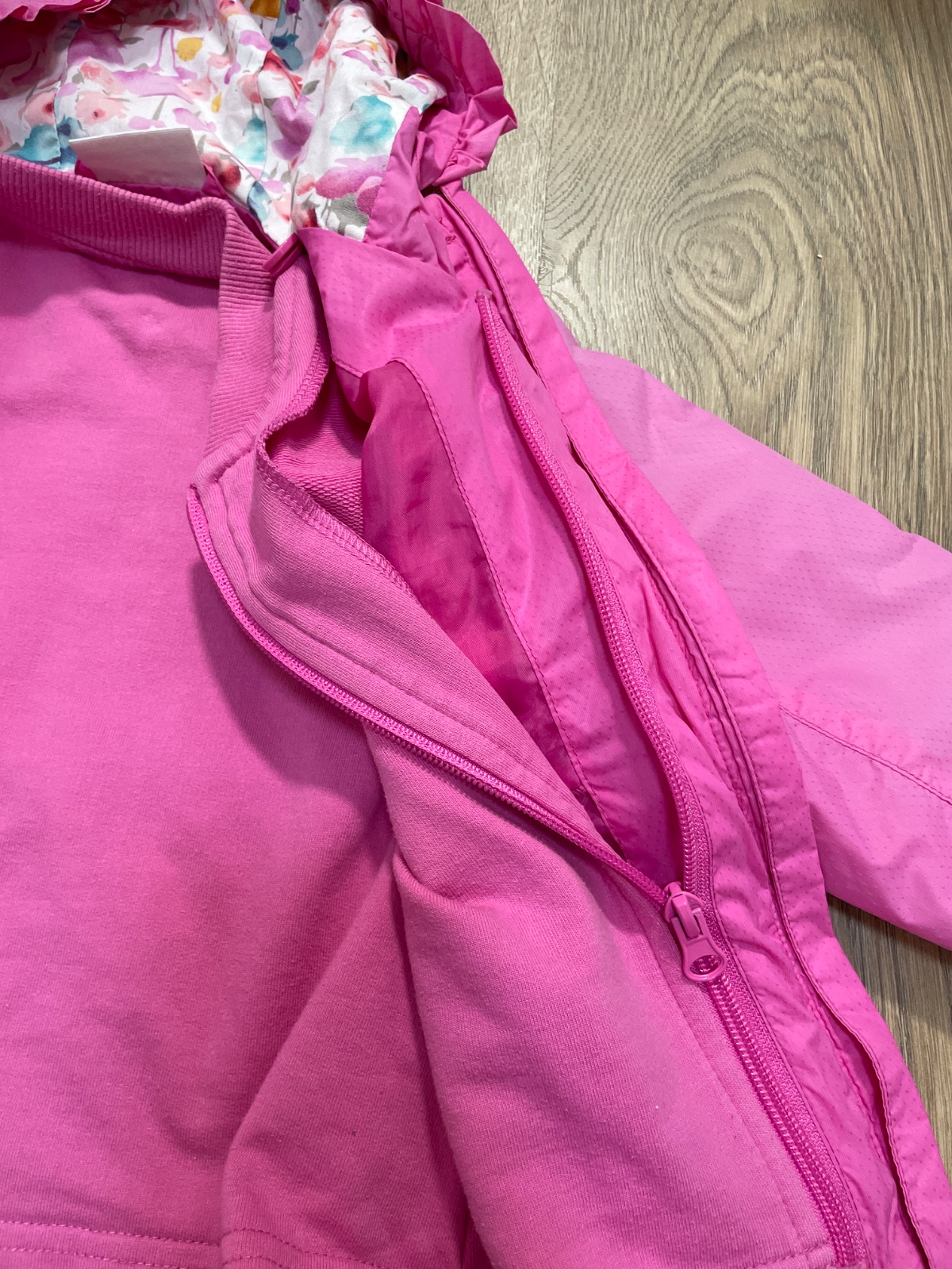 Prechodna bundicka na zips, s kapucnou. Vnutri je mikinka ktora sa da odzipsovat a tak moze byt bunda viac alebo menej zateplena… noseny stav