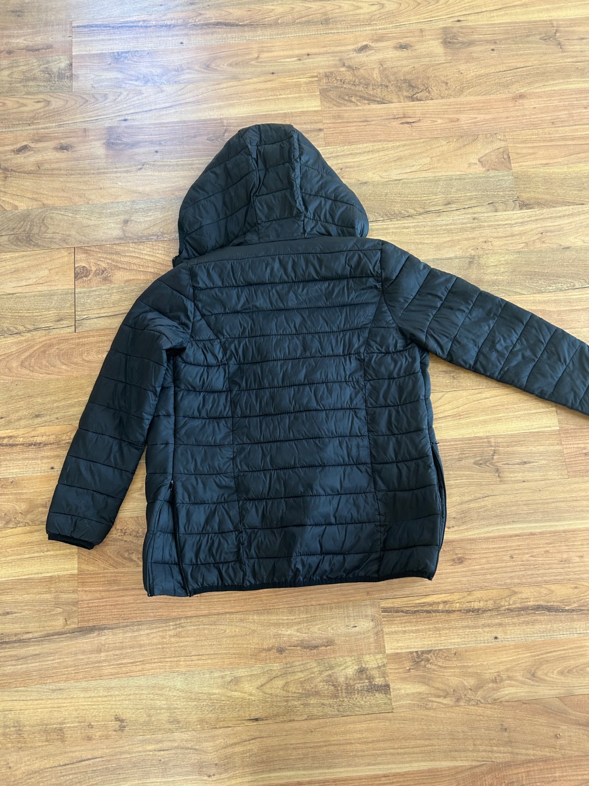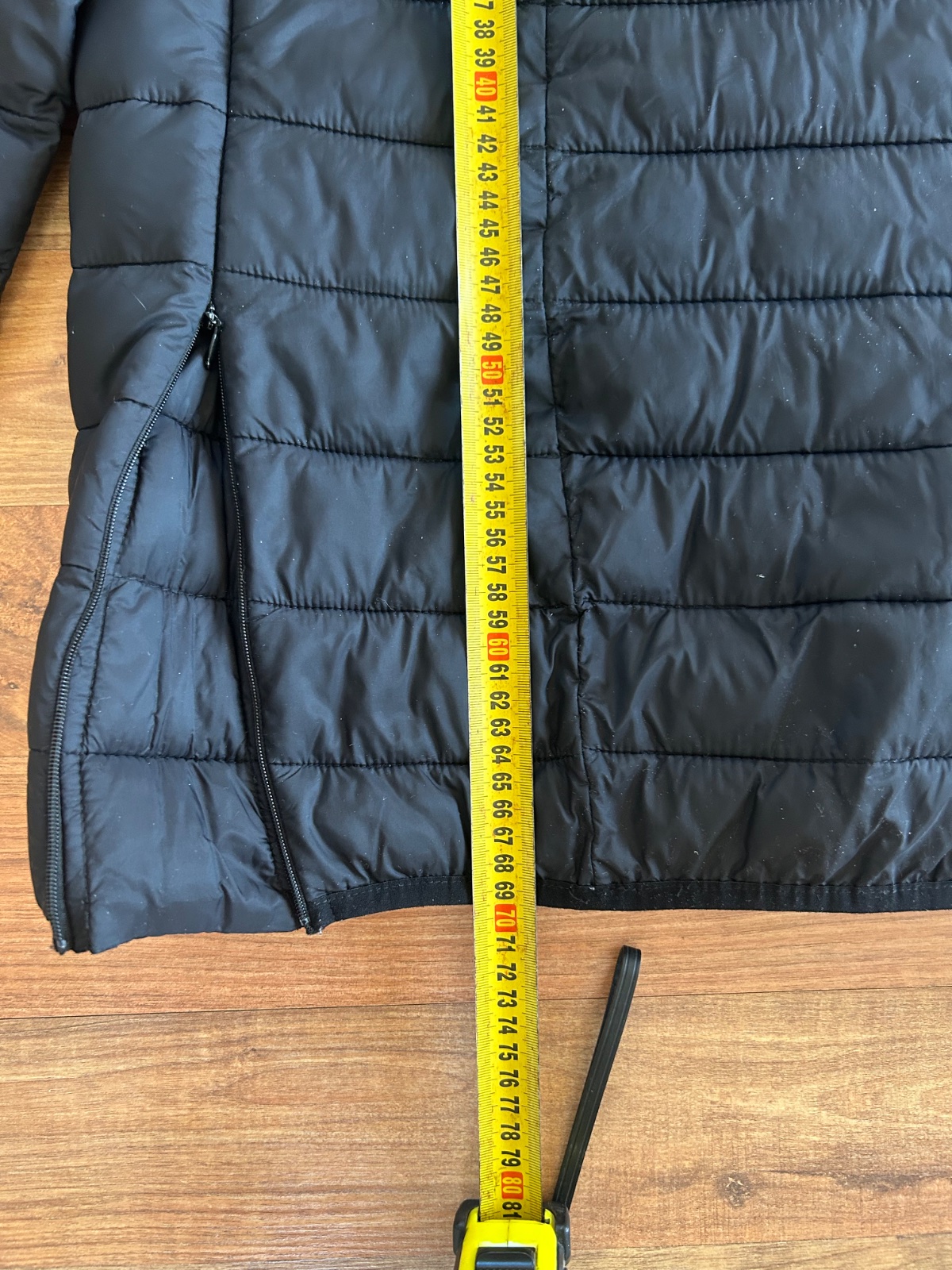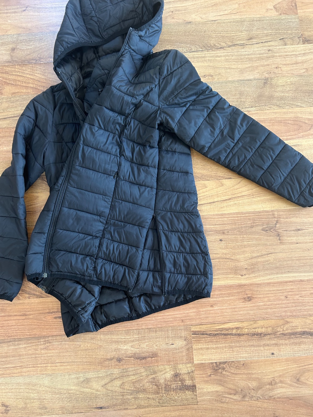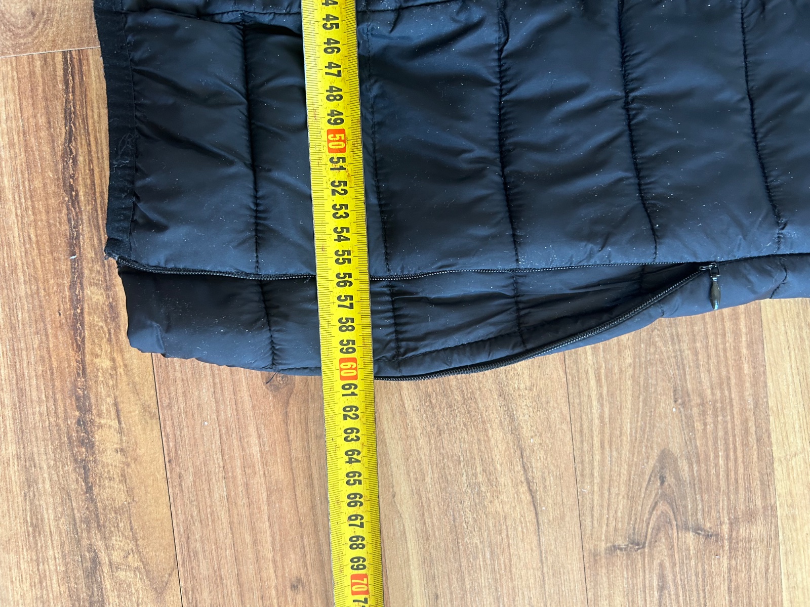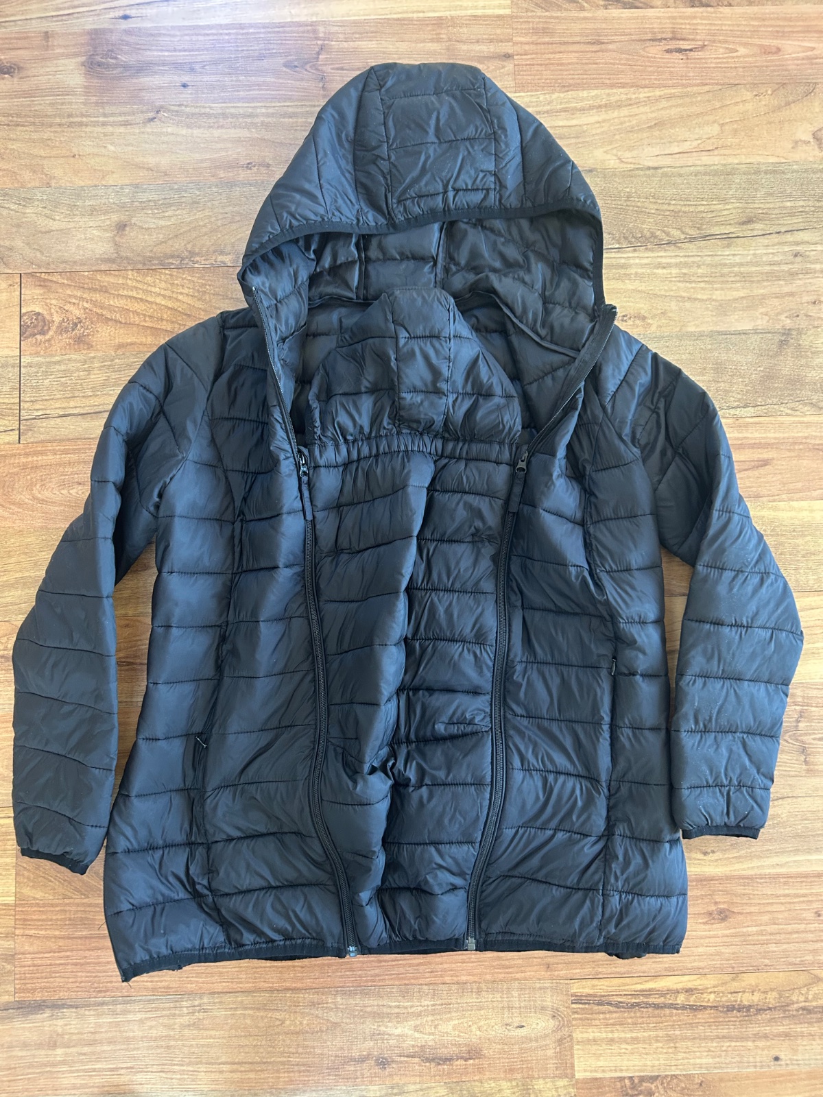 Čierna tenšia prechodná bunda - na boku sa dá rozopnúť, vhodná aj ako tehotenská, so vsadkou na nosenie bábätka. Nosená bez poškodenia.