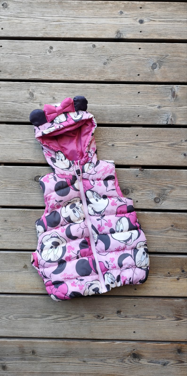 Zateplená vesta s motívmi macka pooh a tigra. Vonkajšia časť čosi ako šuštiakovina, vnútro flísové. Celk. dĺžka 42cm. Odporúčam!
