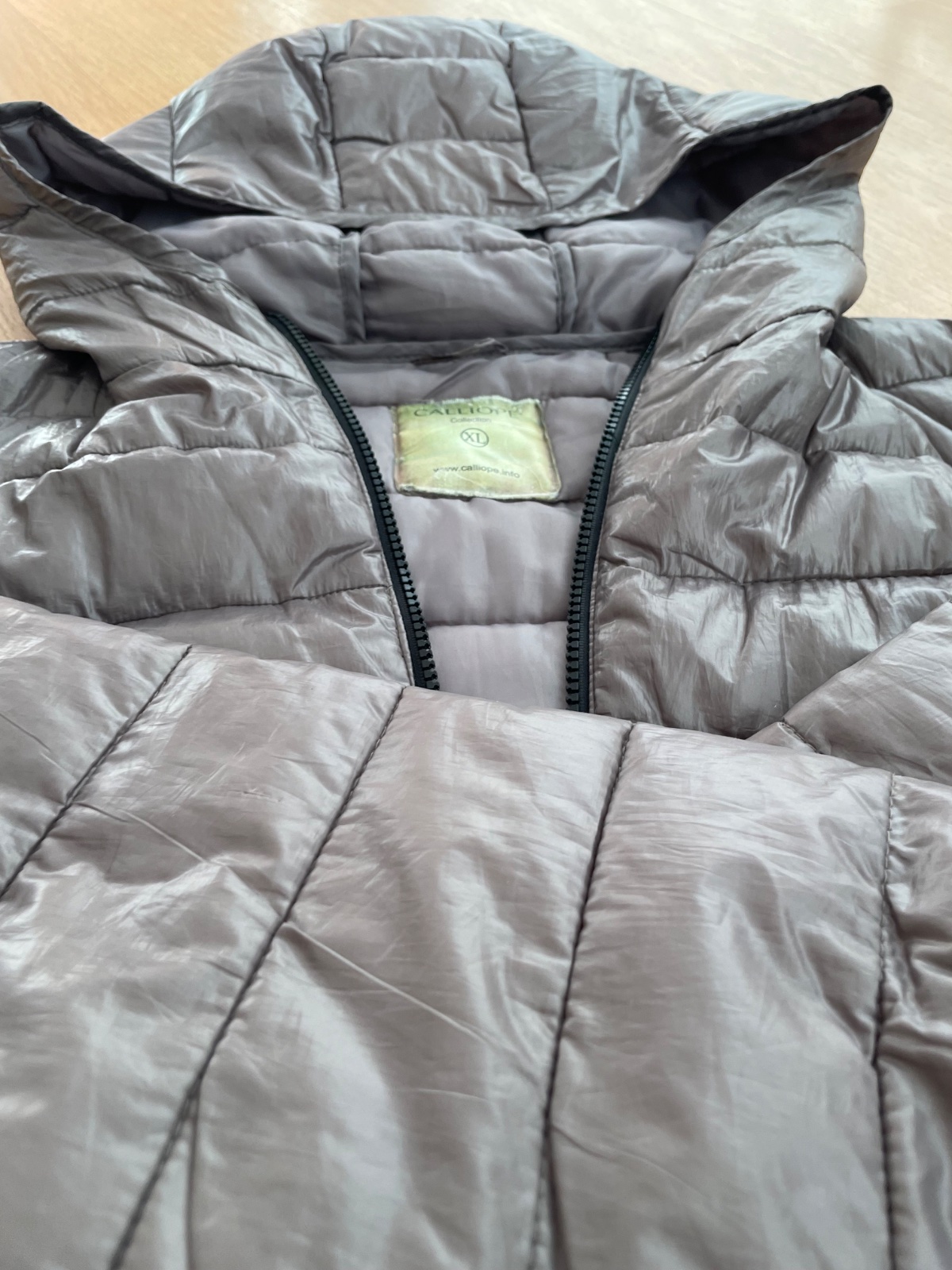 Bunda Magnet v. 40/42, farba šampanská, saténový lesk, štepovanie, vo forme diamantu, rukáv ukončený širokým lemom, v páse jemne zúžená, vpredu 2 vrecká, dvojitá lišta, zapínanie na zips + cvoky....