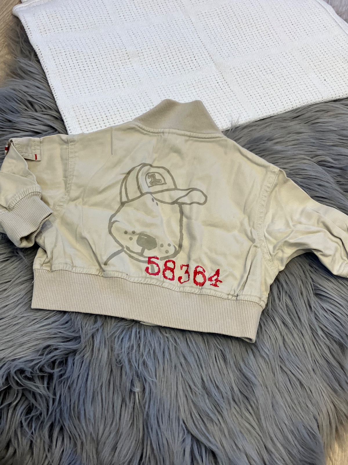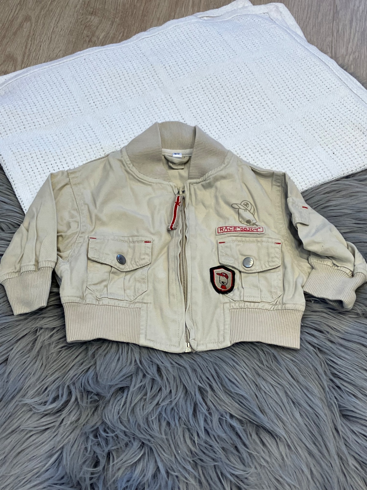 Chlapčenský kabát, zapínanie na zips, dve predné vrecká na cvoky, na spodku je elastický gumička, nie je elastický, materiál 100% bavlna.