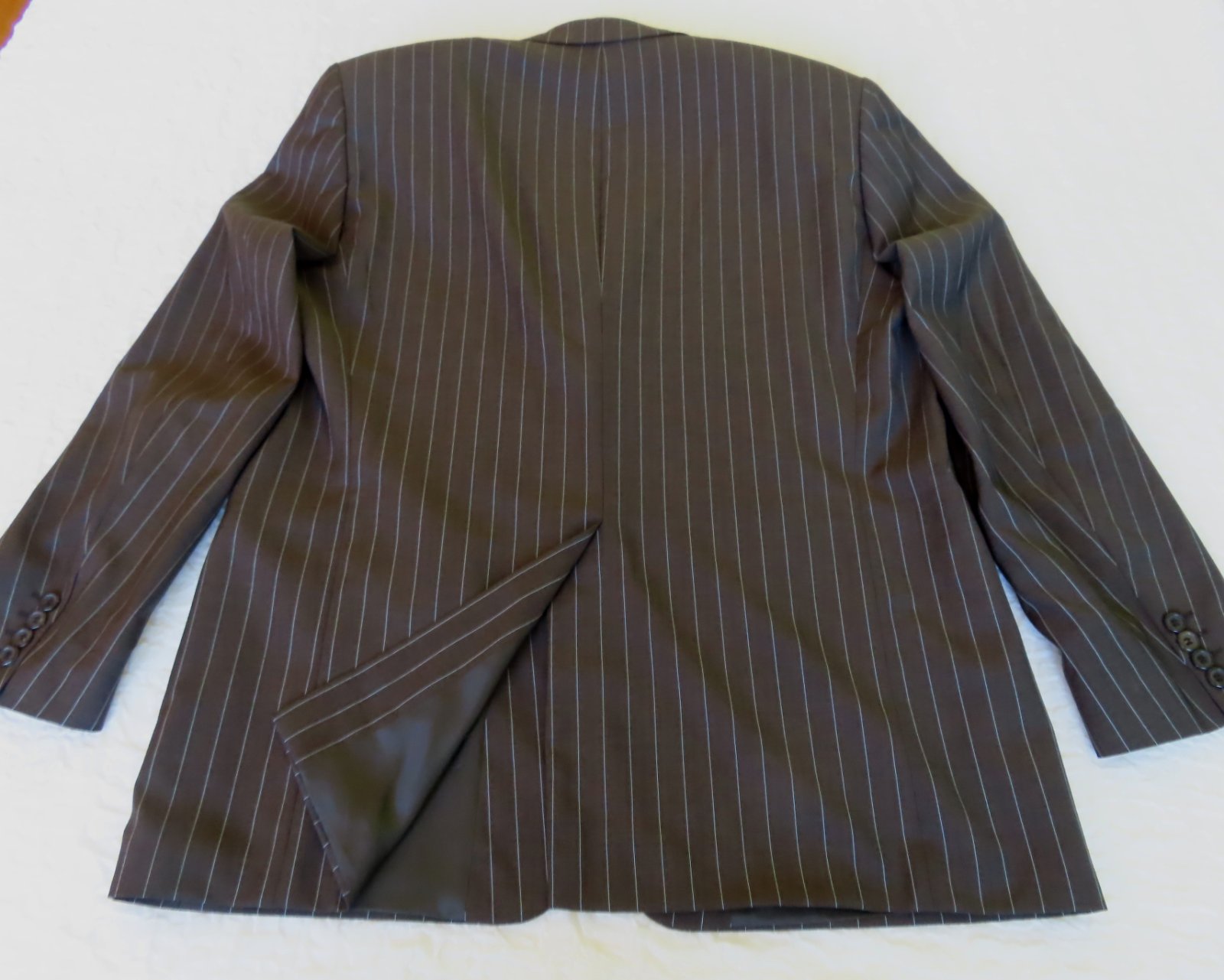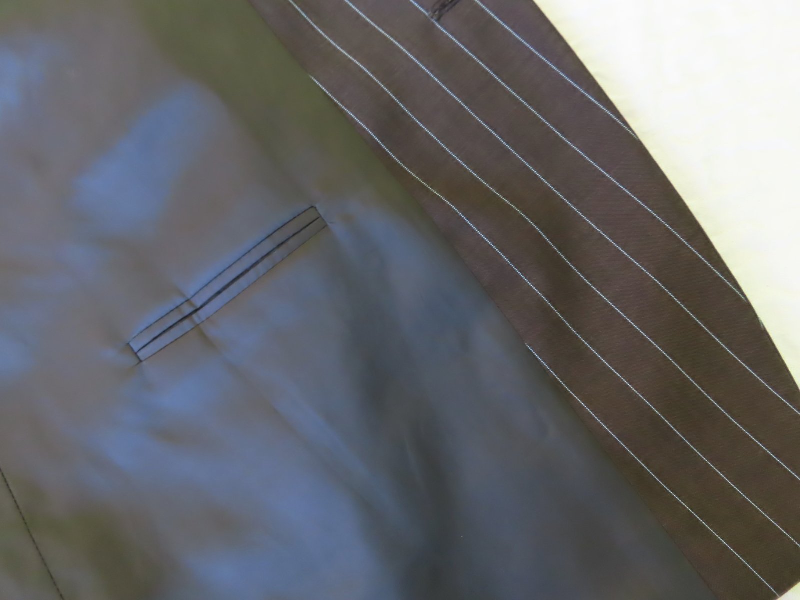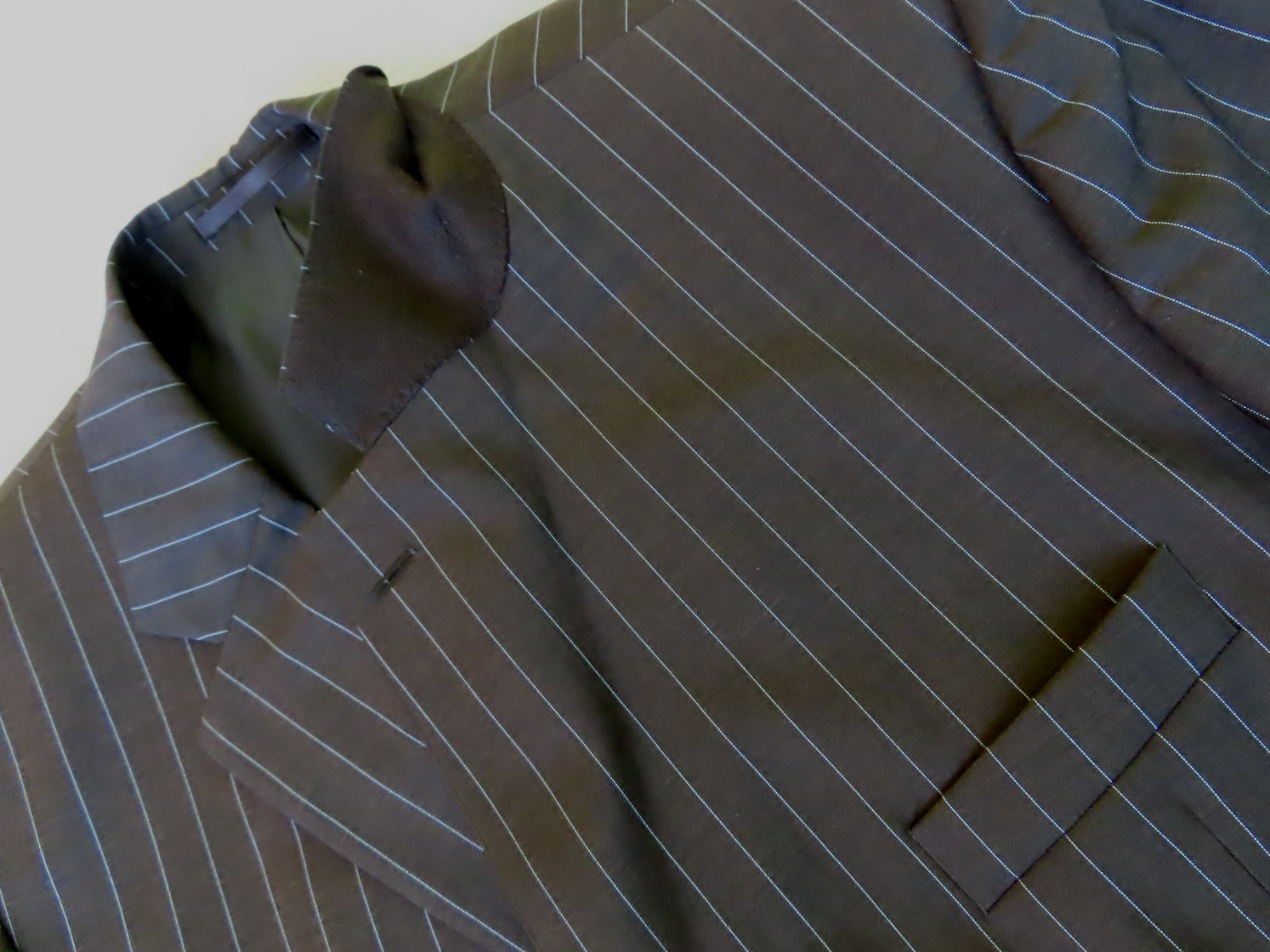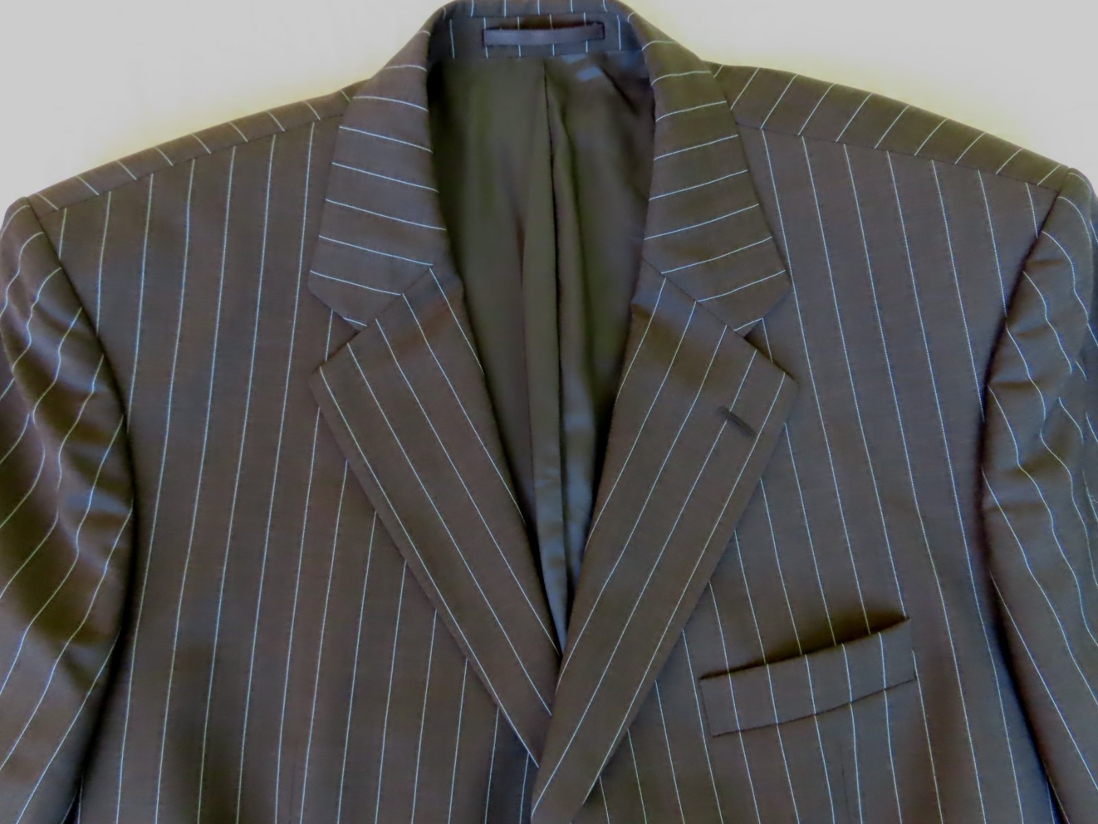 Sako je hnedé s jemným prúžkom, luxusne vypracované.