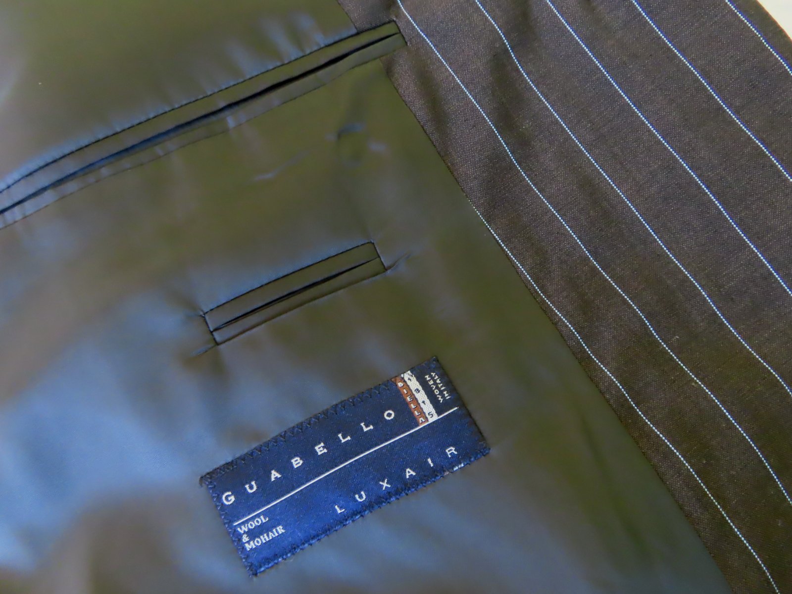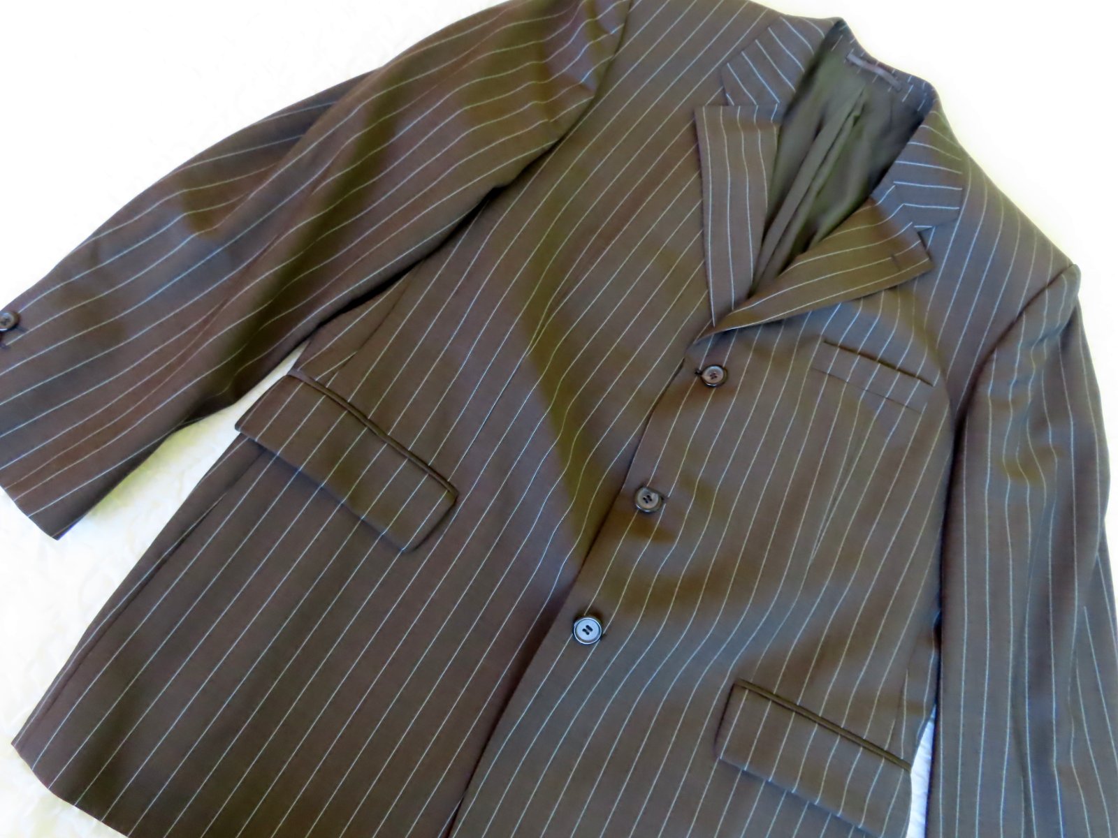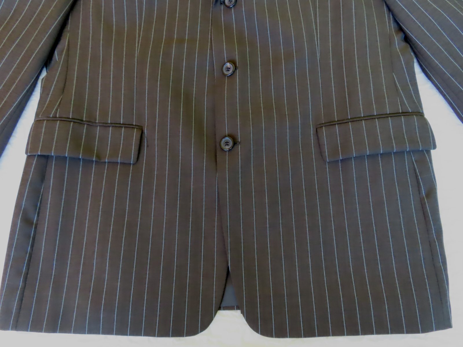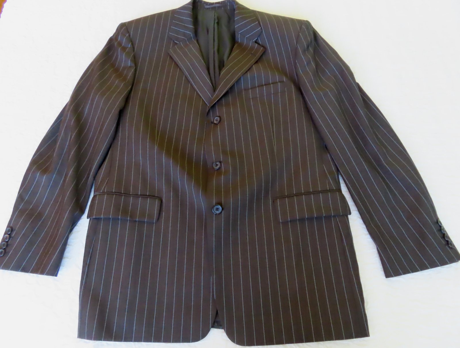 Sako je hnedé s jemným prúžkom, luxusne vypracované.