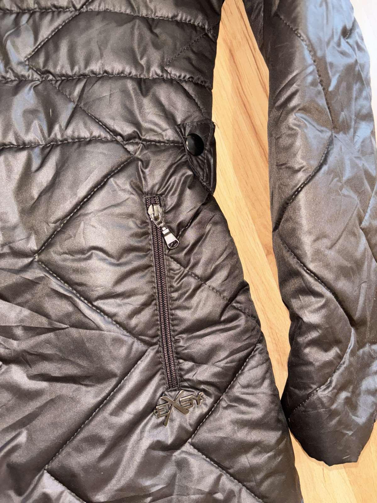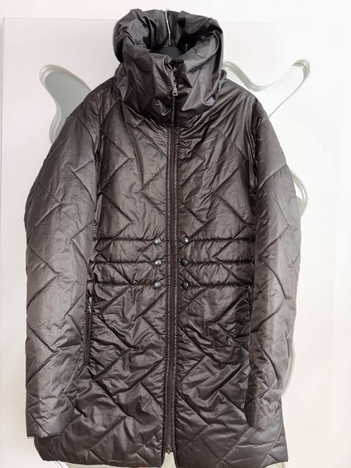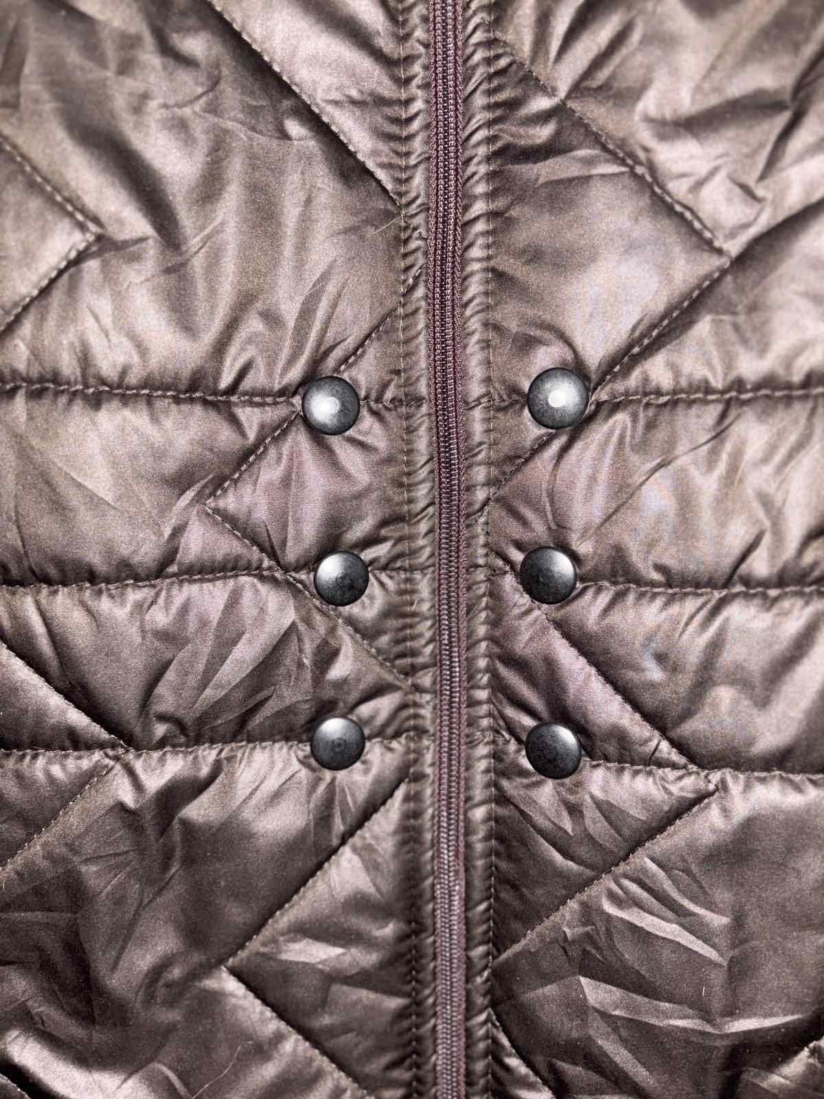 Výborný stav, slabšie vatovana, vhodná skôr na prechod, čokoládovo hnedá, sedí na L/XL, šírka pod pazuchami 57 cm, dĺžka 87 cm