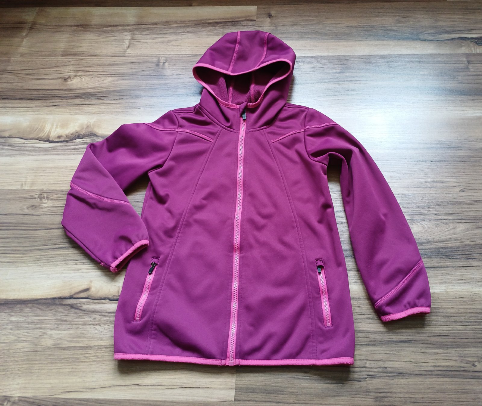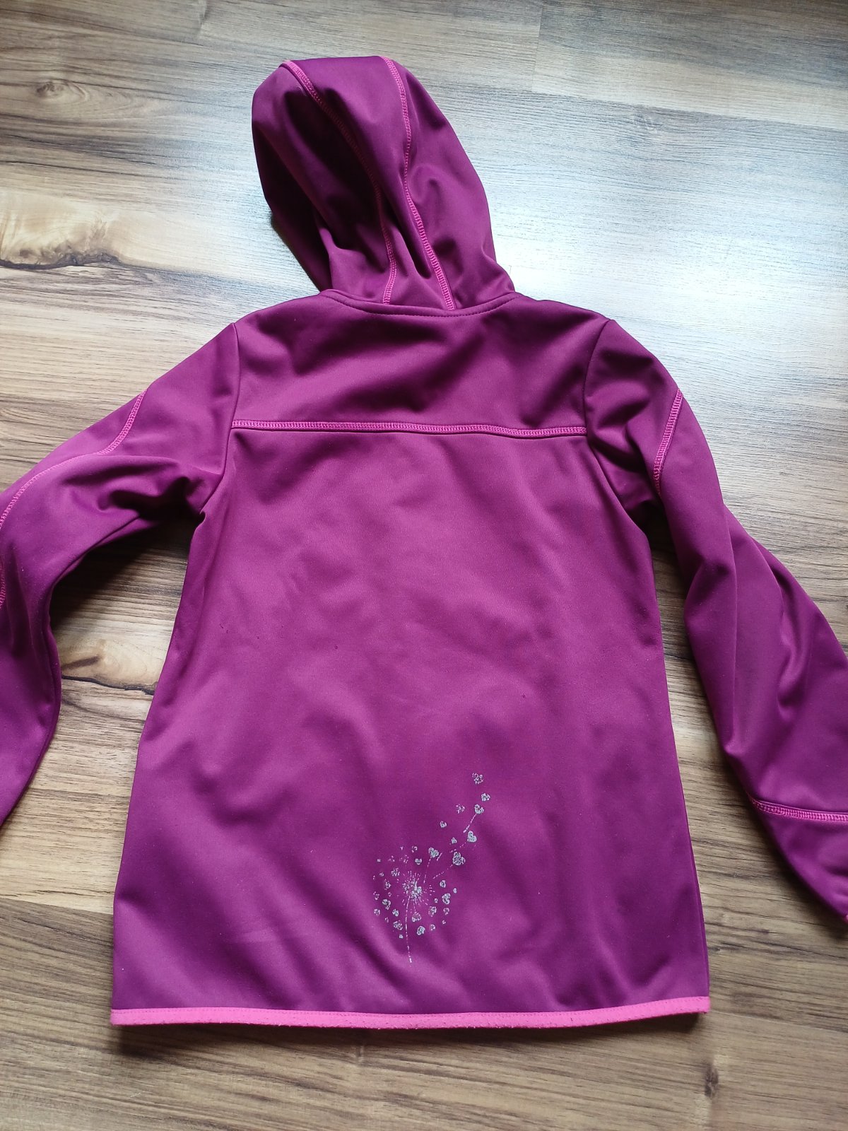 Softshellová bunda podšitá flísom, dobrý nosený stav, určite ešte využiteľné, reflexné prvky, 2x vrecko na zips, celková dĺžka 58 cm, šírka pod pazuchami 2 x 41 cm, rukáv od pleca 51 cm, fialovo-vínová farba.