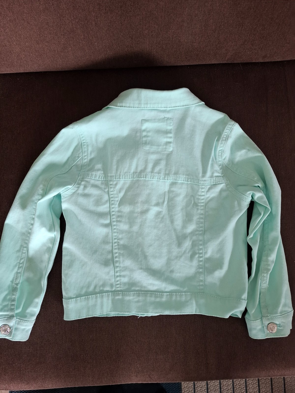 Prechodná jarná bunda v bledej mint farbe. Bunda je na zips, dve vrecká na kombík a ešte dve vrecká, ktoré sú falošné. Kapucňa je odnímateľná, na cvoky, a má gumičku na stiahnutie v páse. V top stave.