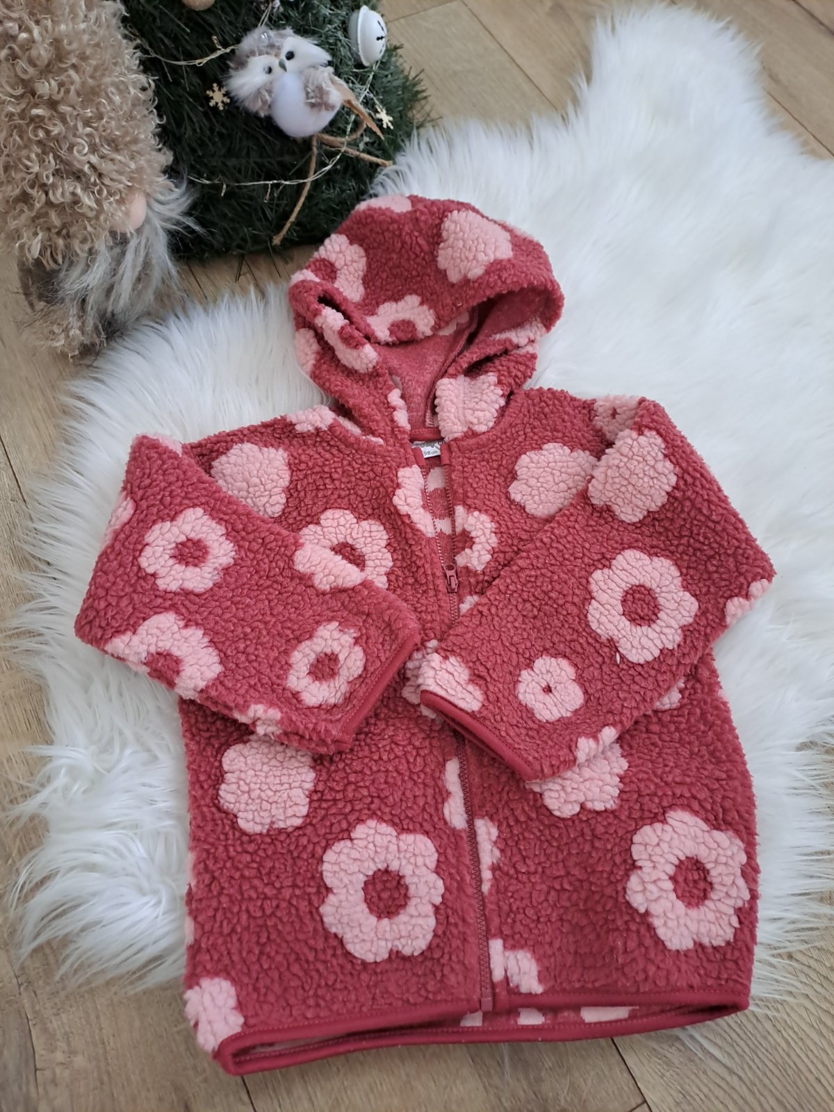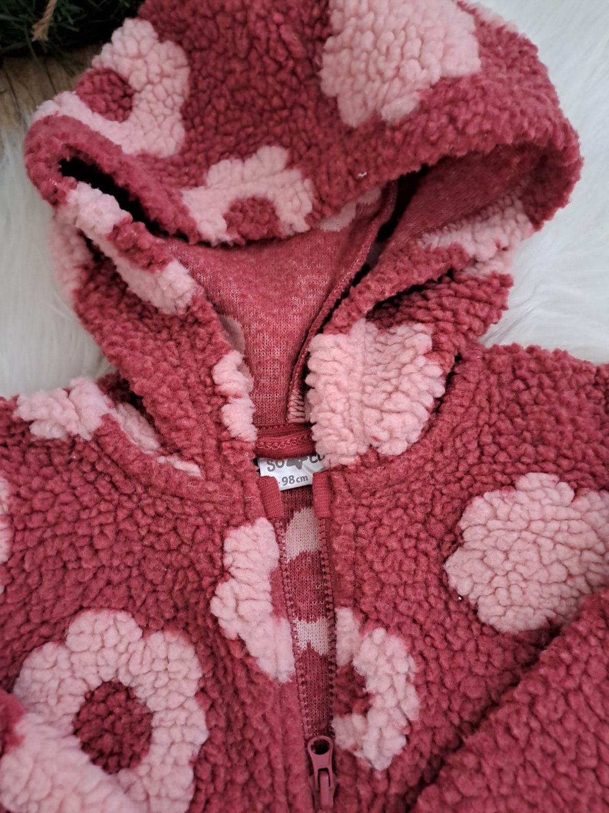 Nosený stav Zateplená, aj kapucňa, aj rukávy Veľkosť 98 Vpredu trošku natrhnutá Na rukáve sa pri praní vytiahla nitka z látky Pri pravom vrecku malá škvrna