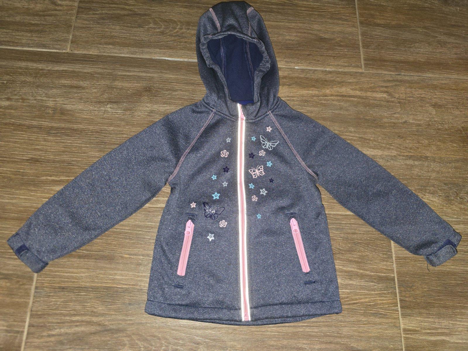 Dievčenská prechodná bundička, veľkosť 98 - 104, pogumovaný materiál odolný proti vode. V bezchybnom stave. Vo vnútri flis. Dĺžka bundy 47 cm, šírka 33 cm.