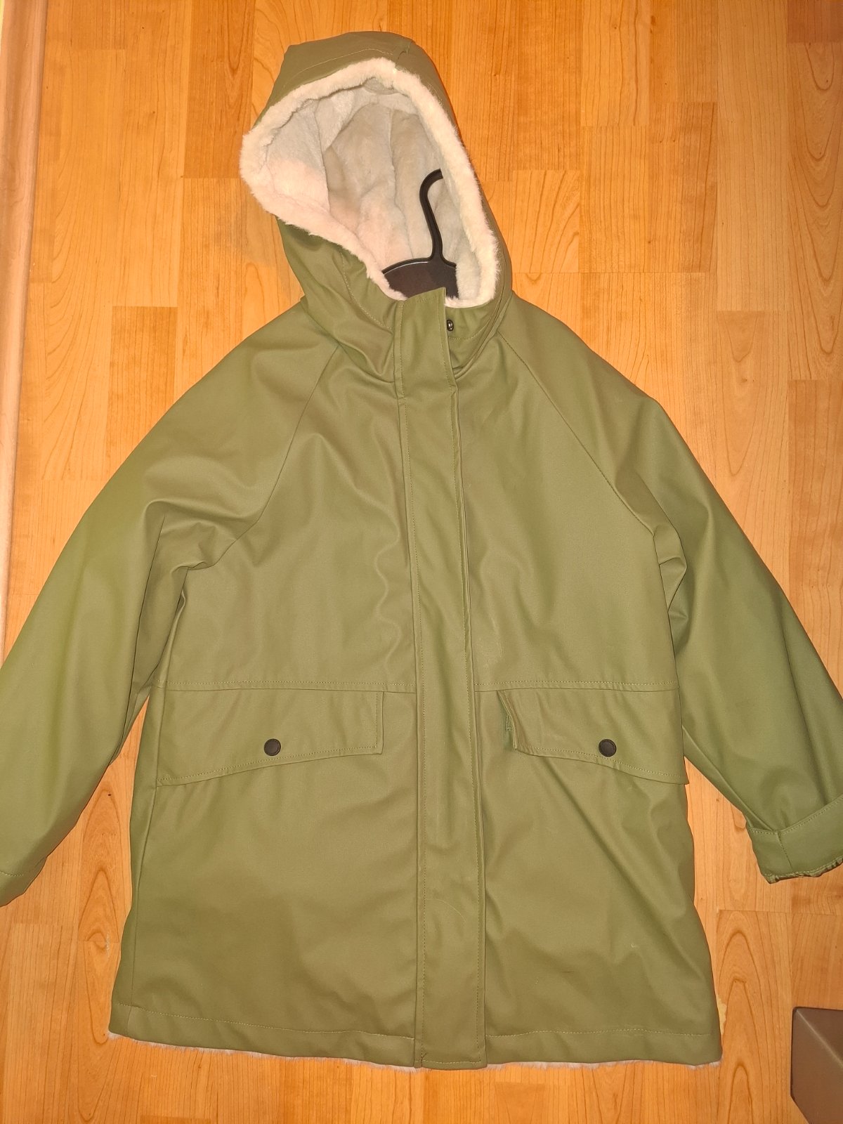 Vnutri je teplá kožušinka ktorá sa dá odopnúť,takže ju môžte potom nosiť aj ako prechodnú.Farba je ako na poslednej fotke,bez poškodení,krásna.