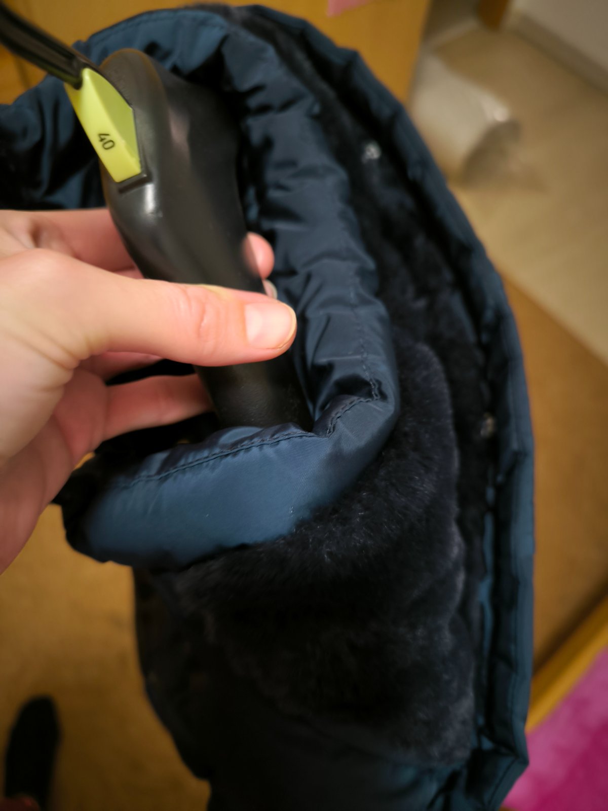 Predám tmavošedú vetrovku, predĺžená, s fialovou kožušinkou vo vnútri, cena 4,90 euro.