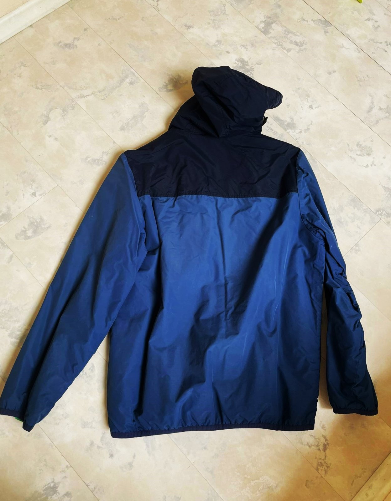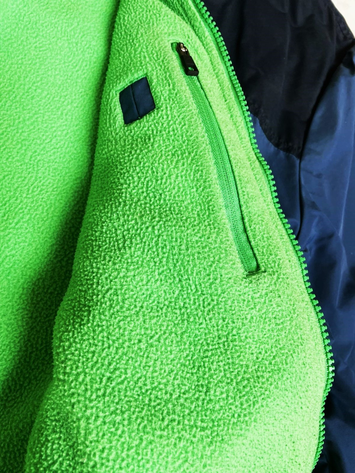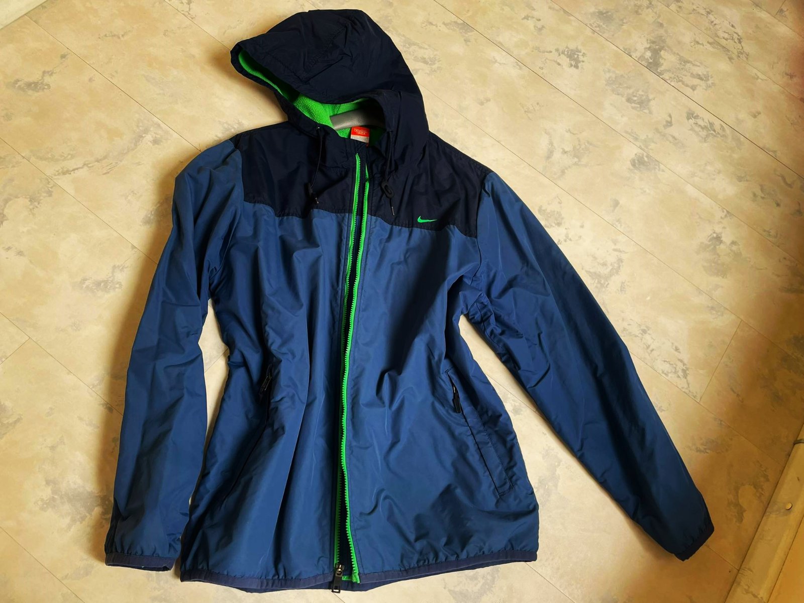 kvalitná vetrovka Nike - originál,perfektný materiál a vypracovanie,krásna kombinácia farieb,farba je oceľovo modrá,kombinovaná na sedle s tmavomodrou,je zateplená pestrým zeleným flisom,transparentný zelený hrubý zips, rukávy podšité futrom v rovnakej farbe