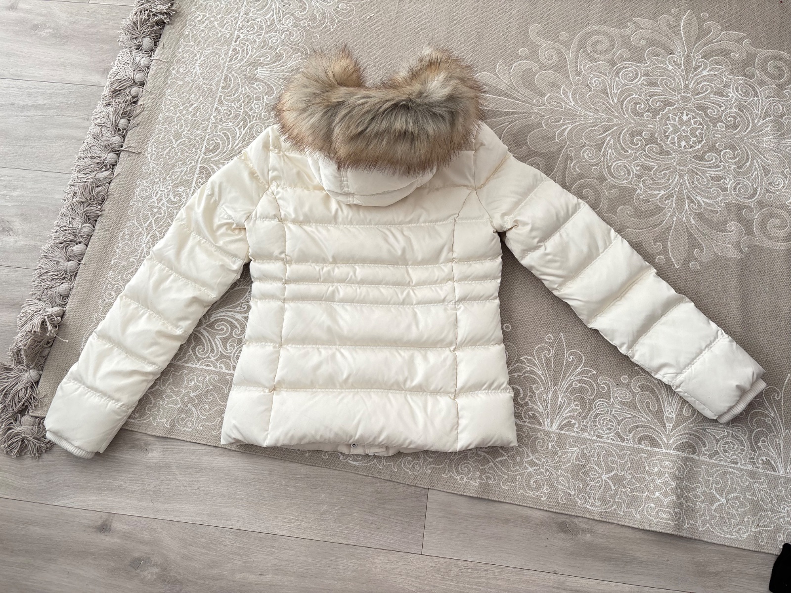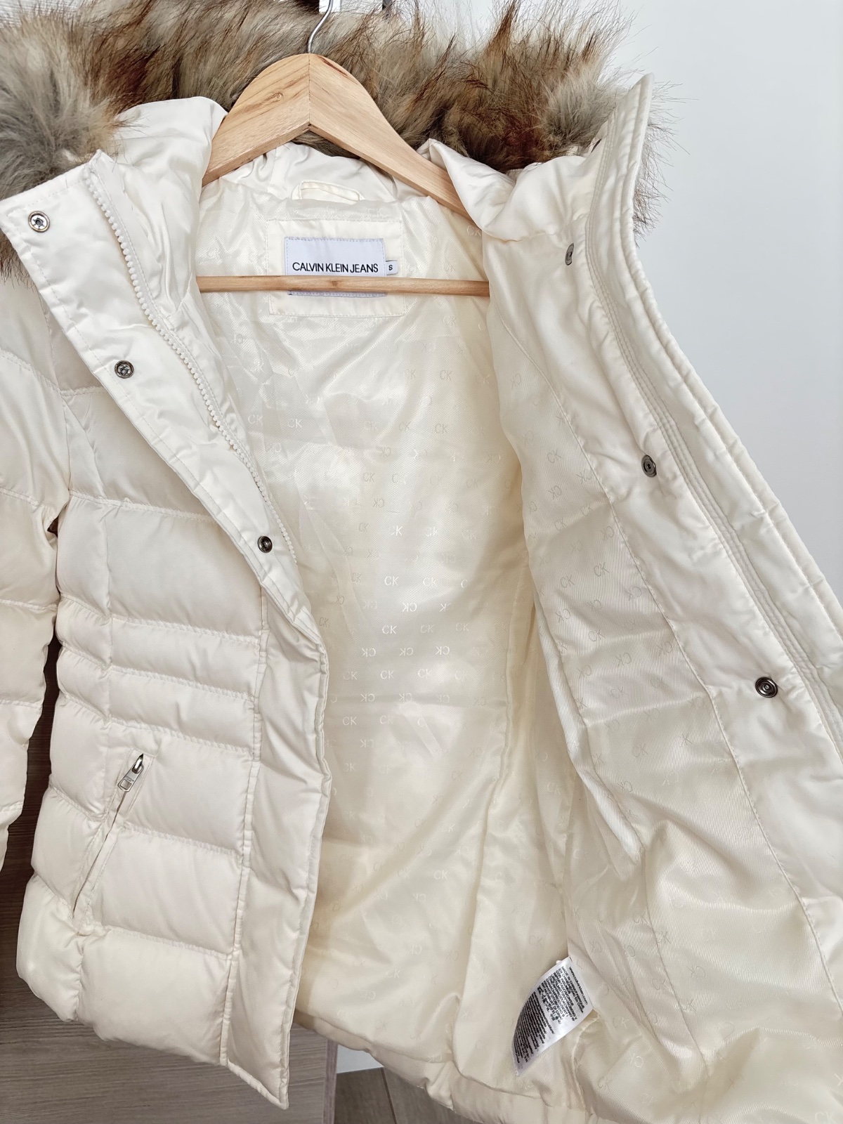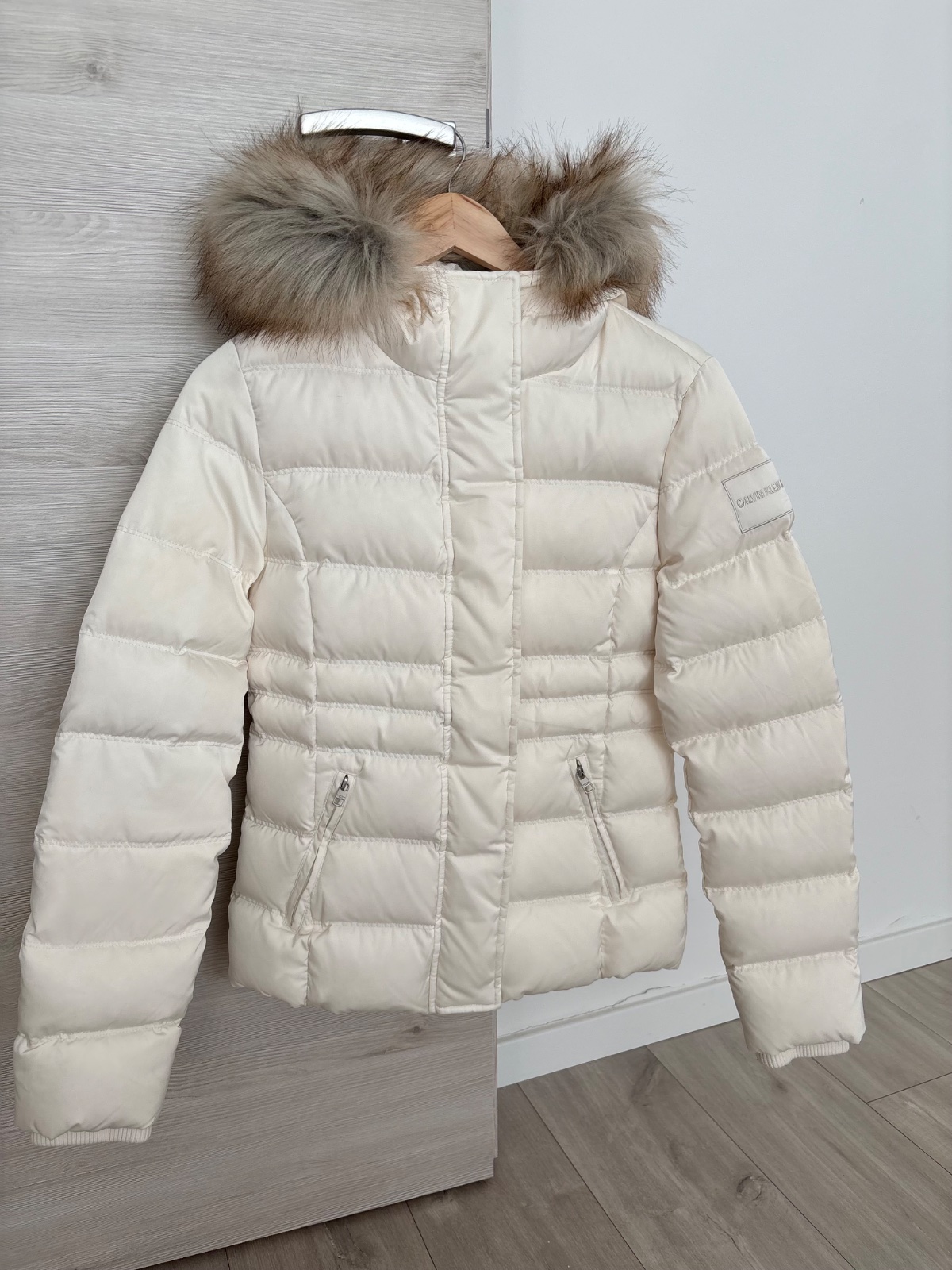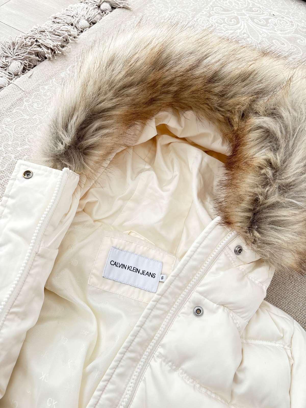 Krasna nova kremova bunda Calvin Klein, velkost S, plnena je paperim, je tepla a neposobi napriek tomu mohutne. Pc bola 279 eur, posuvam za zlomok ceny. Nosim ju v inej farbe a mozem odporucit. Sirka medzi pazuchami 47 cm. Kozusinka sa da odopnut.