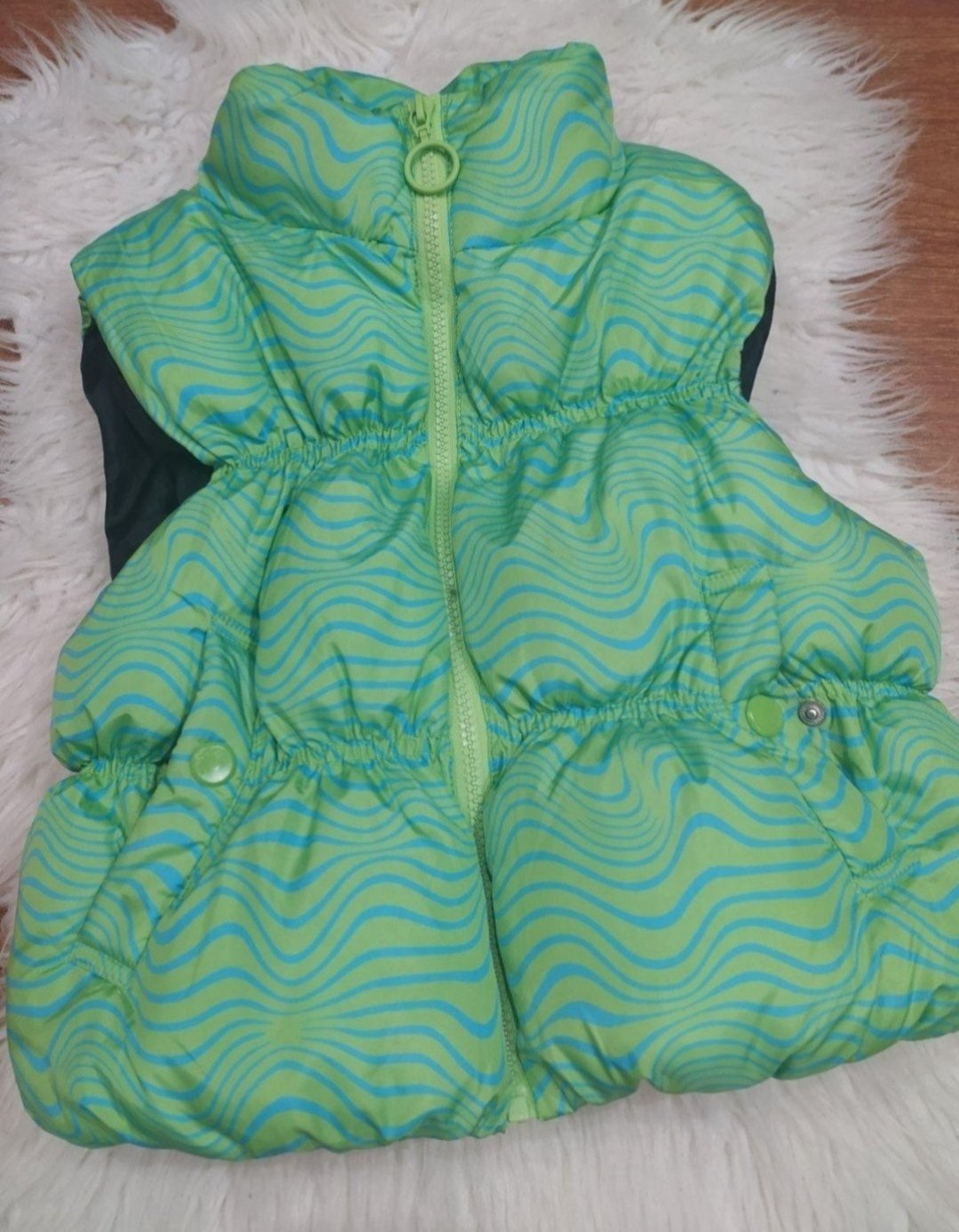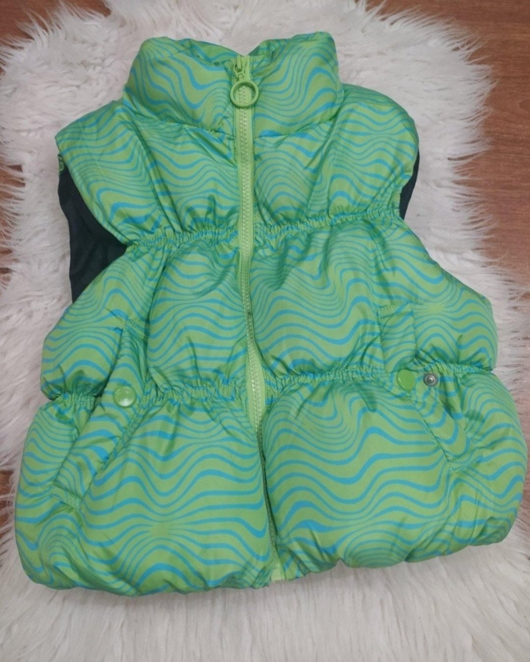 Vestička s krásnou kožušinkou. Veľmi pekná zelená farba so zlatými cvokmi super ladí. Zateplená, bez chýb a poškodení. Rozmery na foto.