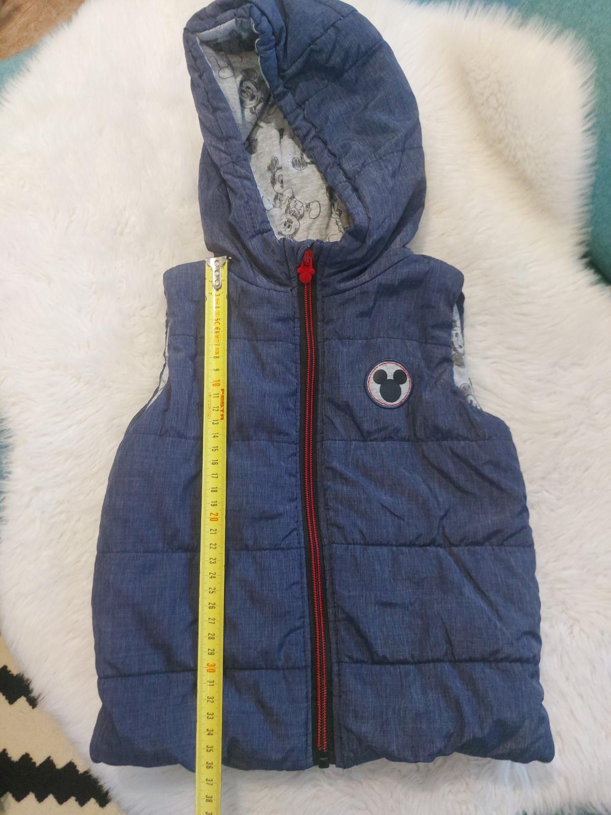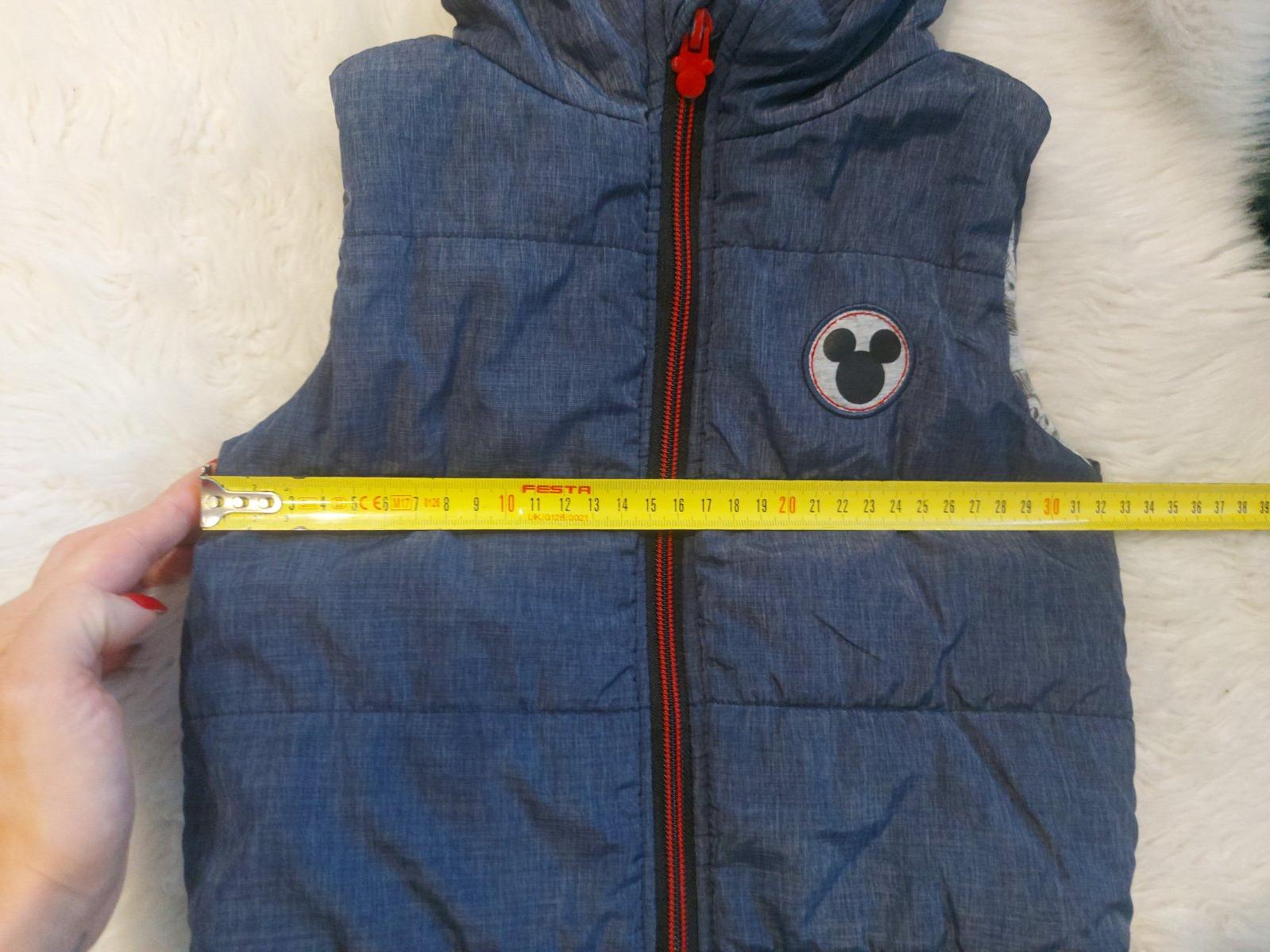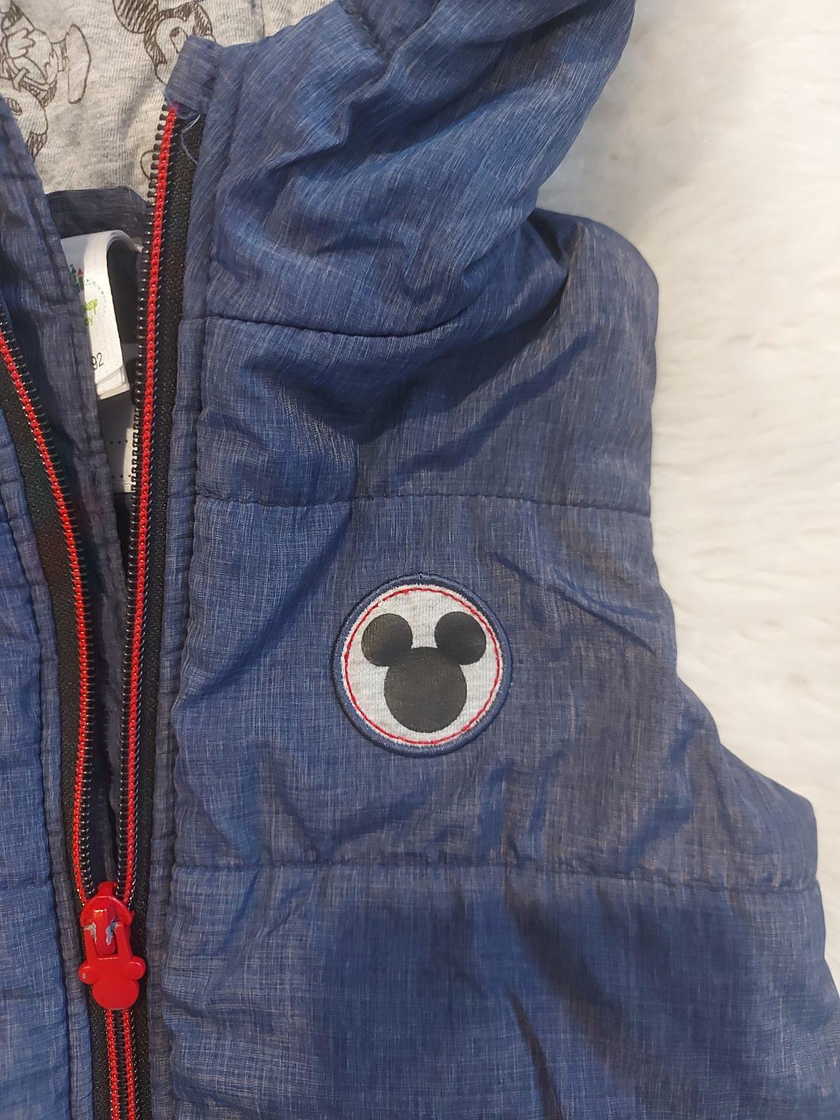 Tepla prechodna vesta s motivom Mickey Mouse. Je vs uper stave, nosená príležitostne, dole je na gumičku, je podšitá, kapucňa je na pevno, jedinou chybou je trochu ošuchaný bežec (vid foto), farba nazivo krajsia, fotka skresluje
