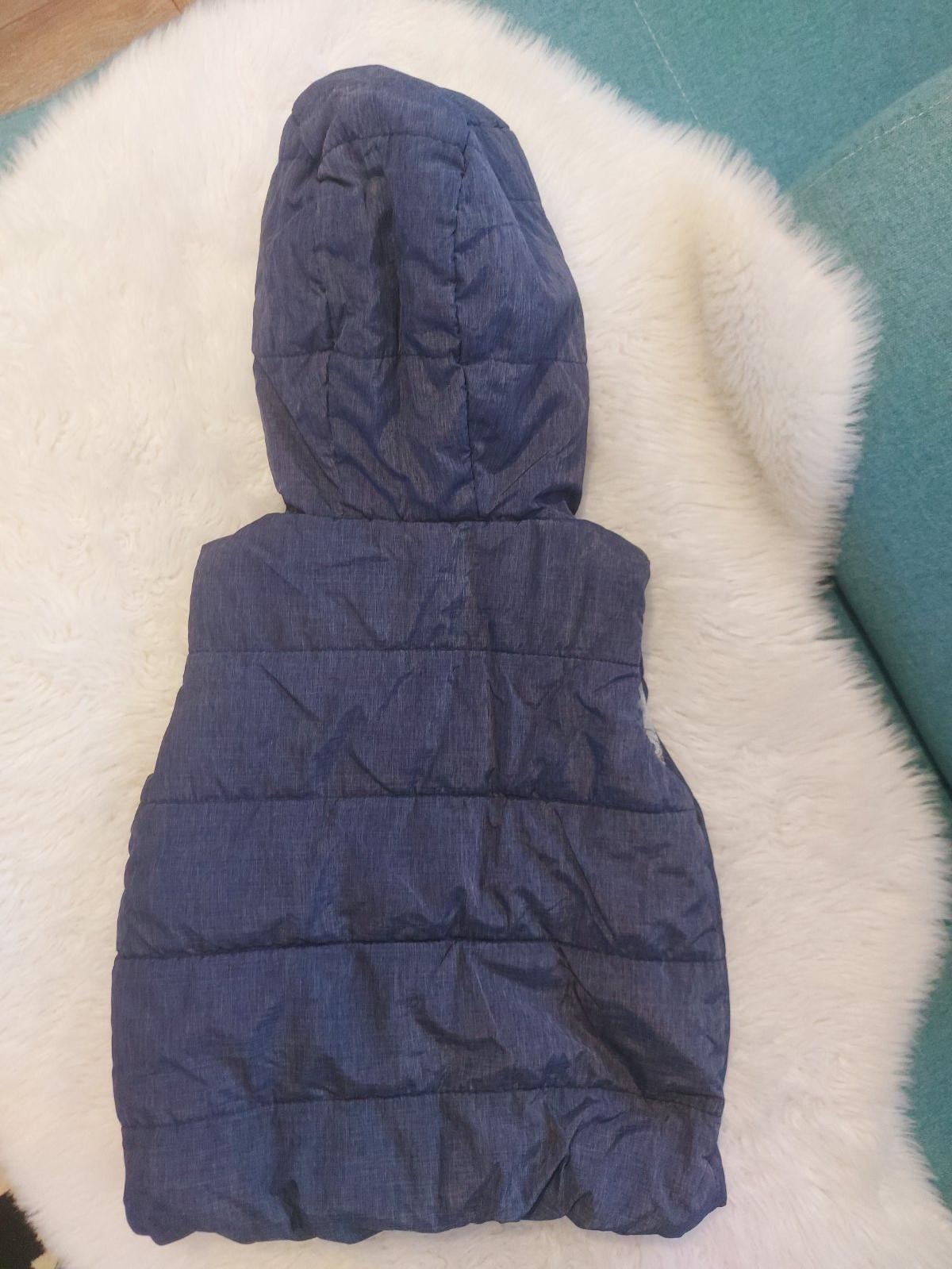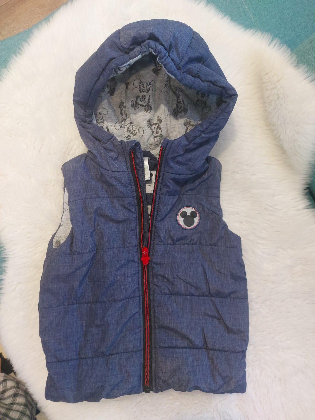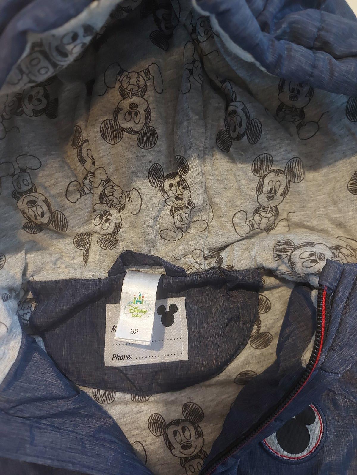 Tepla prechodna vesta s motivom Mickey Mouse. Je vs uper stave, nosená príležitostne, dole je na gumičku, je podšitá, kapucňa je na pevno, jedinou chybou je trochu ošuchaný bežec (vid foto), farba nazivo krajsia, fotka skresluje