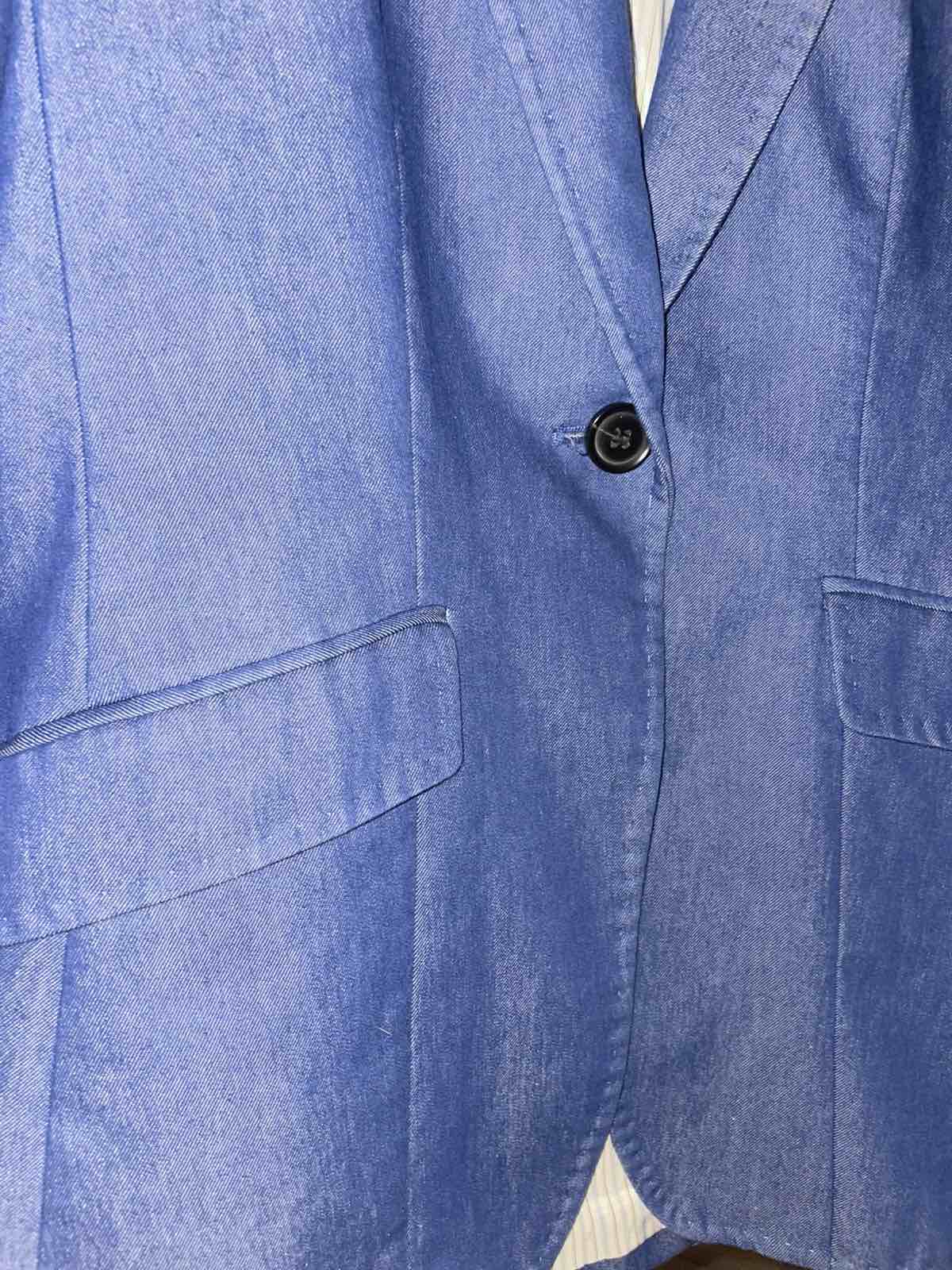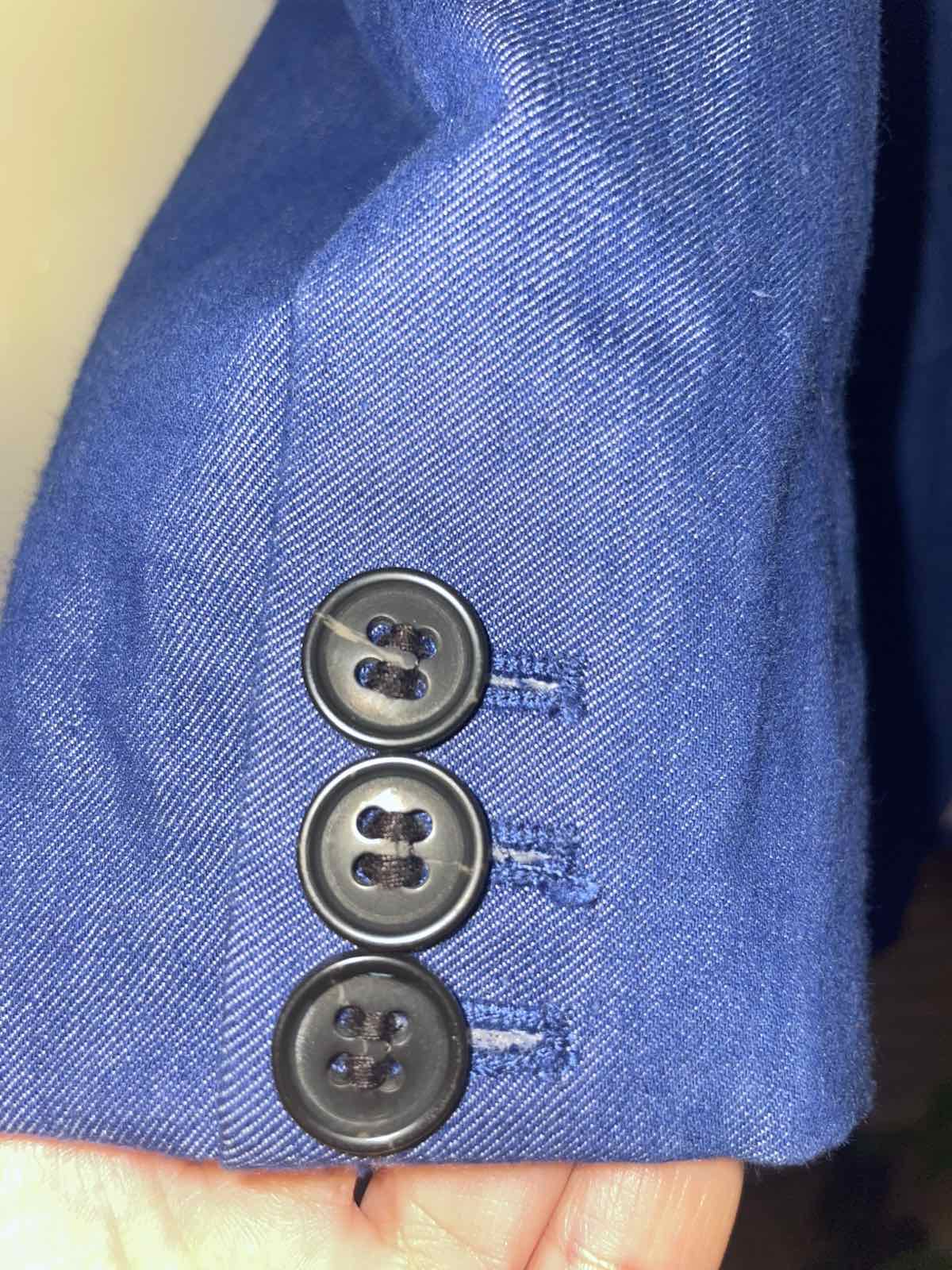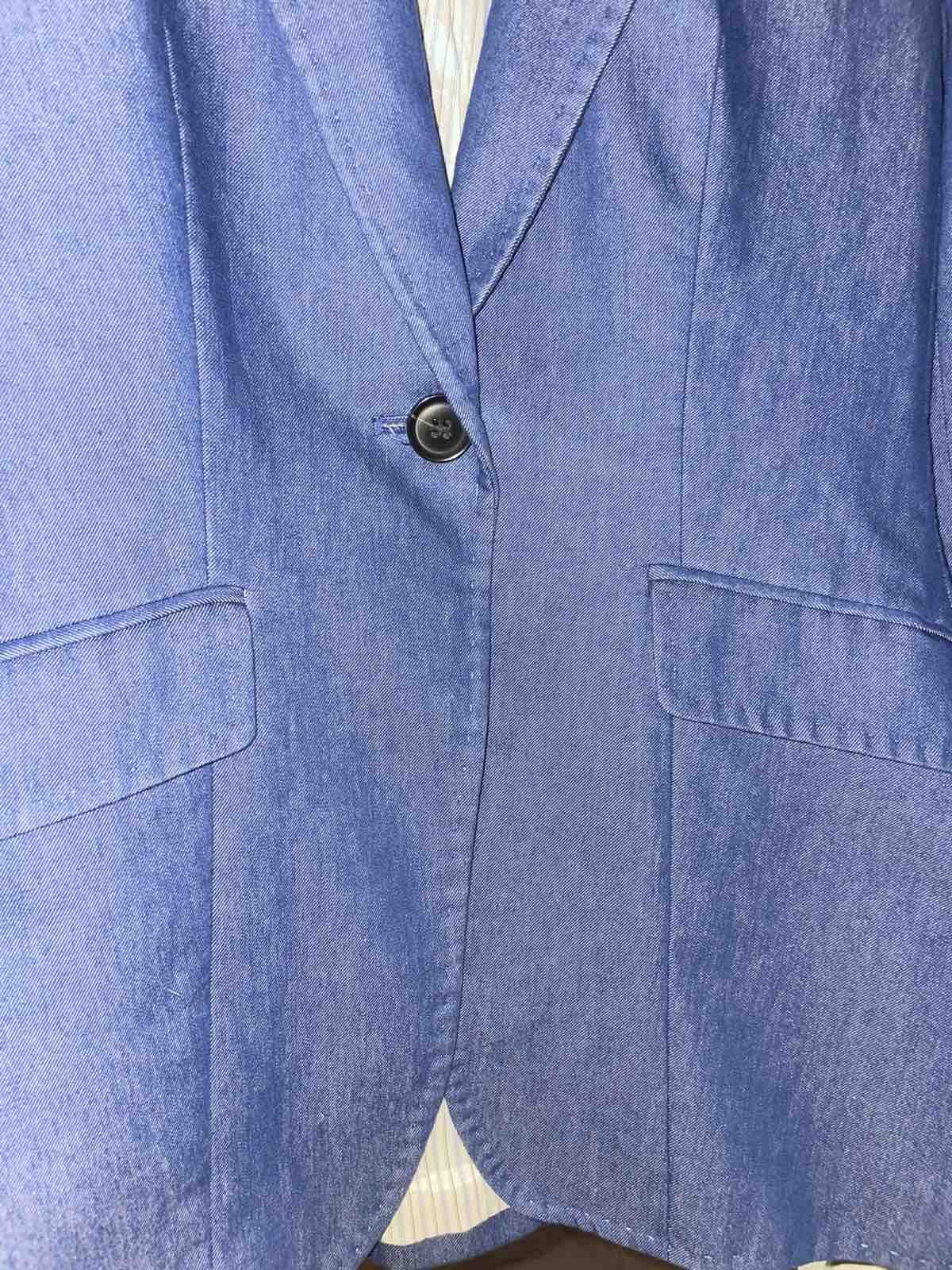 Výborný stav, denimova modrá, tenká riflovina, strih kopírujuci postavu, formované v páse, nepruží, veľkosť 38,šírka pod pazuchami cca 46 cm, dĺžka 66 cm, rukáv bol skrachovaný
