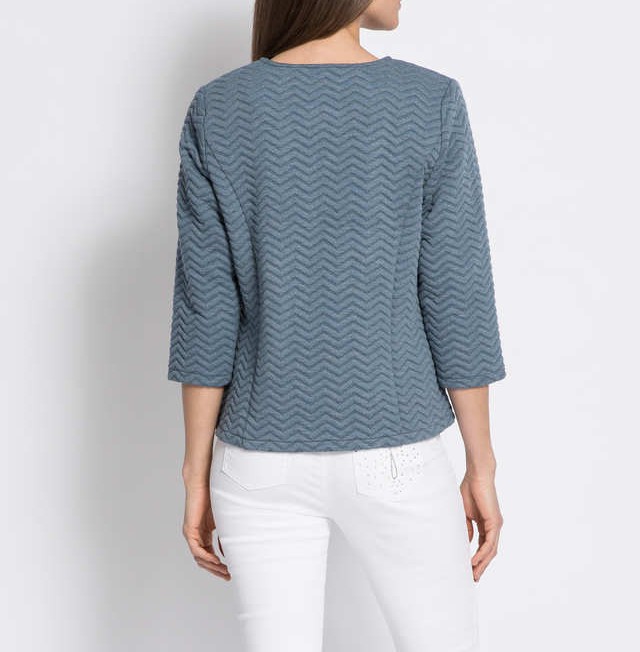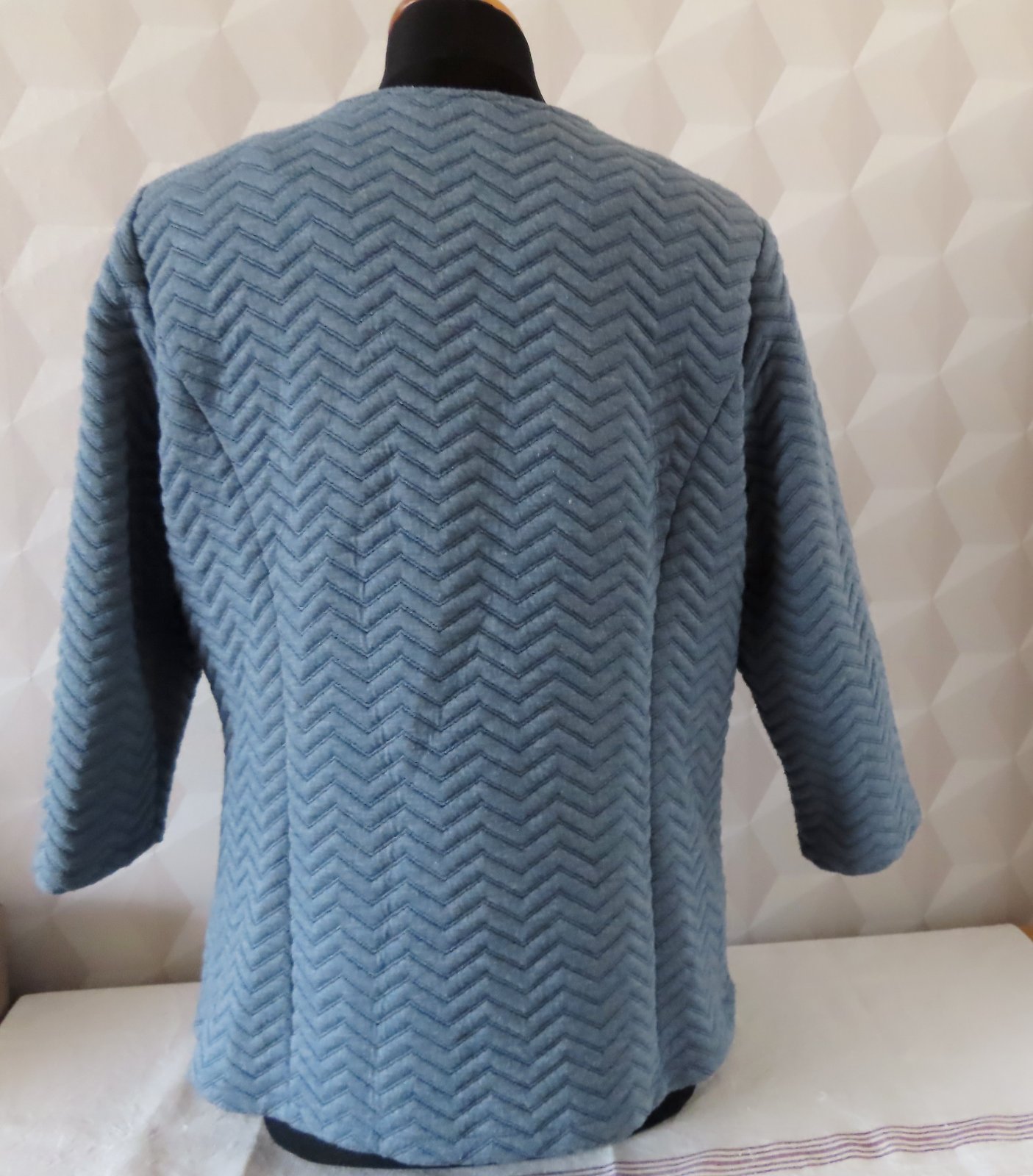 Dámske sako FB Fiora Blue, veľ. L - rozmery: dĺžka 64cm, pod pazuchami 2x52cm, rukáv je 3/4 dĺžky - od pleca 45 a od pazuchy 28cm.