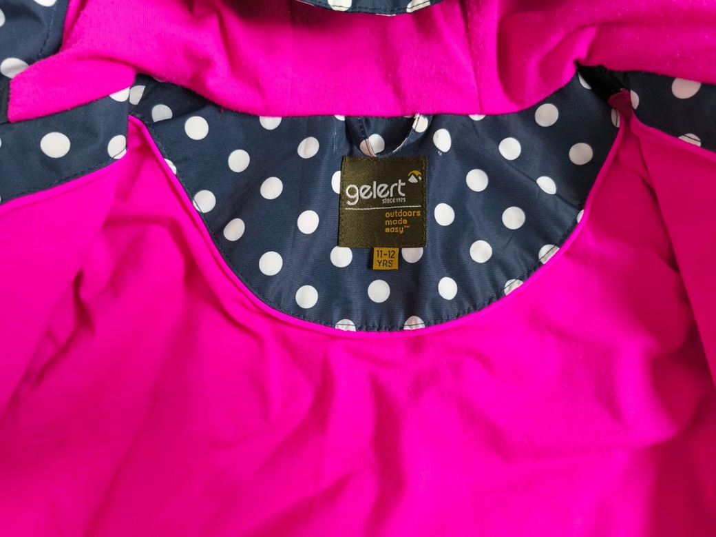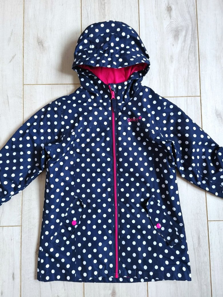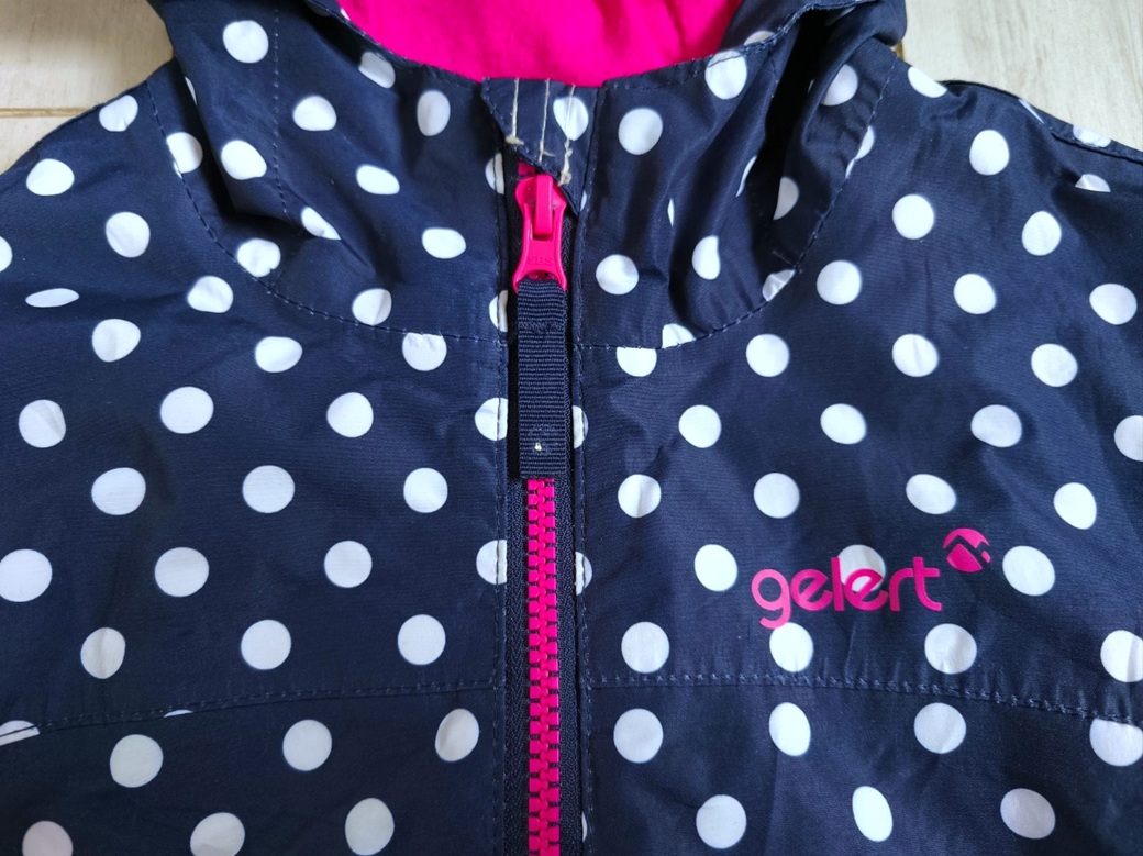 Ponúkam túto dievčenskú prechodnú bundičku zn. GELERT, tmavomodrej farby s bielymi guličkami a sýto ružovým vnútrom, nepremokavá - perfektná ako teplejší pršiplášť, je v perfektnom stave, veľkosť 152.