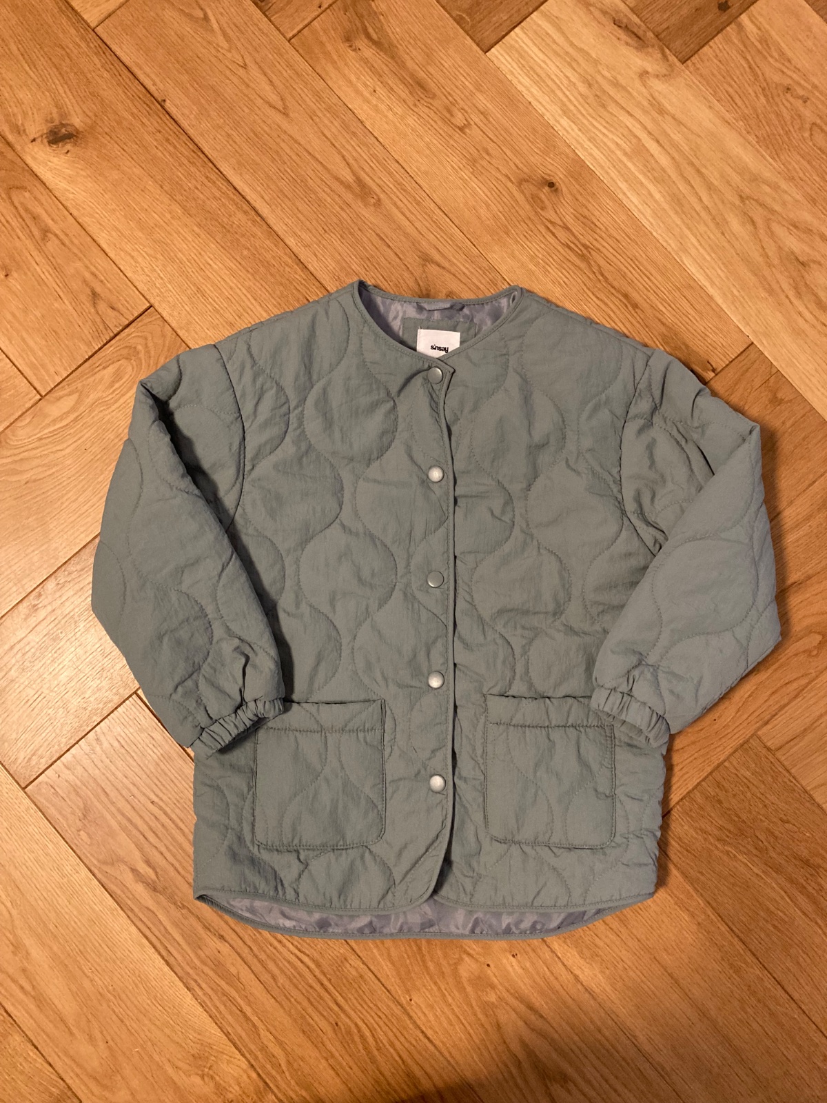 Oblecene asi 2 krat, super stav, prechodna, stylova. Podla mna skor velkost 122. Farba taka mint modra