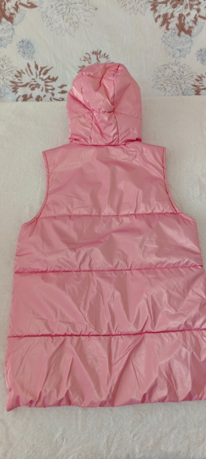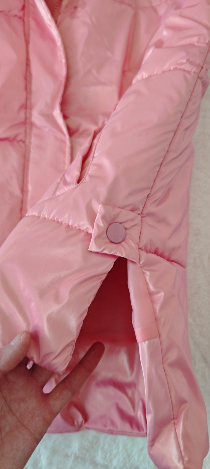 Predám túto prešívanú vestu s veľkou kapucňou so stojačikom,. Má metalickú ružovú farbu, zapínanie na krycí zips, plus dole jeden cvok a hore 2 cvoky, má aj 2 bočné vrecká. Mám ešte jednu v podstate rovnakú vestu vo veľkosti 158, fialovej farby, nájdete ju medzi mojimi inzerátmi.