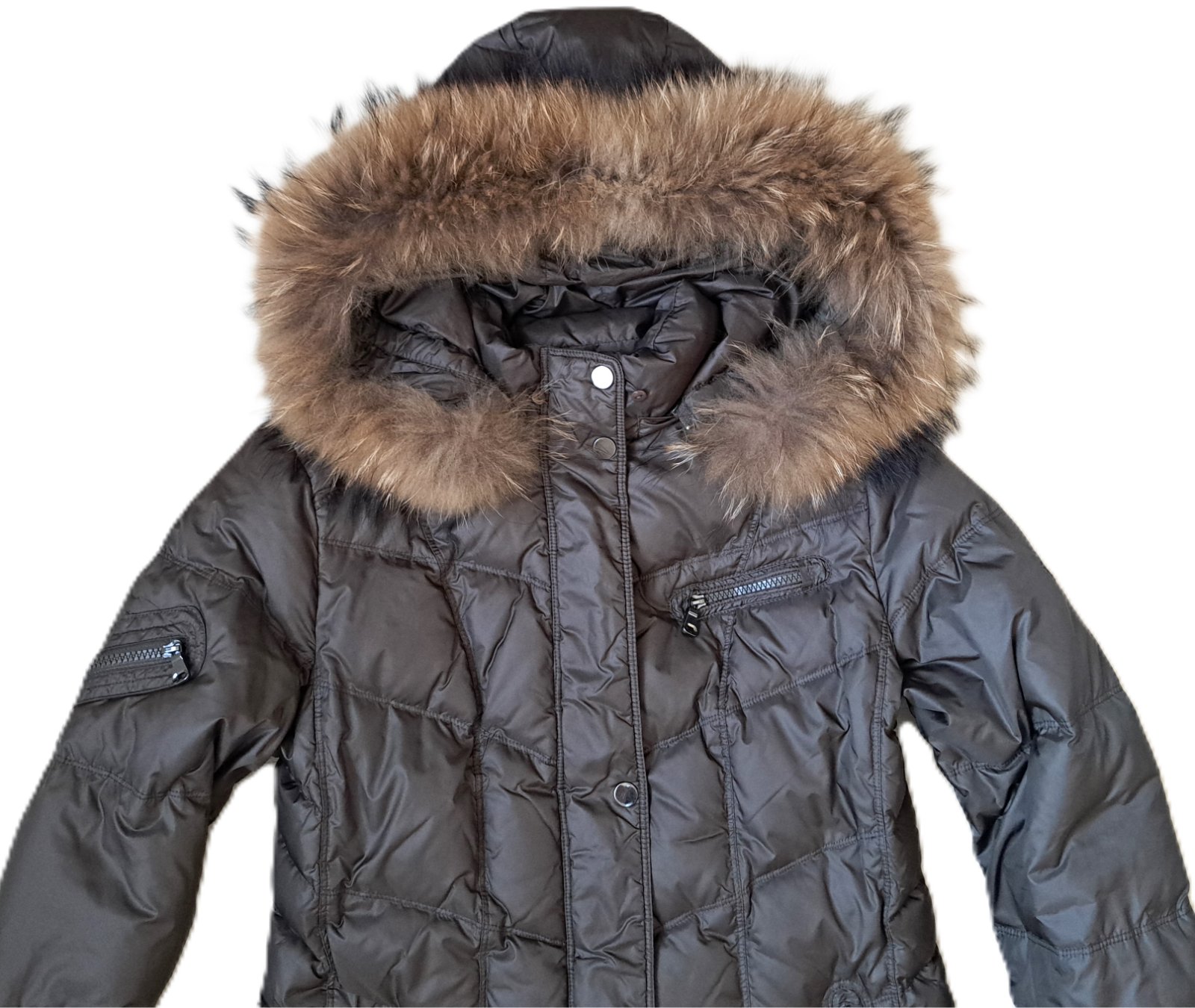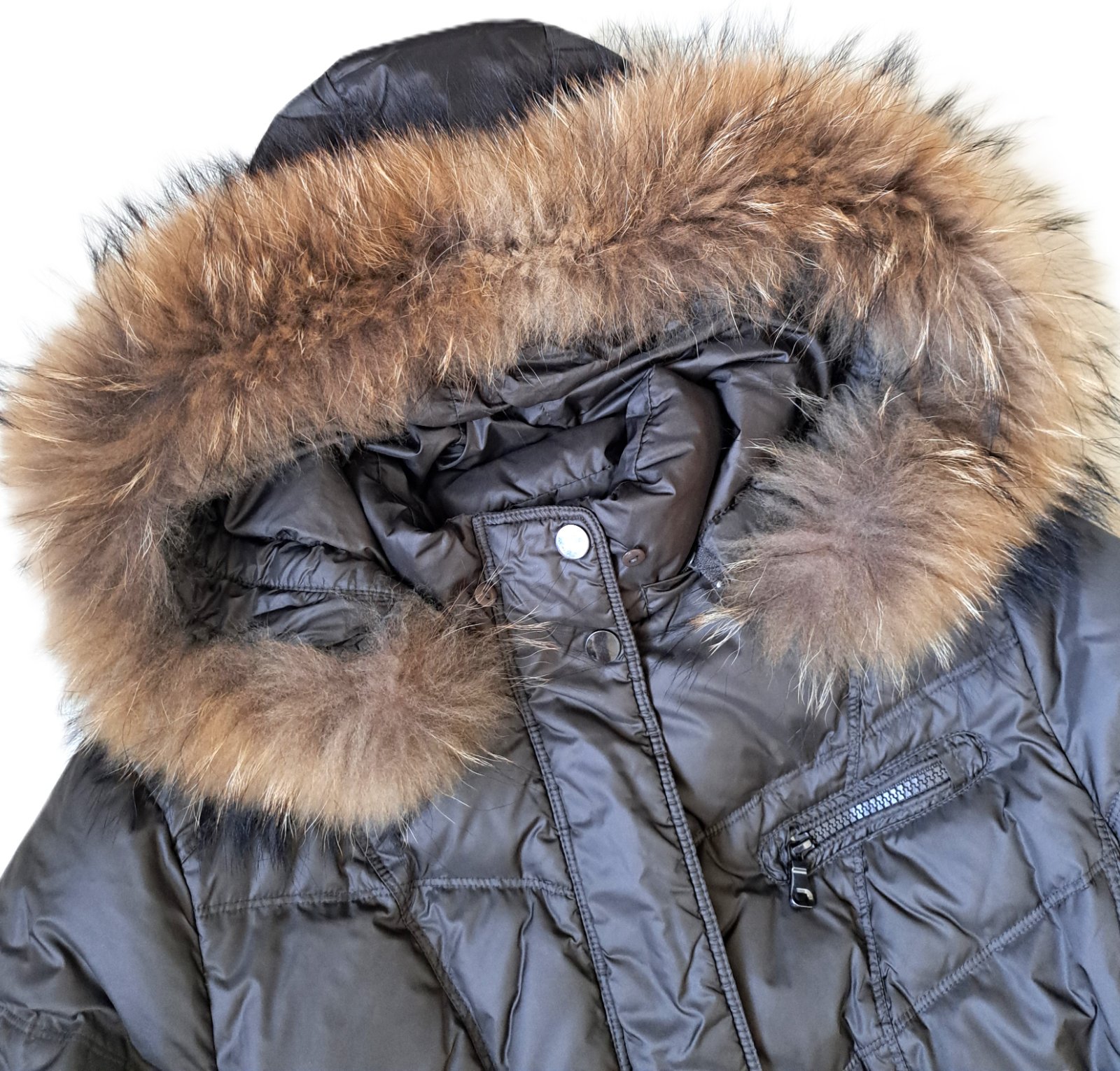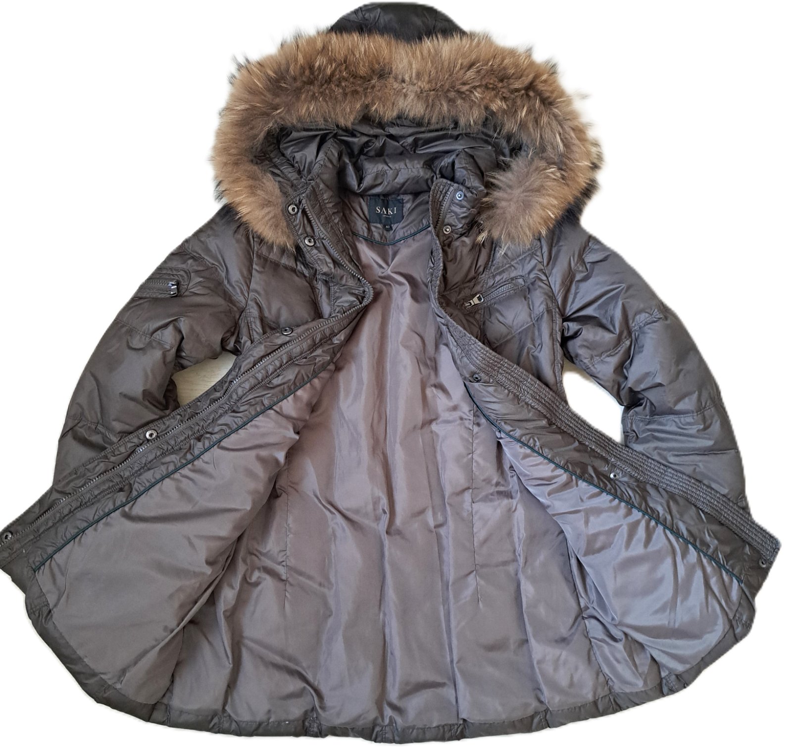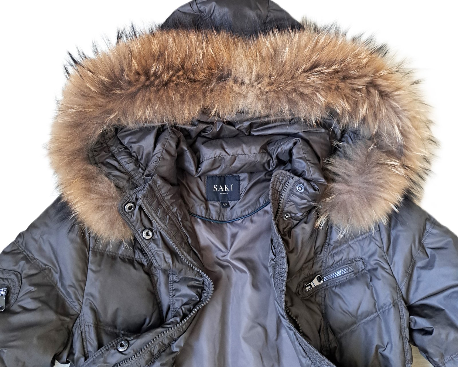 Dámska luxusná bunda Saki - bola nosená, no je v super stave, bez poškodení. Veľkosť je uvedená 40, čo aj zodpovedá. Sadne ako väčšie M, menšie L. Jedná sa o kvalitnú švédsku značku, PC bola veľmi vysoká. Bunda je páperová, krásnej hnedej farby s masívnou, pravou kožušinkou. Je mierne predĺžená, v páse zúžená. Vrchný materiál je jemnučký, je vzdušná a veľmi teplá. Vzadu je na jednom mieste trochu zatiahnutá nitka.