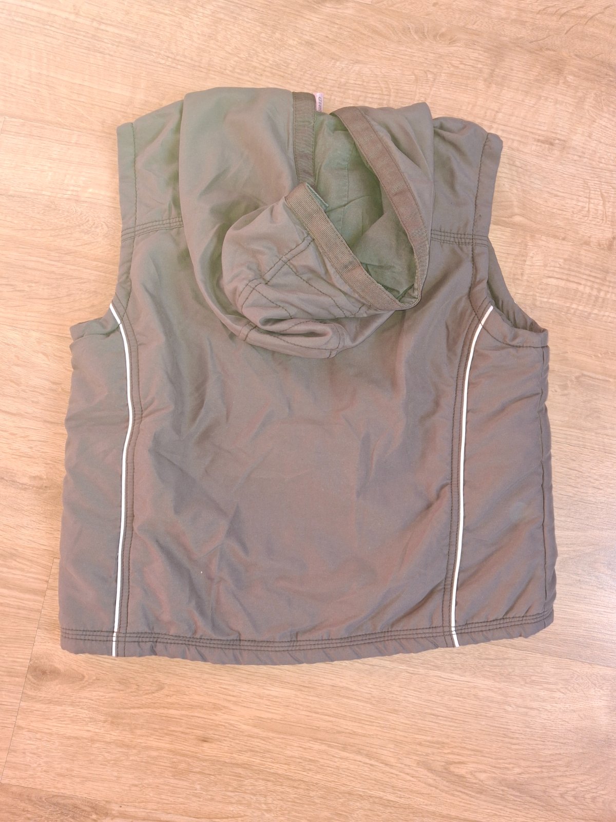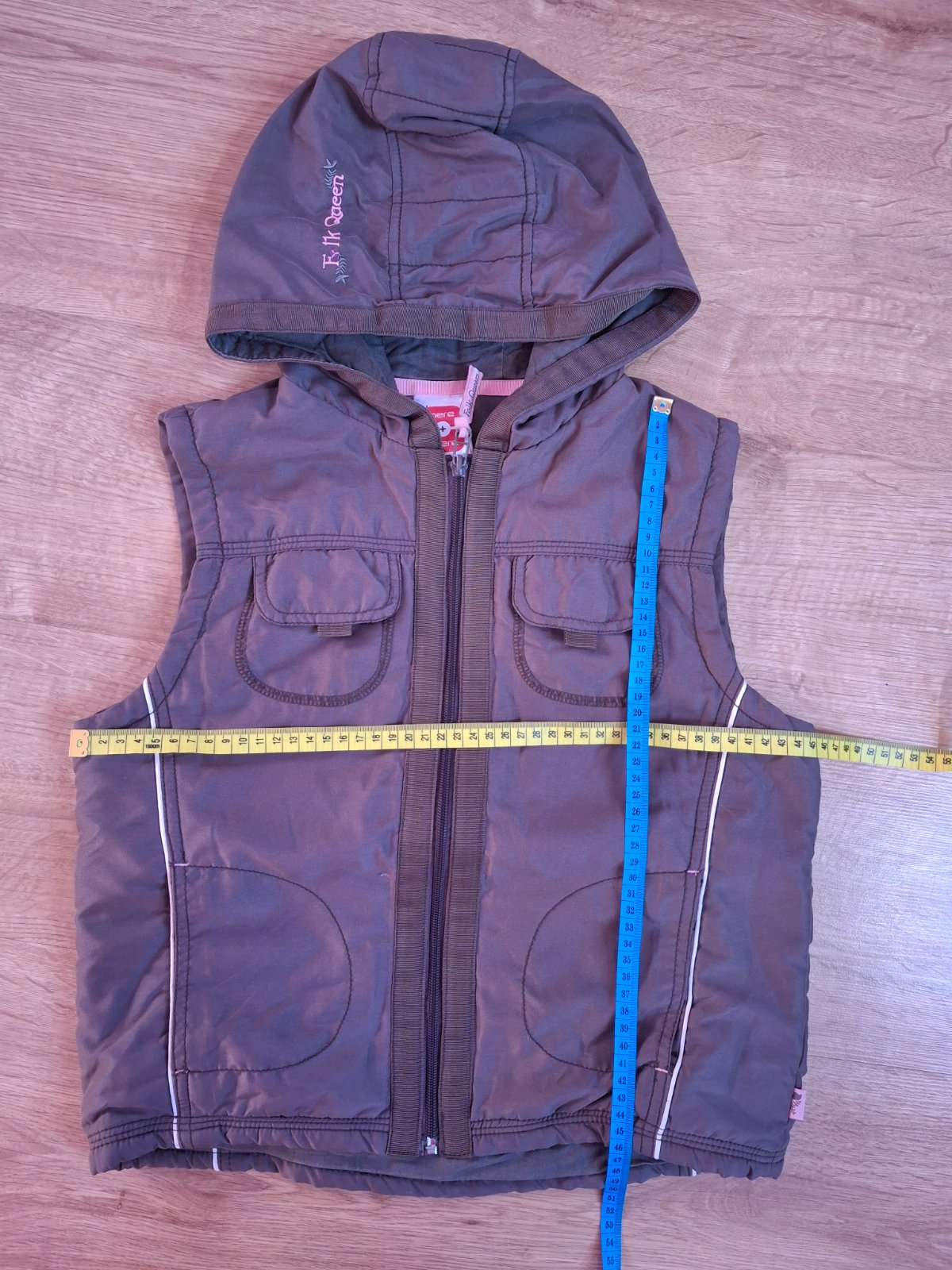 Pekna presivana vesta- nova, s visackami. Kapucna sa da odopnut. Je do miernej zimy. ROZMERY: celkova dlzka od pleca: 72cm, sirka pod pazuskami: 50cm