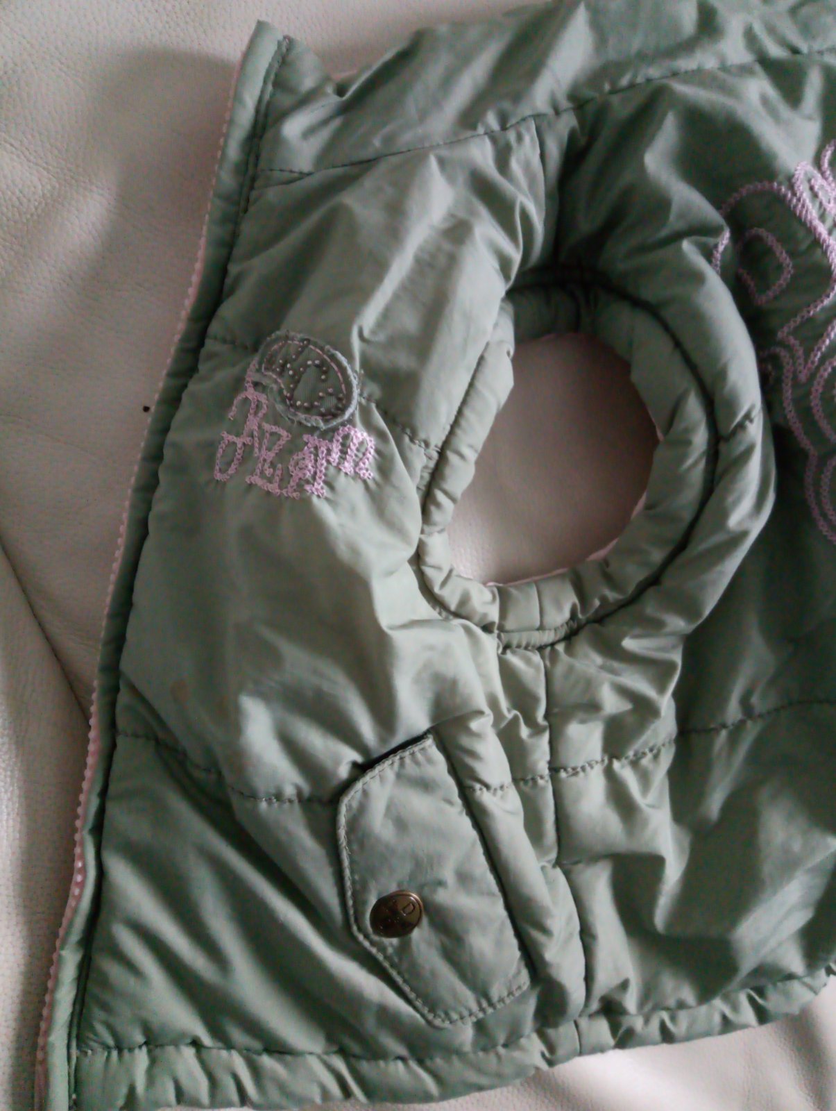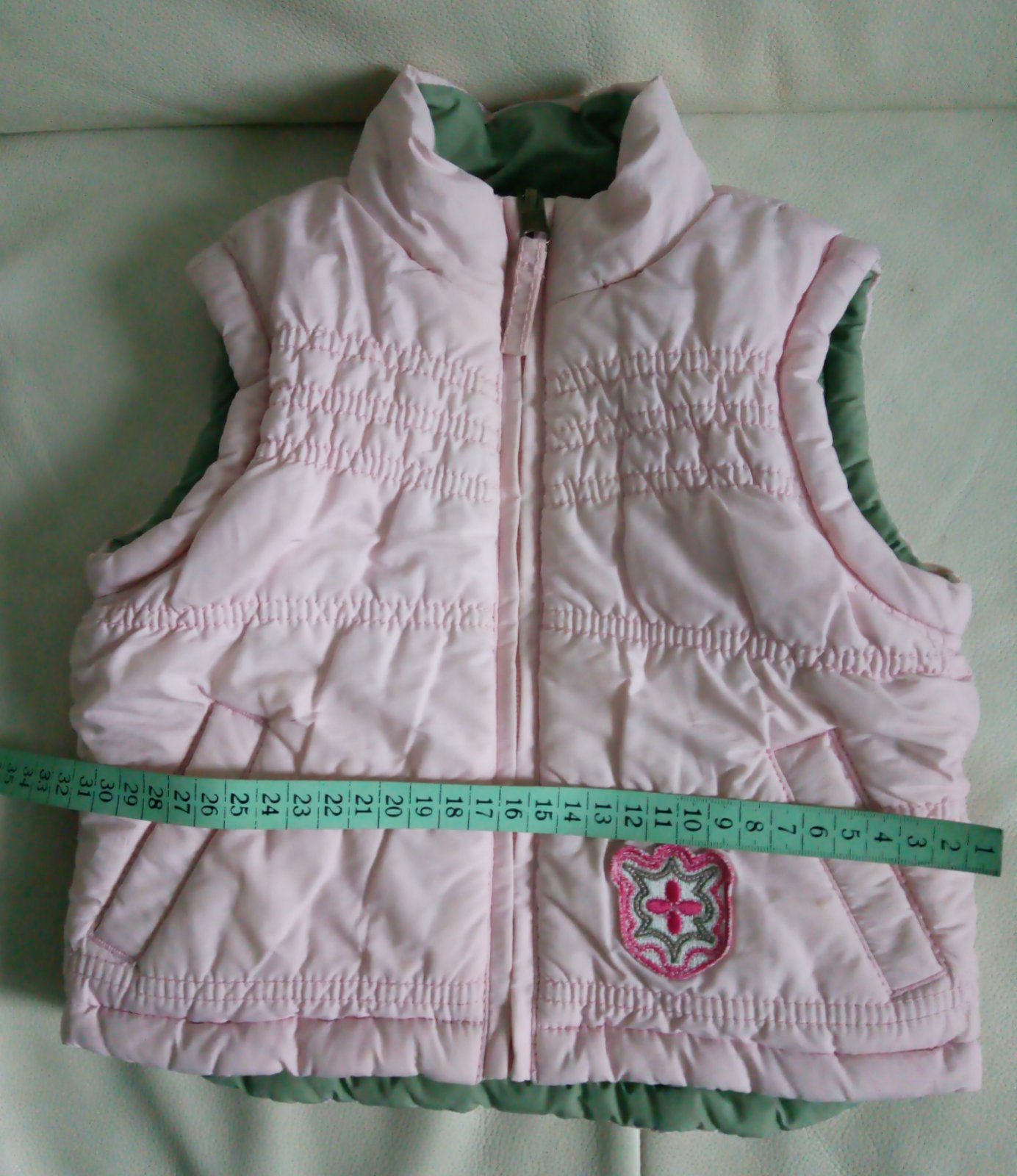 Obojstranná vestička v ružovo olivovej kombinácii. Veľkosť udaná len orientačná, presné rozmery na foto. Málo nosená, cena 5,50 € + poštovné