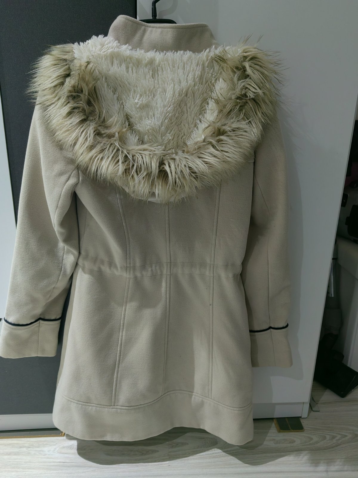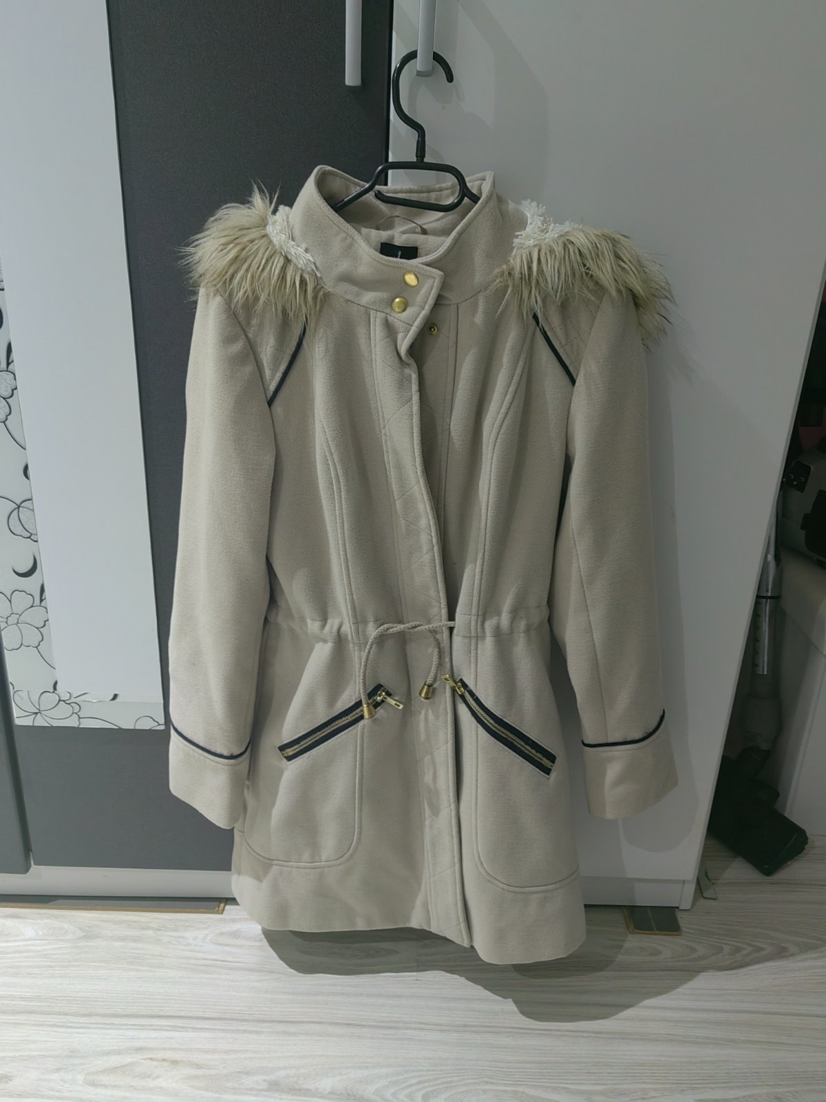 Krásny zimný kabát oblečený iba 1x v TOP stave. Áčkový strih, funkčné vrecká na bokoch. Opasok k nemu som bohužiaľ stratila, ale v pohode vyzerá aj bez. Kožušinka okolo krku sa dá odopínať. Materiá...