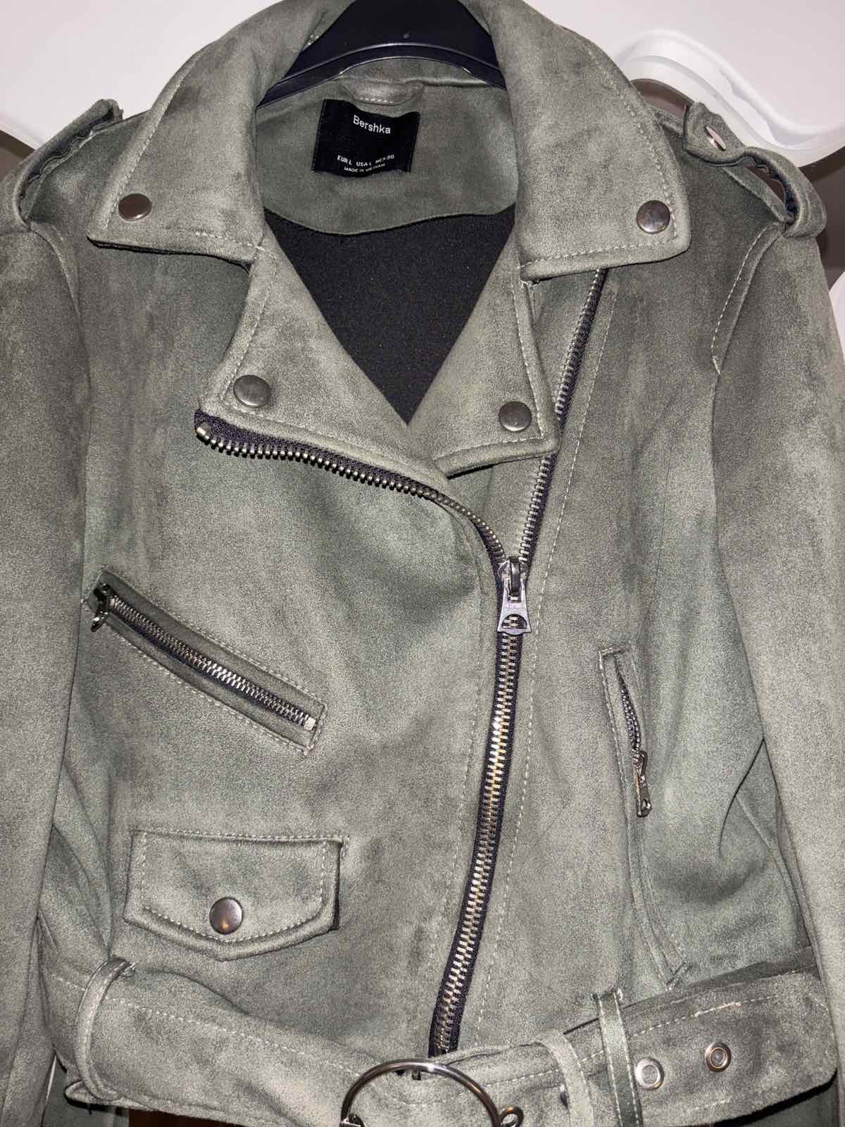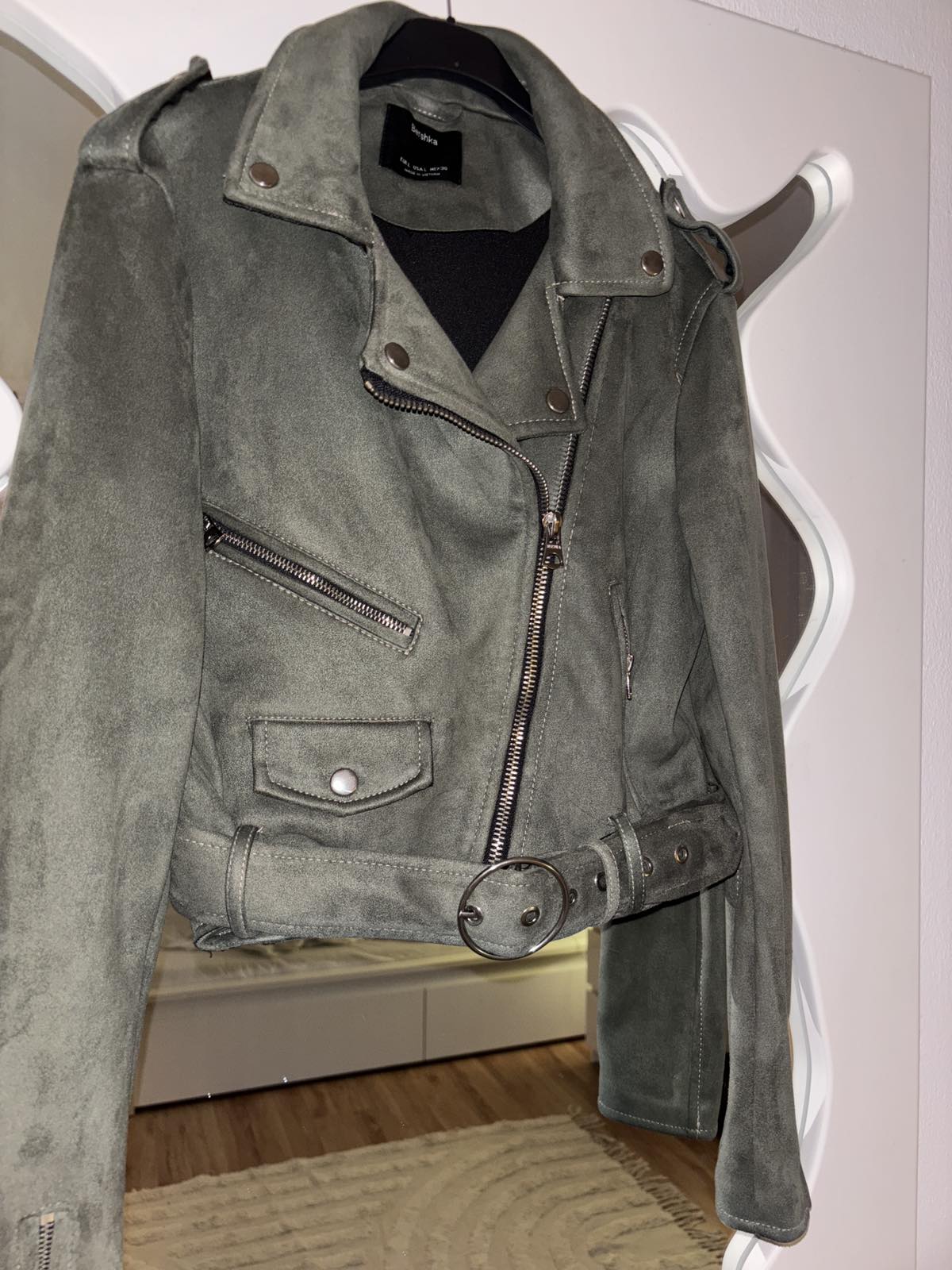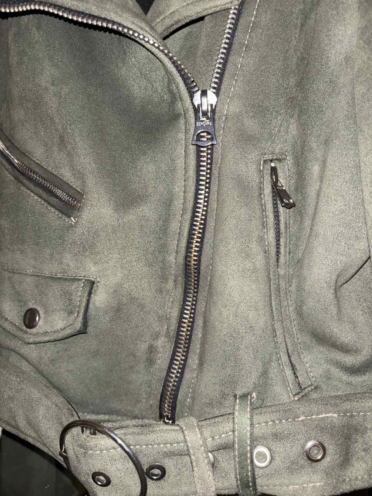 Pár krát oblečená, olivová, imitácia brúsenej kože, ľahká údržba bežným praním, veľkosť L, skôr M, šírka pod pazuchami 50 cm, dĺžka 46 cm