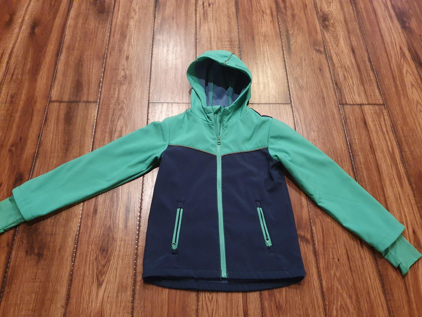 Softhellová prechodná bunda pre chlapcov, veľ. 140, zn. Sinsay. Farebná kombinácia tmavomodrej, modrej a oranžovej, s reflexnými prvkami, a nápisom na jendom rukáve. Bunda má zapínanie na zips, dve...
