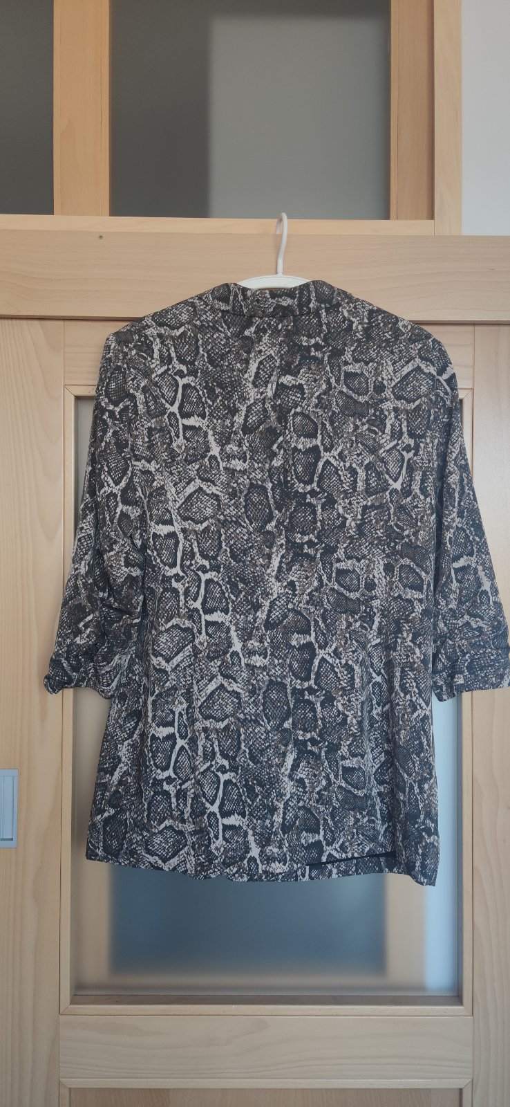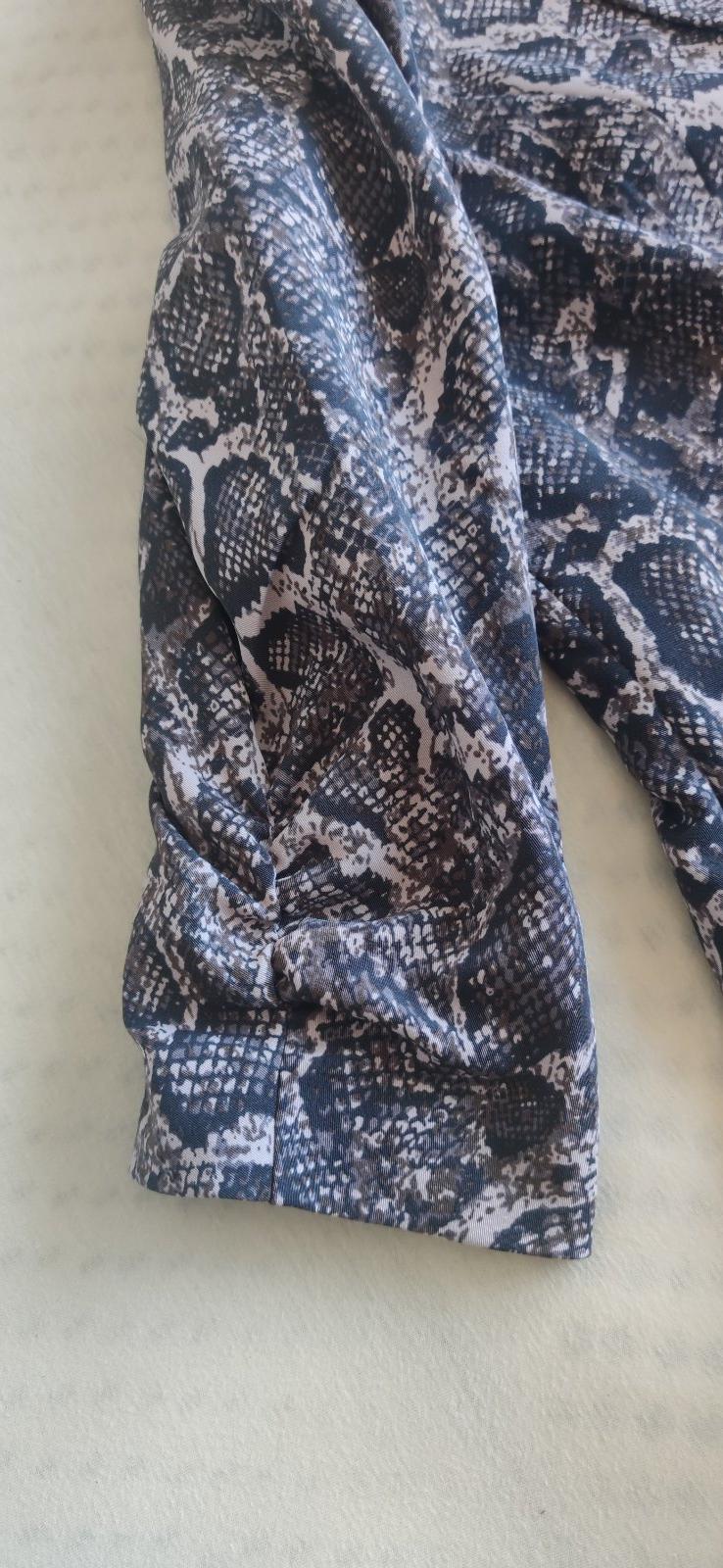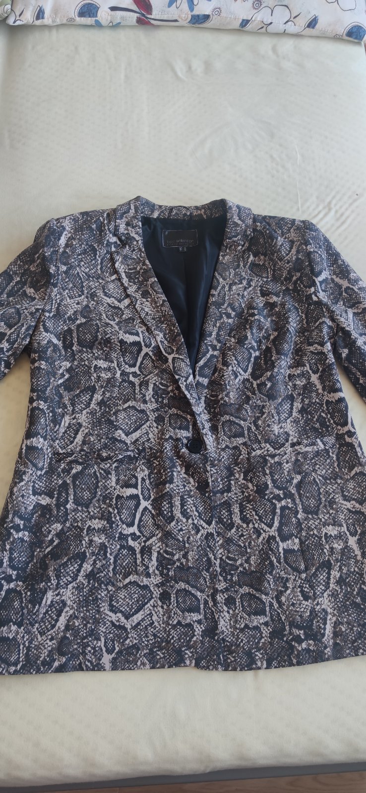 Predám 2-krát oblečené sako. Je veľmi kvalitné, má pekný strih. Sako je podšité, zapínanie na gombík. Má 3/4 rukávy, 2 vrecká. Vzor hadia koža. Farba tmavo sivá, hnedá, béžová.