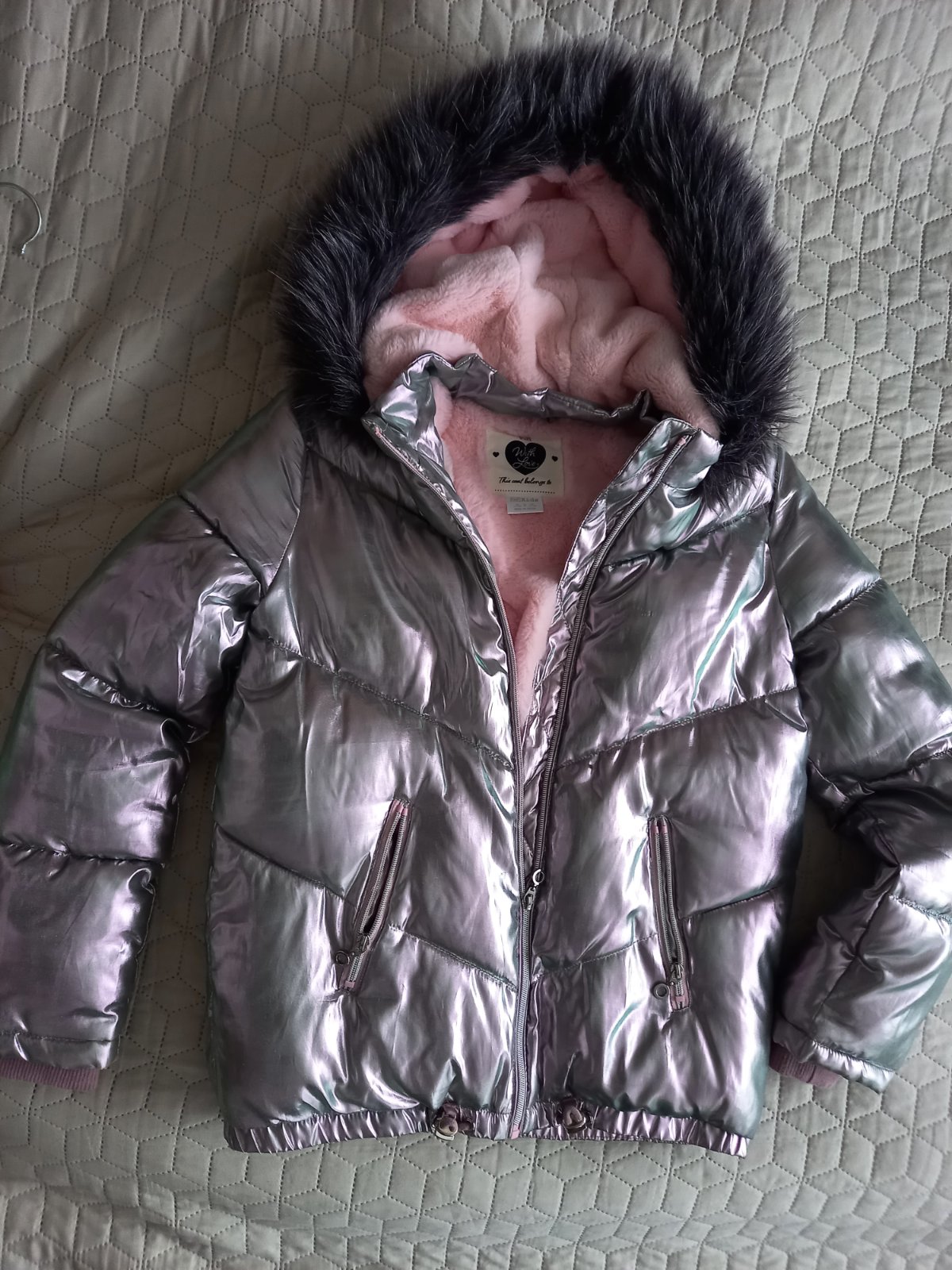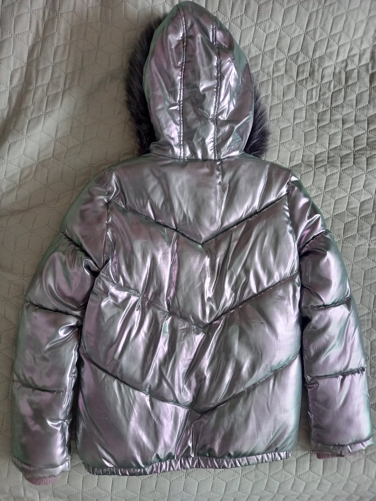 Veľmi teplá zimná bunda, farba je metalická s takým veľmi svetlým fialovým nádychom, nosená asi dva mesiace minulú zimu striedavo s inou bundu, vo výbornom stave, bez akýchkoľvek poškodení.