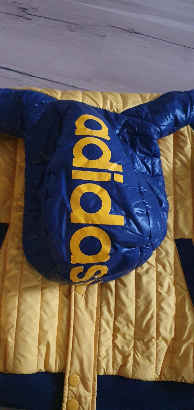 Je bez poskodenia (bez dier ci flakov) ale na vnutornej strane zapinanie je modry fliacik asi odtlacene od zipsu, kedze je to na vnutornej strane gombikov tak to nevidno, a este sa jemne odlepil (niektore pismenka) na kapucni napis adidas. Ale nieje to nijako extra vidiet. Bunda je original adidas, bola kupovana v adidase.
