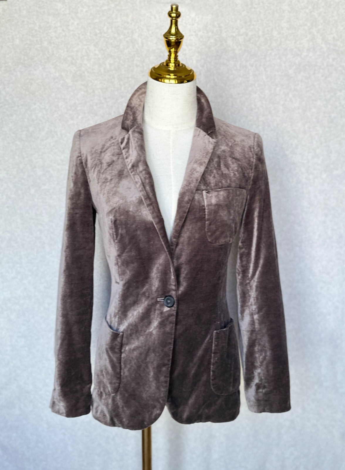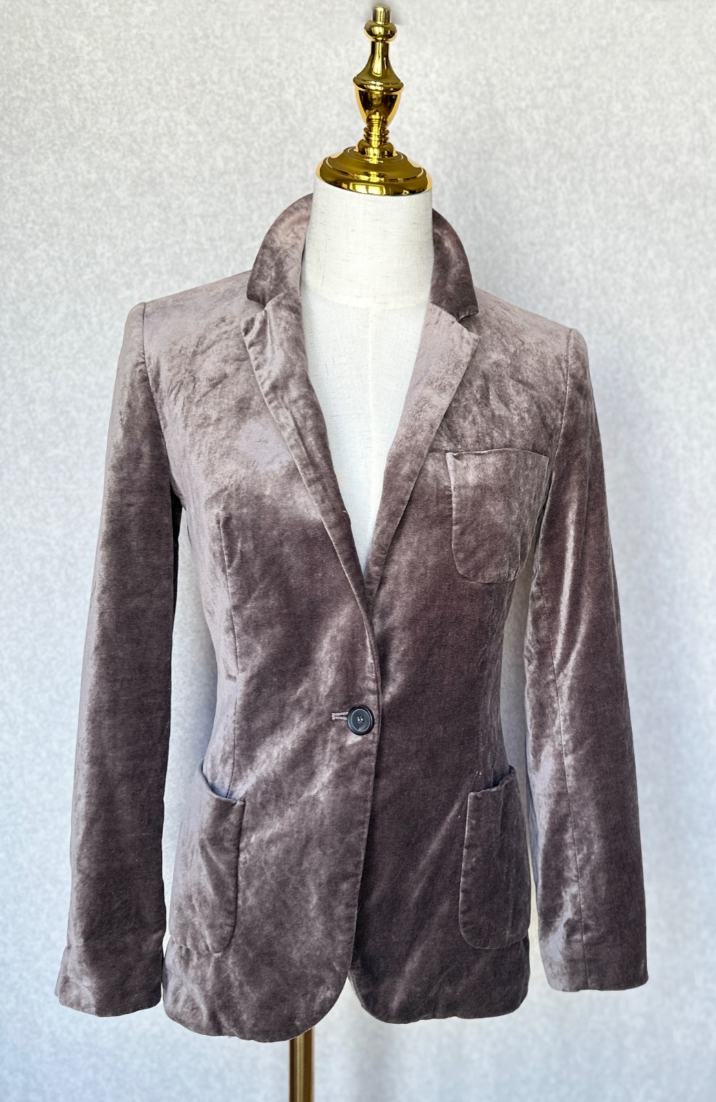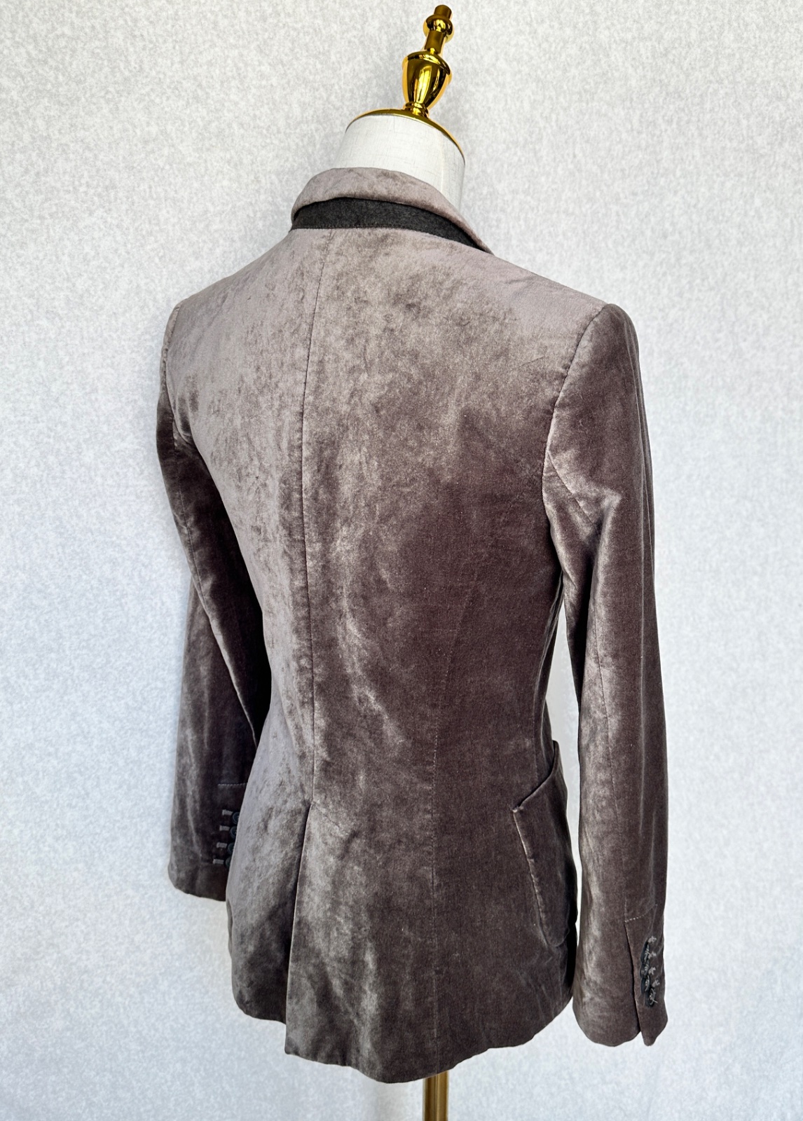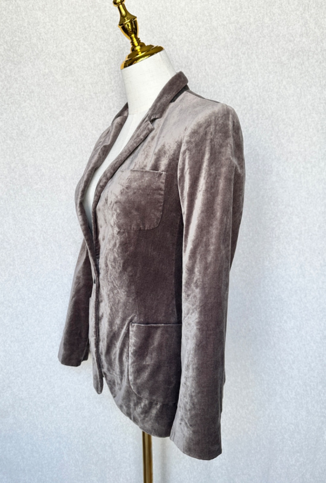 Luxusne pôsobiace zamatové pripasované sako v sivo-hnedej farbe. Zapínanie na jeden gombík, vpredu sú vonkajšie vrecká, vzadu je rozparok, aj na rukávch so 4 gombíkmi. Vo veľmi peknom stave, bez poškodení.