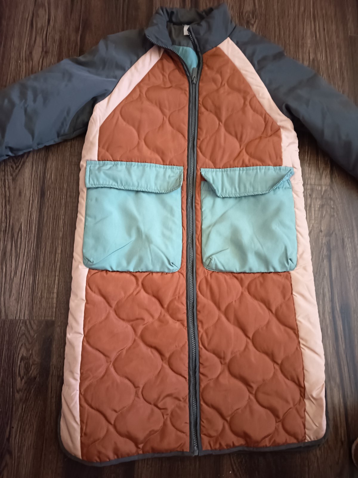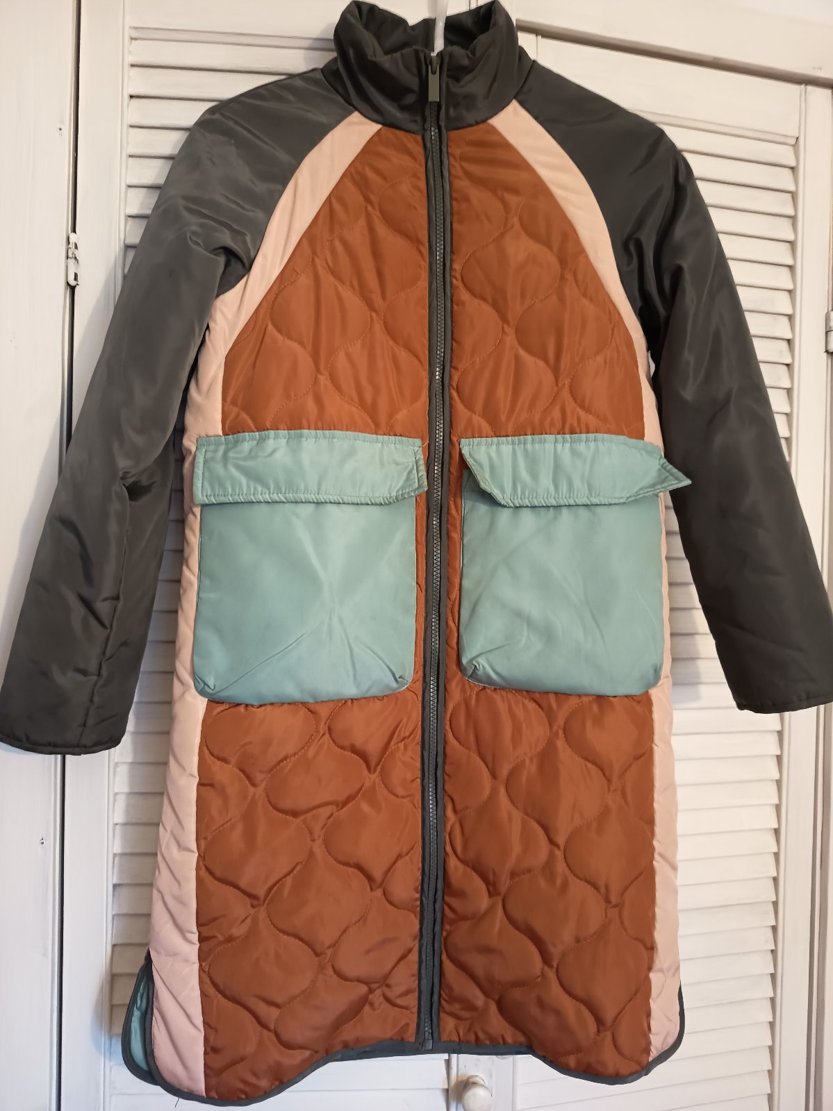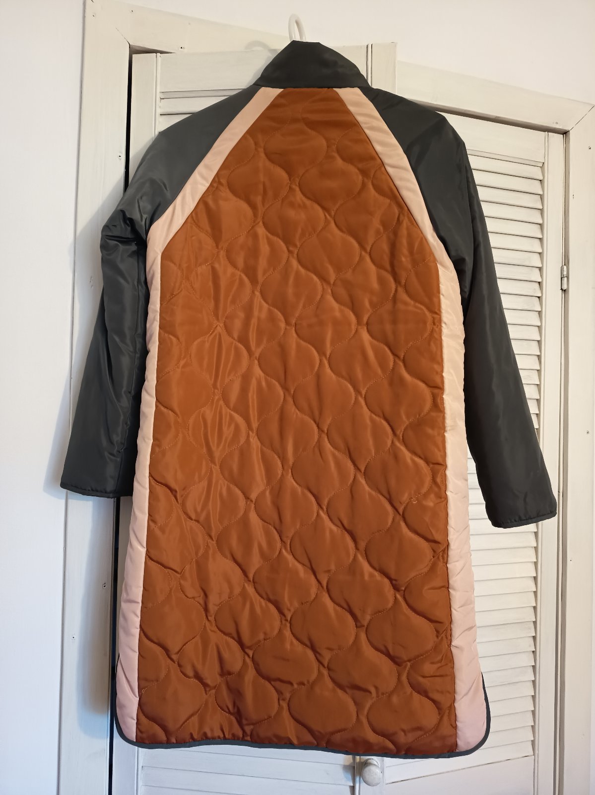 Štýlový,dlhší kabátik pod kolená.Málo nosený, v top stave.Vhodný na aj na miernejšiu zimuKrasne jesenné farby,na bokoch s miernym rozparkom.Dĺžka 87cm, šírka 46 cm.
