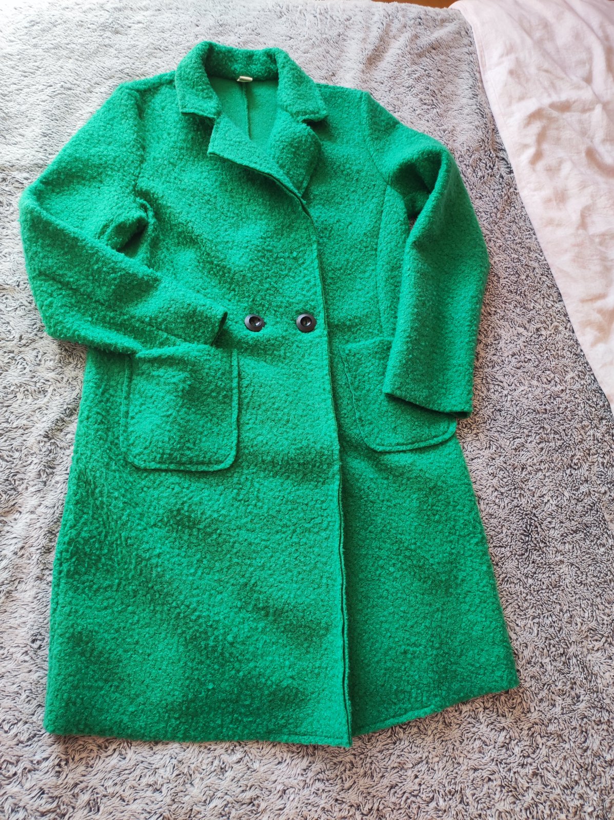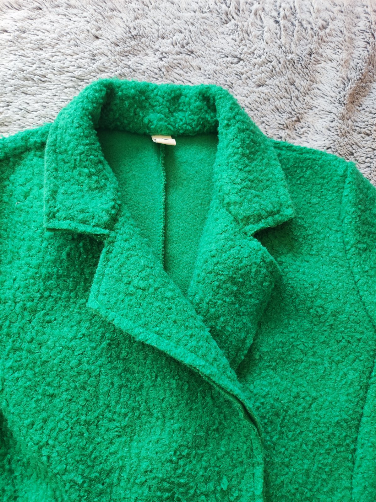 Krásny prechodný kabát v zelenej farbe, nemá podšívku, materiál pevný, "medvedík". Ideálny na teraz. Miery dodám.