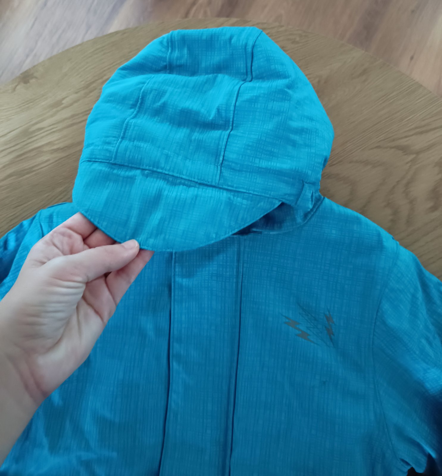 Mäkkučka, hrejivá, no lahulinka bunda. Malá dierka vpredu na tmavomodrej časti. Na aktívny pobyt vonku ešte poslúži.
