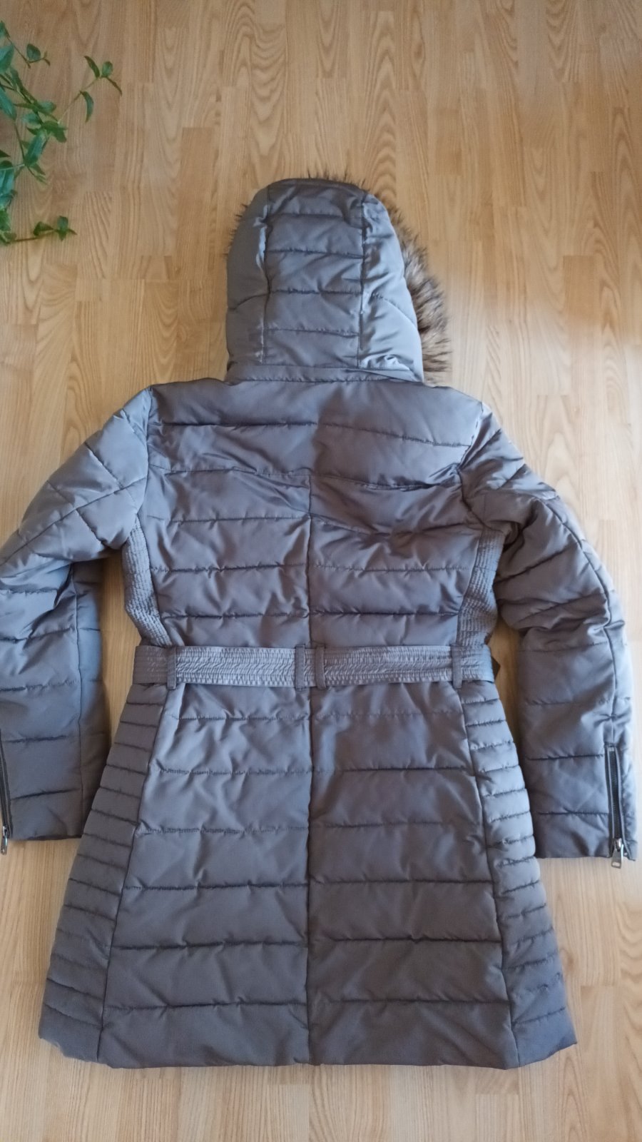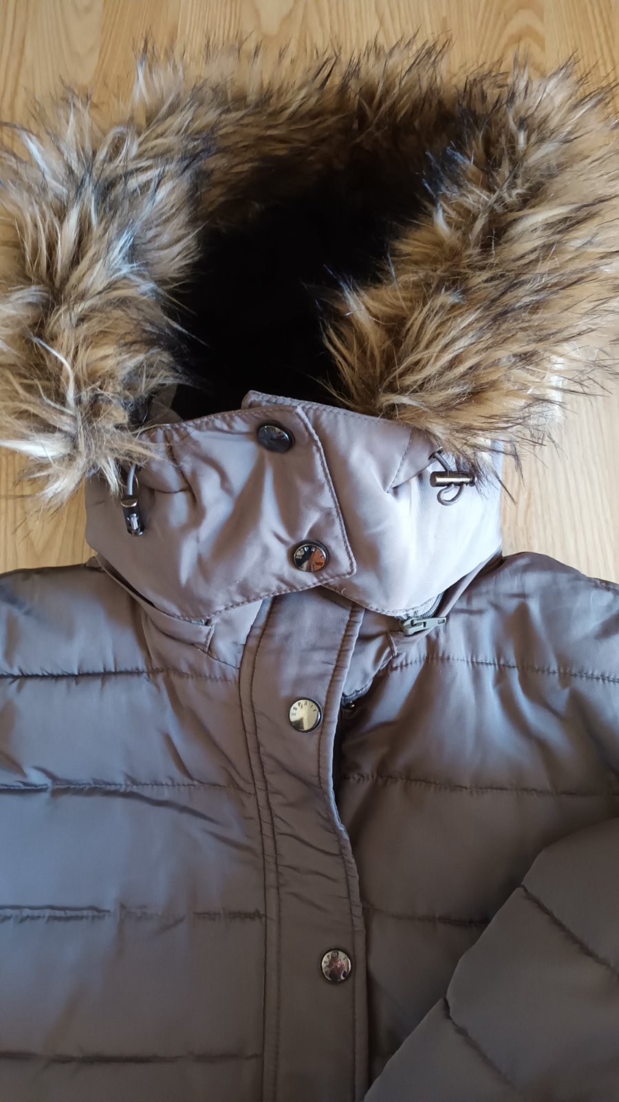 Bunda v super stave, oblečená len párkrát, ako nová, len vnútorné štítky už odstrihnuté. Kapucňa na zips, kožušina tiež odopínateľná, farba olivovozelená ako na figuríne, dĺžka 85cm, podpazušie 52cm, pás 47cm