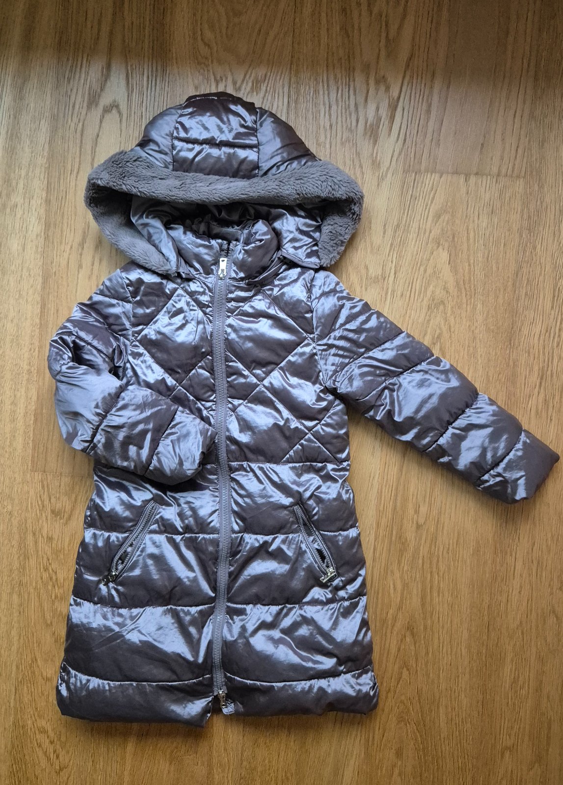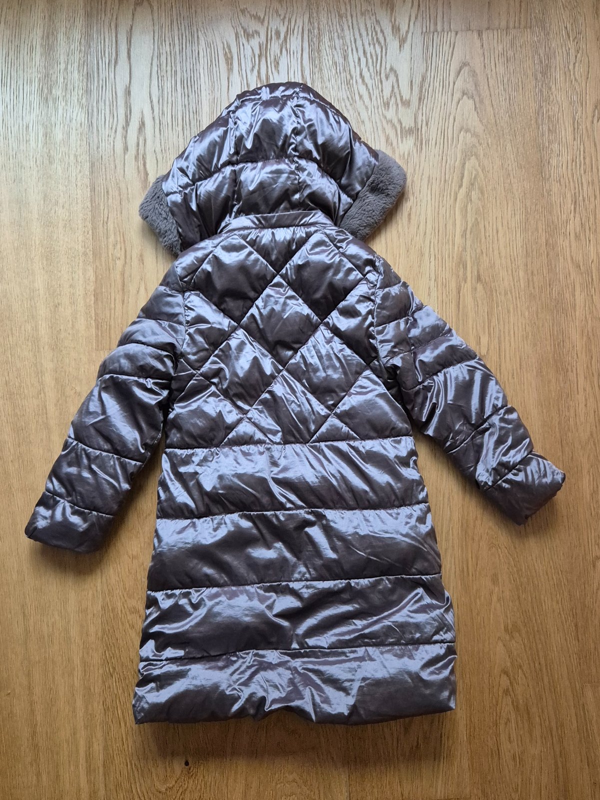 Veľmi pekná, metalická. Dĺžka 65cm, šírka 35,5 - 45cm, dĺžka rukáva 42cm. Bez poškodení. Plyšová podšívka.