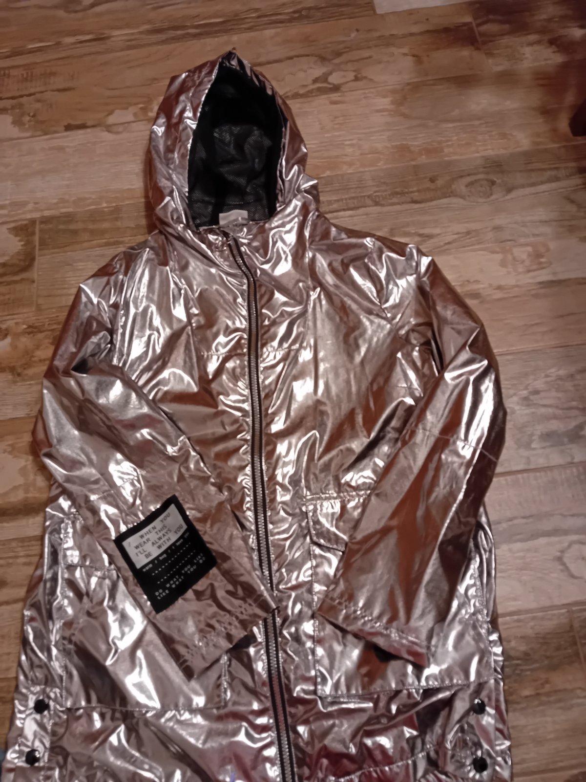 Pekná prechodná bunda, mierne vatovaná, farba krásna zlatá (nešla mi zachytiť)bez poškodenia, má trošku na patentoch žmolky