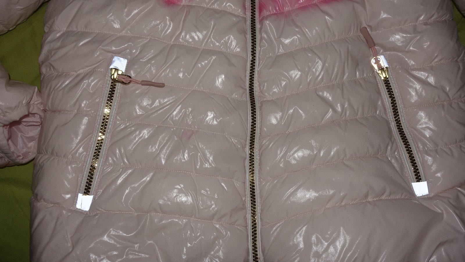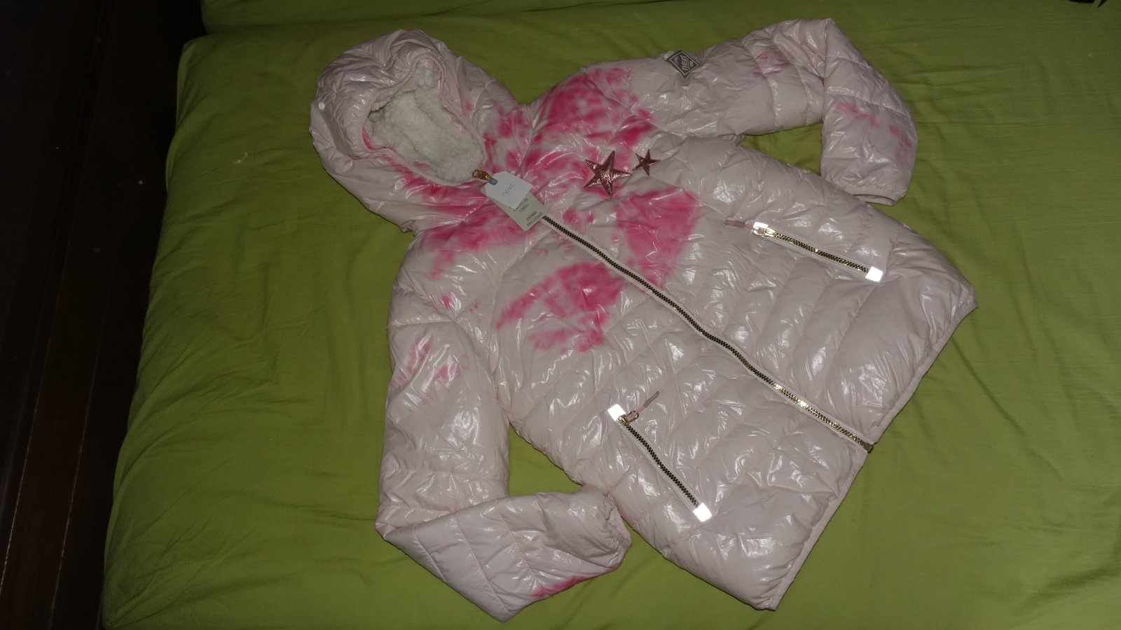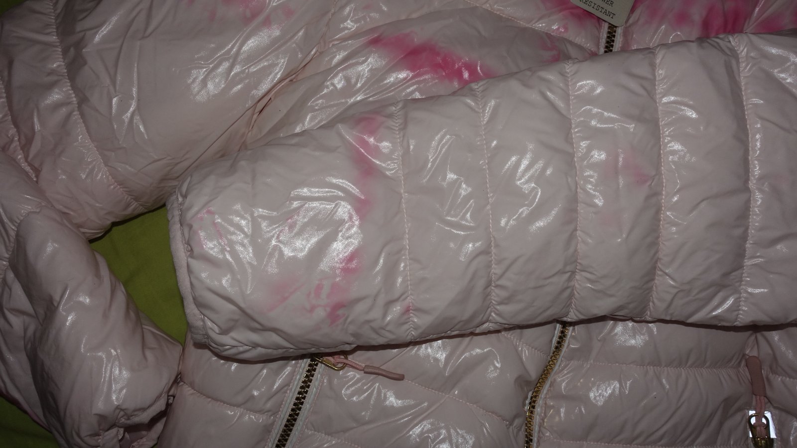 Krasna nepremokava bunda- nova, s visackami, avsak sa mi otlacila na nu farba z inej bordove bundy. Je podsita barancekom. Velksot je uvedena na 15rokov a vysku 166cm.